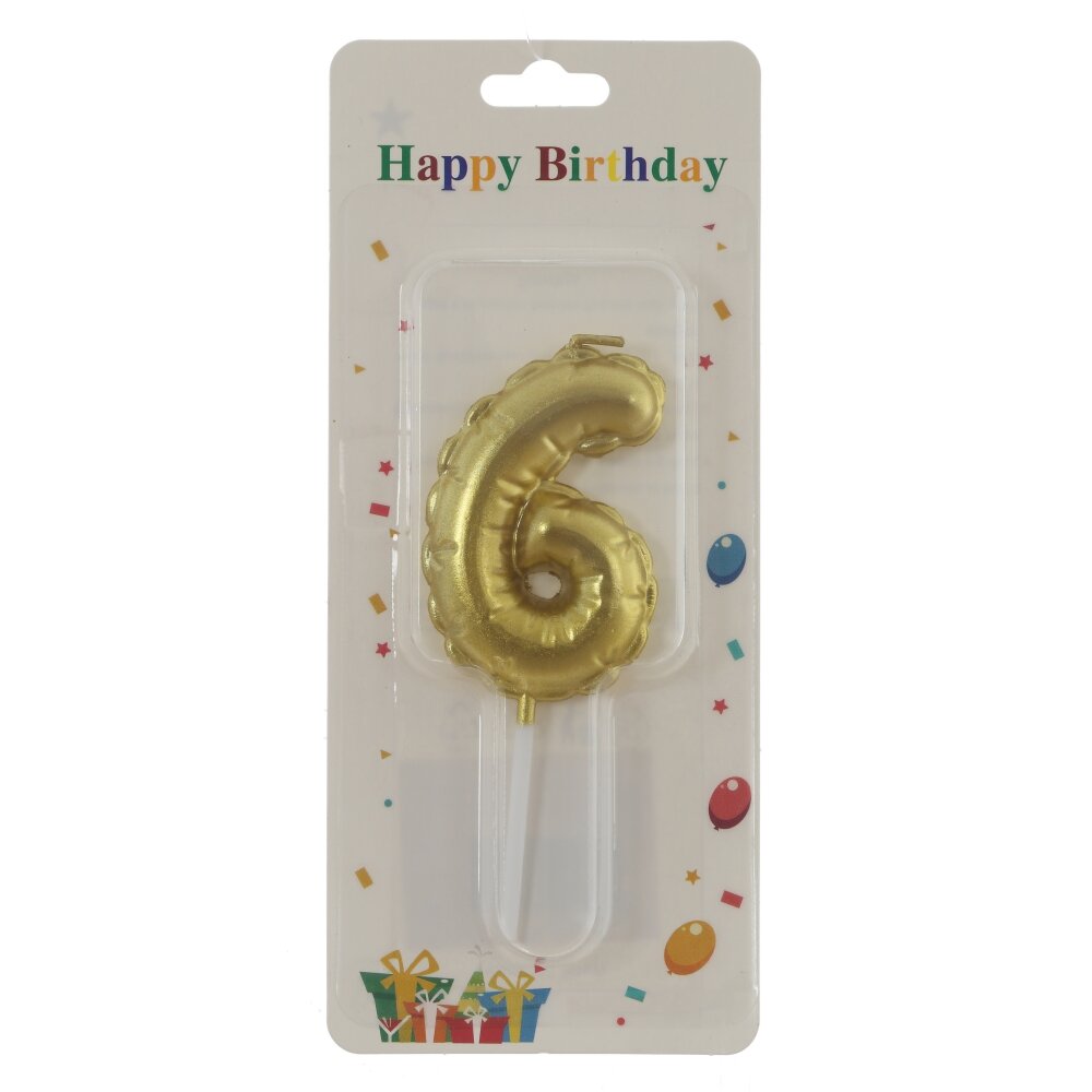 Праздничная свеча для торта «Цифра 6» из парафина в эффектном золотом цвете. Рельефная форма напоминает воздушный шар и привлекает внимание на фотографиях. Свеча закреплена на удобной прозрачной ножке, которая помогает аккуратно вставить её в бисквит или крем, а фитиль расположен сверху для лёгкого поджигания. Идеальна для дней рождения и юбилеев, легко комбинируется с другими цифрами для составления нужного возраста. Поставляется в блистерной упаковке с надписью Happy Birthday и праздничным декором — готовый вариант для оформления торта.