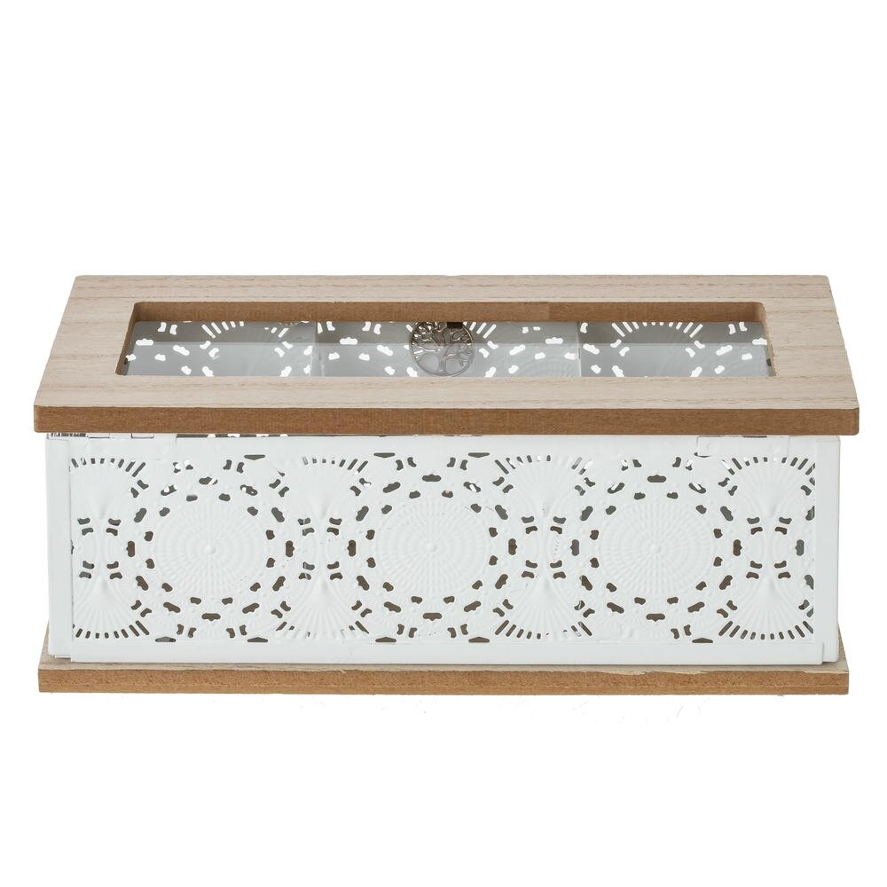 Элегантная шкатулка для чайных пакетиков, выполненная из сочетания натурального дерева, белого металла и стекла. Прозрачная крышка со стеклянной вставкой , что позволяет видеть содержимое и придаёт изделию декоративный вид. Металлические стенки с ажурной перфорацией создают лёгкий, воздушный дизайн. На передней части — металлический подвес с кисточкой, подчеркивающий утончённый стиль. Внутри предусмотрены отделения для аккуратного хранения разных сортов чая, сахара или пакетиков кофе. Такая шкатулка станет не только практичным органайзером на кухне, но и красивым акцентом сервировки чайного стола, а также приятным подарком для ценителей уютных чаепитий.