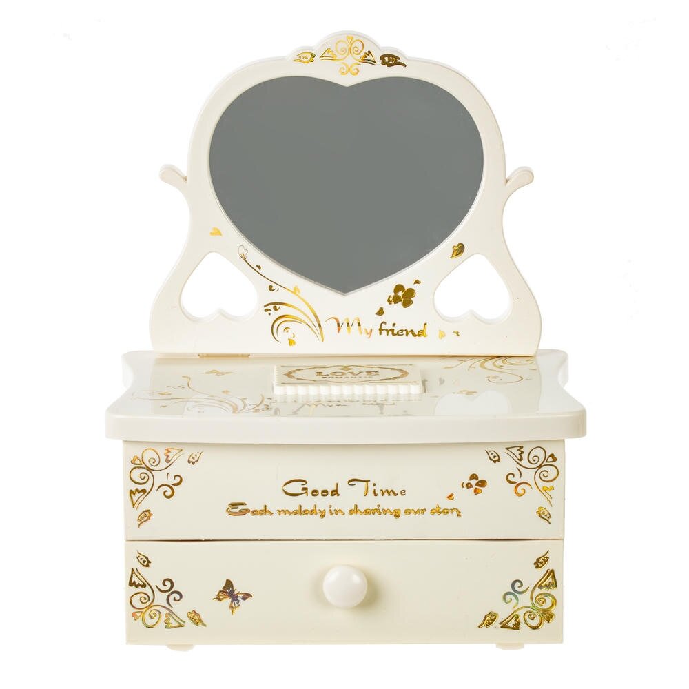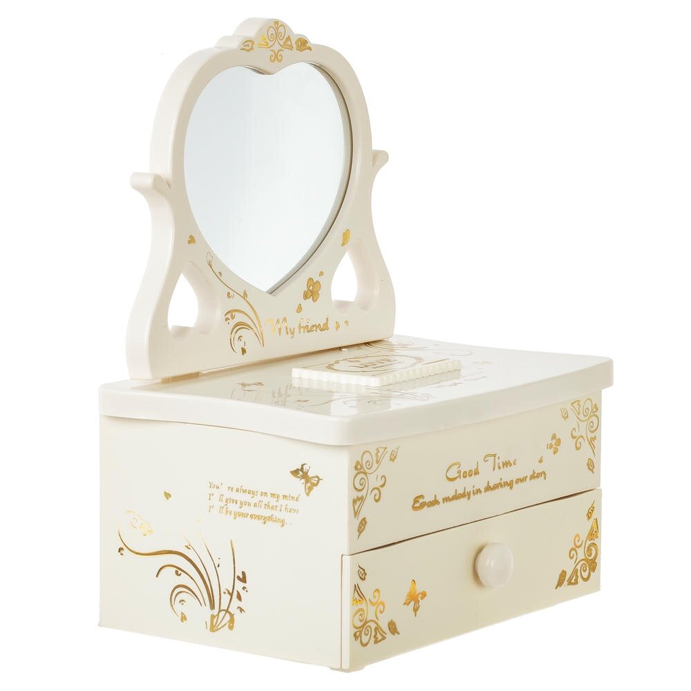 Элегантная музыкальная шкатулка для украшений из прочных полимерных материалов со стеклянным зеркалом. Корпус нежного молочного оттенка украшен золотистым орнаментом и изящной надписью Good Time. Внутри – удобные секции для колец и мелких аксессуаров, в нижней части расположен выдвижной ящичек. При заведении механизма ключом и поднятии крышки звучит мелодия, а миниатюрная балерина в розовом платье плавно вращается перед зеркалом. Шкатулка станет красивым и функциональным украшением туалетного столика и трогательным подарком для девочки или романтичной девушки.
