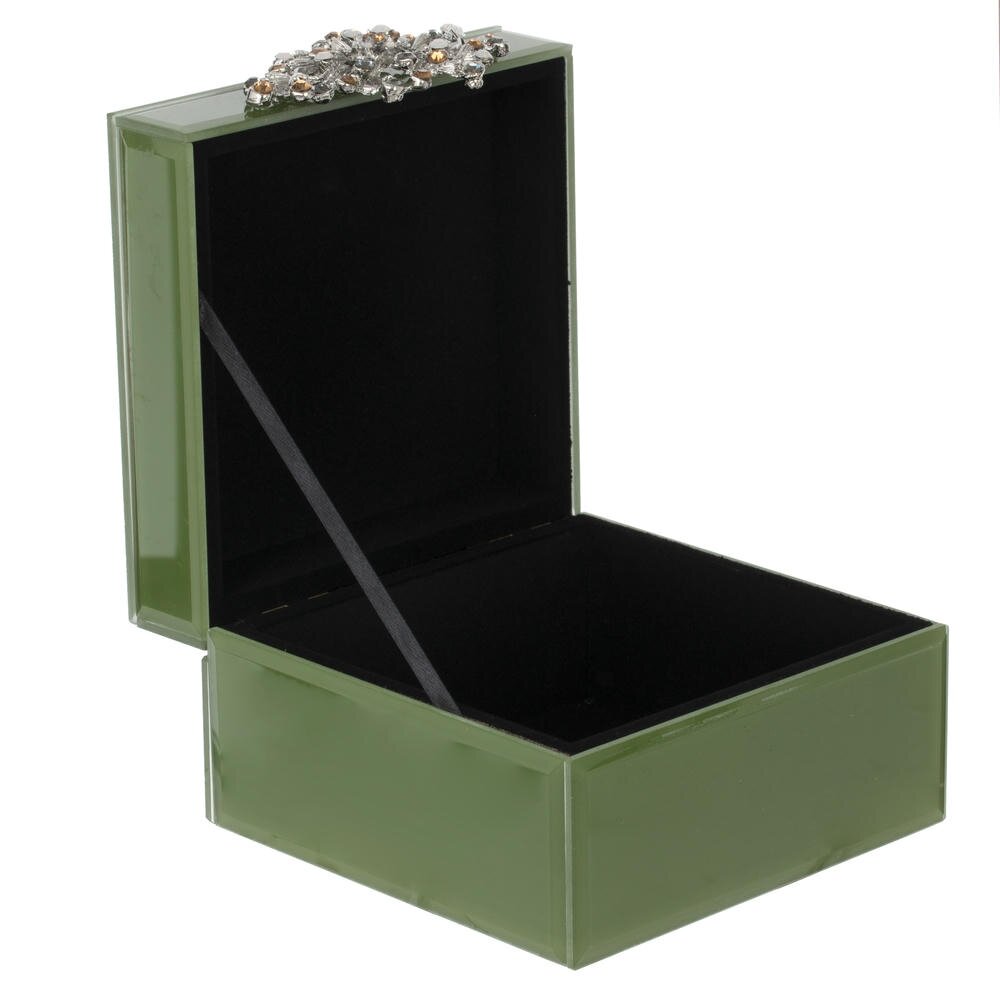 Элегантная шкатулка для украшений в современном исполнении. Корпус выполнен в благородном оливково-зеленом цвете. Крышка украшена декоративной композицией из металлических элементов и прозрачных страз, напоминающих россыпь драгоценностей. Внутренняя часть шкатулки отделана мягким чёрным материалом, который бережно защищает украшения от царапин. Удобный ограничительный ремешок не даёт крышке полностью откидываться назад. Шкатулка подойдёт для хранения колец, браслетов, цепочек и других небольших аксессуаров, станет стильным акцентом на туалетном столике и изысканным подарком для ценителей красивых вещей.