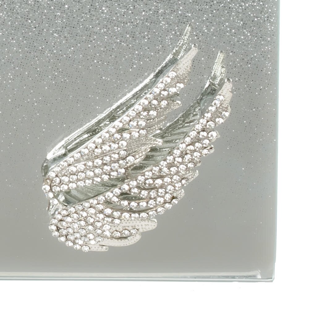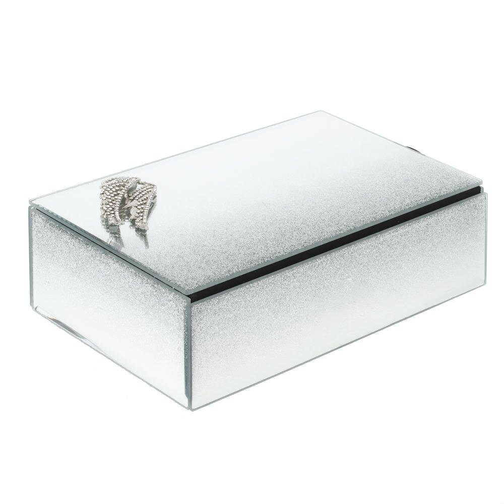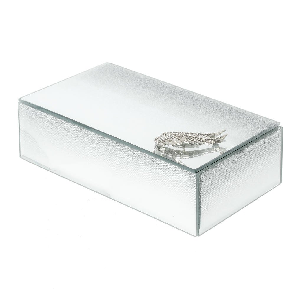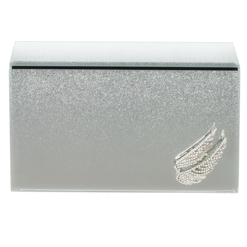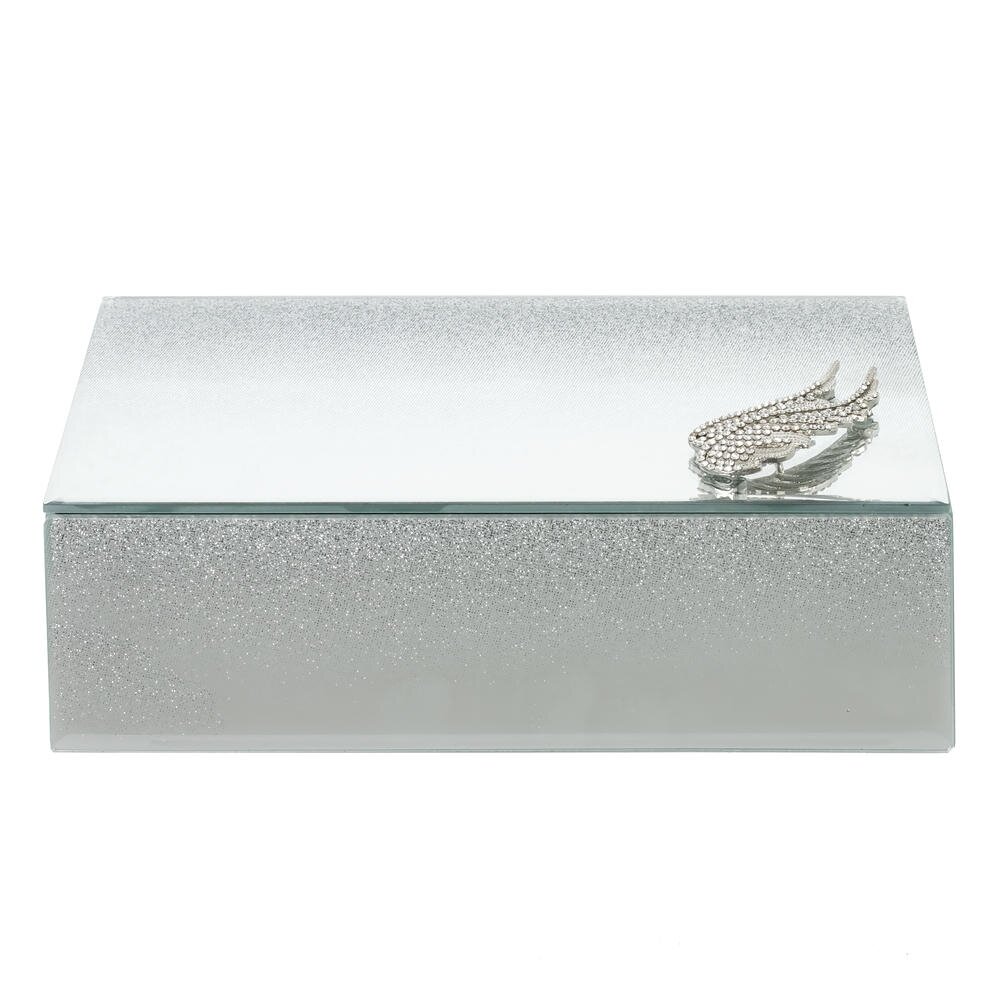 Элегантная шкатулка для украшений и мелких аксессуаров, выполненная из сочетания стекла, дерева и текстиля. Внешняя поверхность оформлена зеркальными панелями с легким мерцанием и украшена изящным декоративным элементом в виде крыла, что придаёт изделию утончённый, нарядный вид и делает его стильным акцентом интерьера. Внутреннее пространство отделано мягким бархатным текстилем, который бережно защищает украшения от царапин и повреждений. Шкатулка станет не только практичным местом для хранения, но и стильным декором туалетного столика, комода или полки в гостиной. Подойдёт в качестве изысканного подарка.