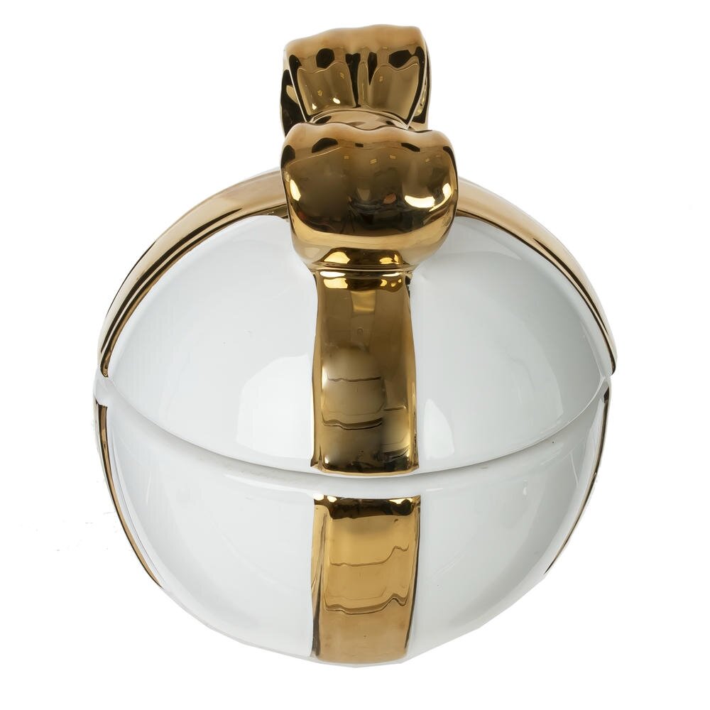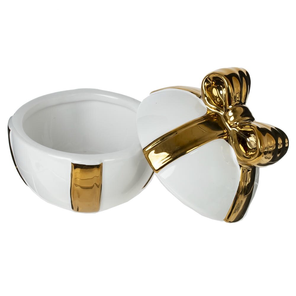 Элегантная шкатулка из фарфора в форме подарочной коробки станет стильным акцентом в интерьере и оригинальным вариантом упаковки небольшого сюрприза. Корпус выполнен в белом цвете, а рельефная «лента» и крупный бант покрыты зеркальной золотистой глазурью, создающей эффект роскоши. Внутри - место для хранения украшений, памятных мелочей или сладостей. Шкатулка украстит туалетный столик, полку в гостиной или офисный стол и подчеркнёт особый повод.
