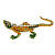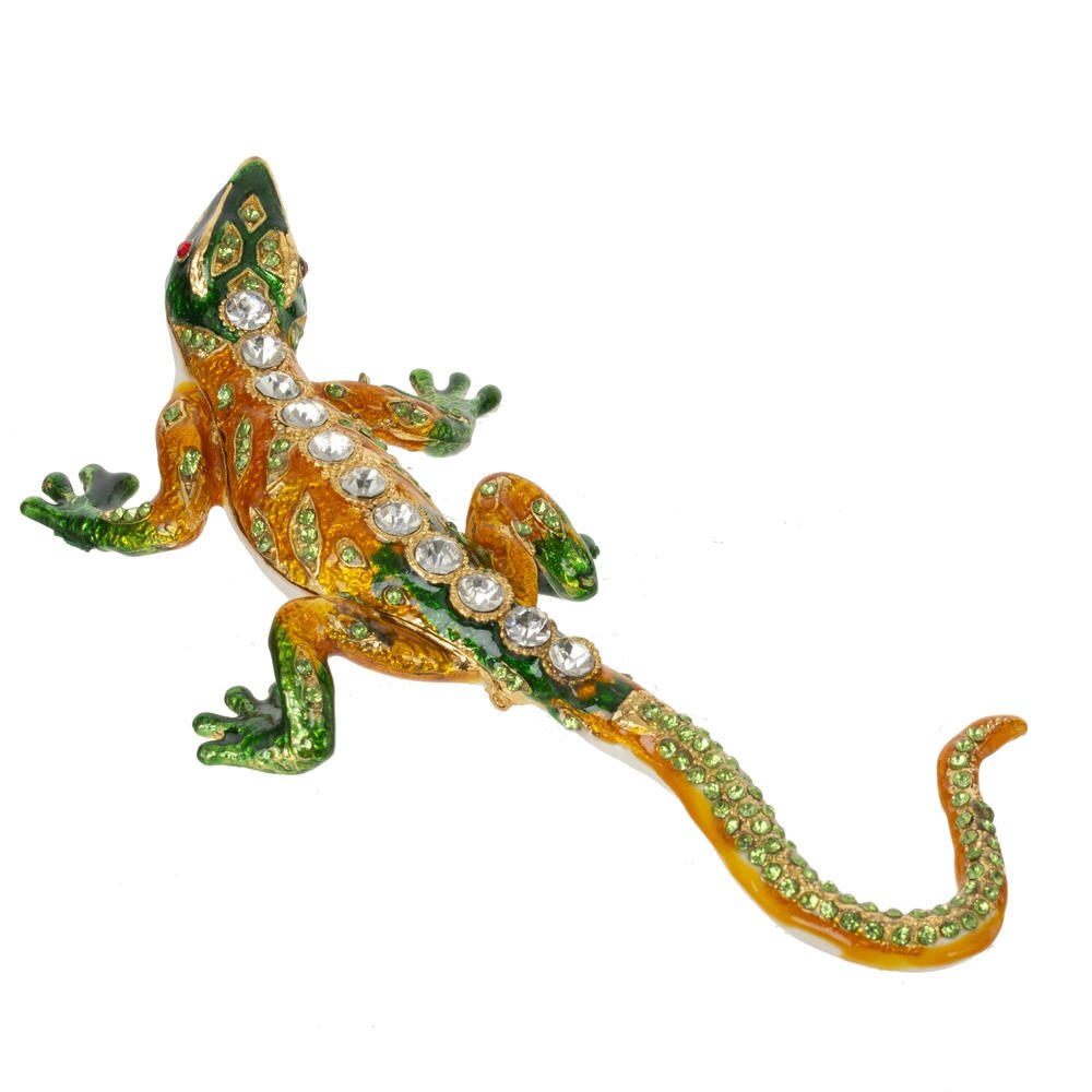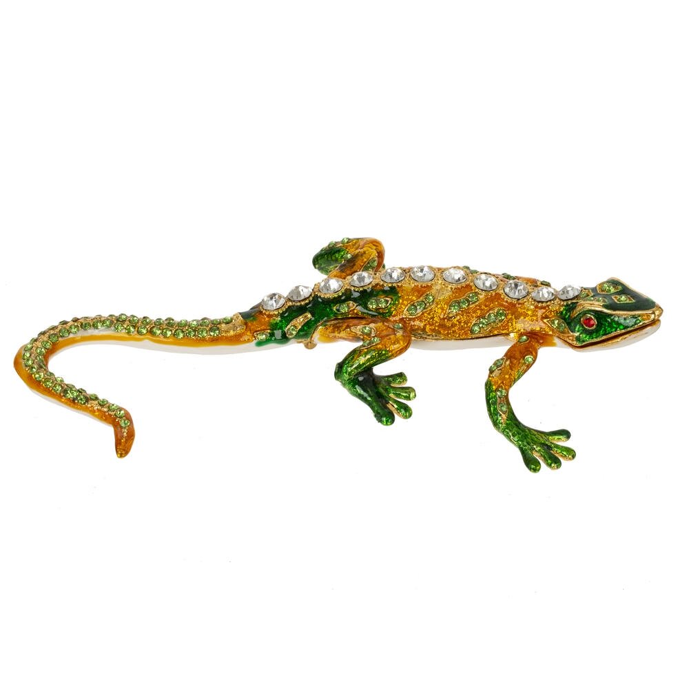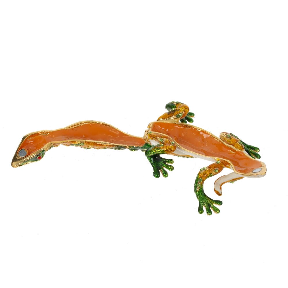 Дизайн: ящерица выполнена с удивительной детализацией — чётко прорисованы лапки, чешуя, выразительные глаза. Корпус украшен россыпью прозрачных страз, создающих эффект драгоценного покрытия.Сочетание насыщенных зелёных и золотисто-оранжевых оттенков придаёт изделию экзотичность и живость.Крышка аккуратно встроена в спинку ящерицы, открывается плавно, не нарушая общий облик изделия.