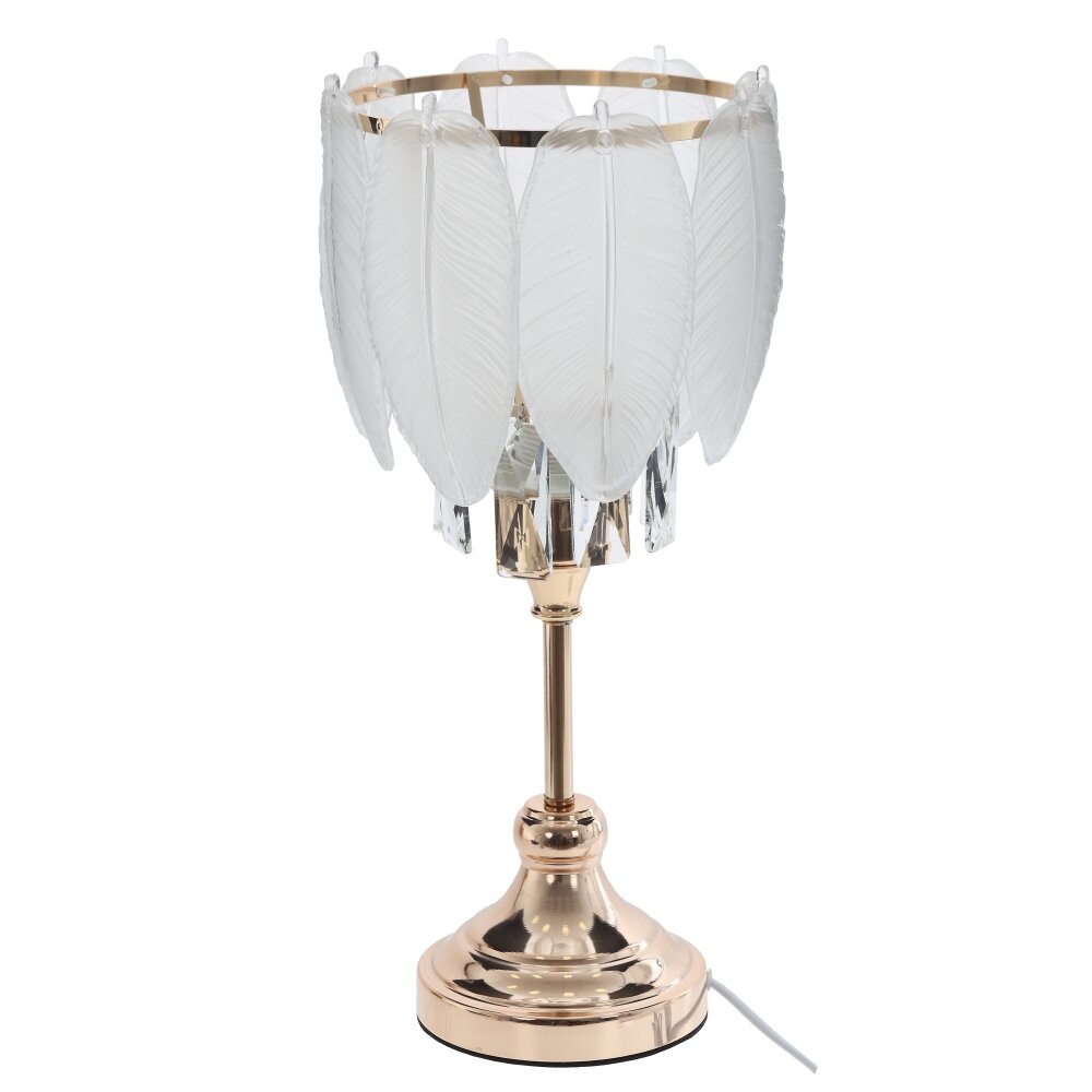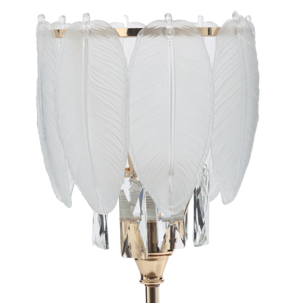 Изящный настольный светильник станет стильным акцентом в любой комнате. Основание из прочного металла с глянцевым покрытием теплого золотистого оттенка визуально напоминает классический канделябр и устойчиво стоит на поверхности. Абажур выполнен из матового и прозрачного стекла в виде декоративных подвесок?перьев, которые мягко рассеивают свет и создают причудливые блики. Дополнительные элементы из современных полимерных материалов повышают износостойкость и облегчают уход за изделием. Длина шнура 1,05 м позволяет удобно разместить светильник на тумбе, комоде или рабочем столе рядом с розеткой. Подходит для светодиодных и энергосберегающих ламп с цоколем Е27, гармонично дополняет интерьер в стиле модерн, классика, арт-деко и гламур.