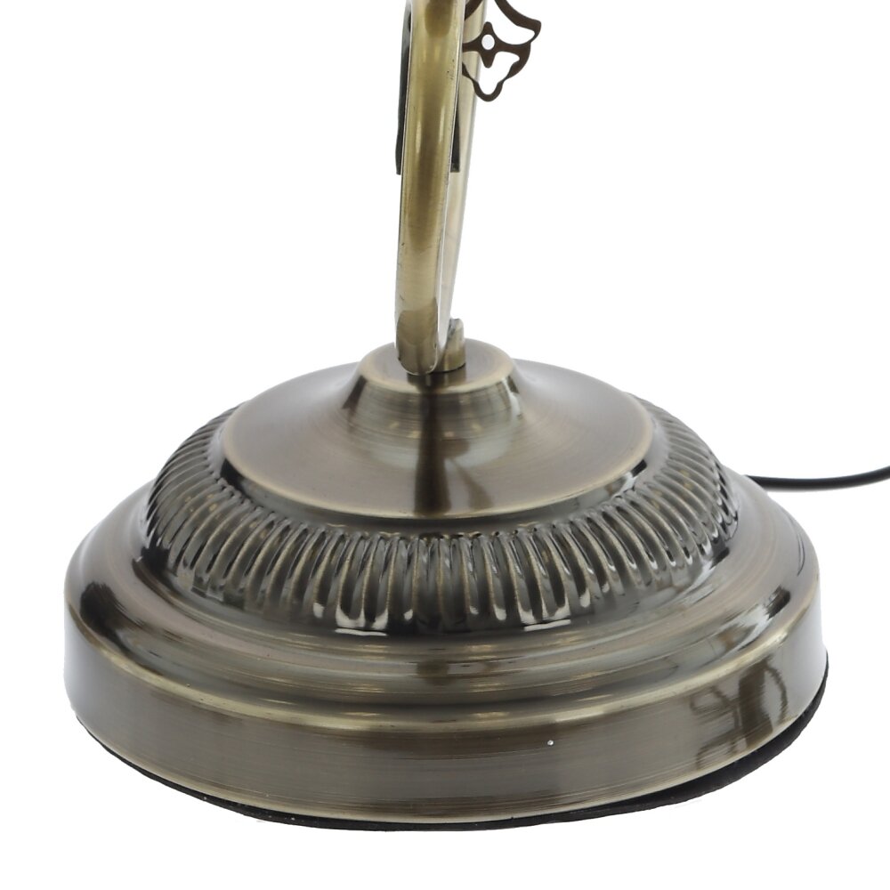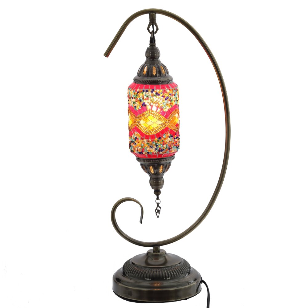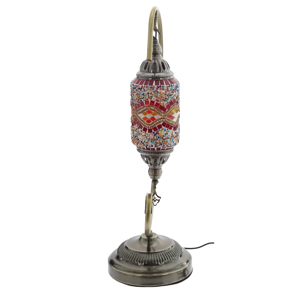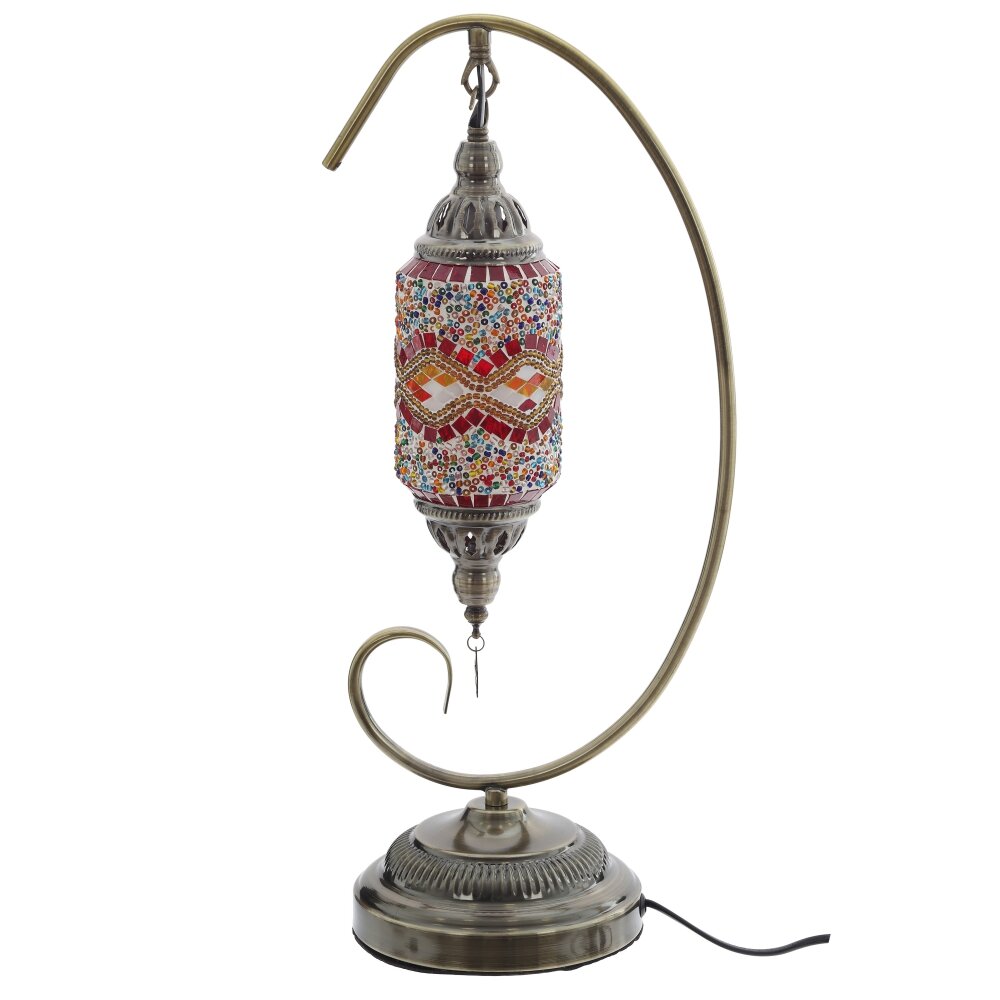 Настольный светильник в восточном стиле станет ярким акцентом любого интерьера. Открытая изогнутая стойка из прочного металла в цвете античной бронзы поддерживает подвесной плафон цилиндрической формы. Плафон выполнен из цветного стекла и полимерных материалов в технике мозаики: мелкие разноцветные элементы образуют сложный орнамент, создавая мягкое, тёплое свечение и красивые световые блики на стенах. Светильник рассчитан на лампу с цоколем Е14, длина шнура 1,12 м обеспечивает удобное подключение к розетке. Идеален для прикроватной тумбы, гостиной, зоны отдыха или в качестве подарка ценителям необычного декора.