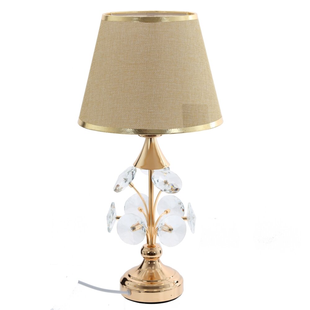 Настольный светильник – элегантное решение для спальни, гостиной или рабочего стола. Основание выполнено в глянцевом золотистом цвете и украшено декоративными прозрачными элементами, напоминающими кристаллы, что придаёт светильнику утончённый, почти ювелирный вид. Классический текстильный абажур приятного бежевого оттенка мягко рассеивает свет, создавая уютную атмосферу без резкого блика. Светильник подходит для стандартных ламп Е27 мощностью по рекомендации производителя, легко включается в любую розетку благодаря шнуру длиной 1,05 м – его удобно разместить на тумбе, комоде или письменном столе. Идеален как дополнительный источник освещения и стильный интерьерный акцент.