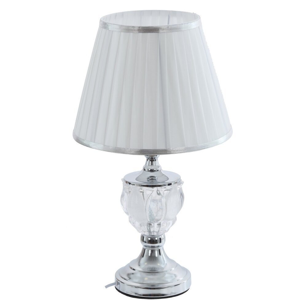 Настольный светильник – элегантное решение для спальни, гостиной или рабочего стола. Классический белый абажур с мягкими вертикальными складками равномерно рассеивает свет, создавая уютную атмосферу без резких бликов. Основание выполнено в сочетании прозрачного декоративного элемента и хромированной поверхности, что придает модели изысканный, почти кристальный блеск и делает её акцентом любого интерьера. Светильник подходит для стандартных ламп Е27 . Удобный шнур длиной 0,95 м позволяет легко разместить прибор на прикроватной тумбе, консоли или письменном столе, не ограничивая свободу расстановки мебели.