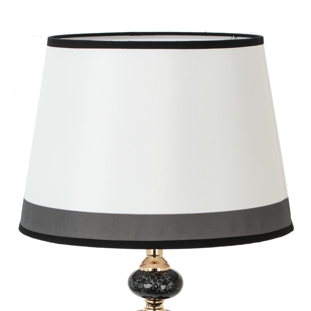 Элегантный настольный светильник станет стильным акцентом в любом интерьере. Белый абажур конической формы с контрастной тёмной окантовкой мягко рассеивает свет, создавая уютную атмосферу в гостиной, спальне или кабинете. Основание выполнено в сочетании чёрного глянцевого элемента и благородного золотистого металла, что придаёт модели современный классический вид. Светильник совместим с большинством светодиодных и энергосберегающих ламп с цоколем Е27, что позволяет подобрать комфортную яркость и температуру света. Удобный шнур длиной 1,06 м обеспечивает простое подключение к сети и даёт свободу в выборе места установки. Отличное решение для зон отдыха, чтения и дополнительного декоративного освещения.