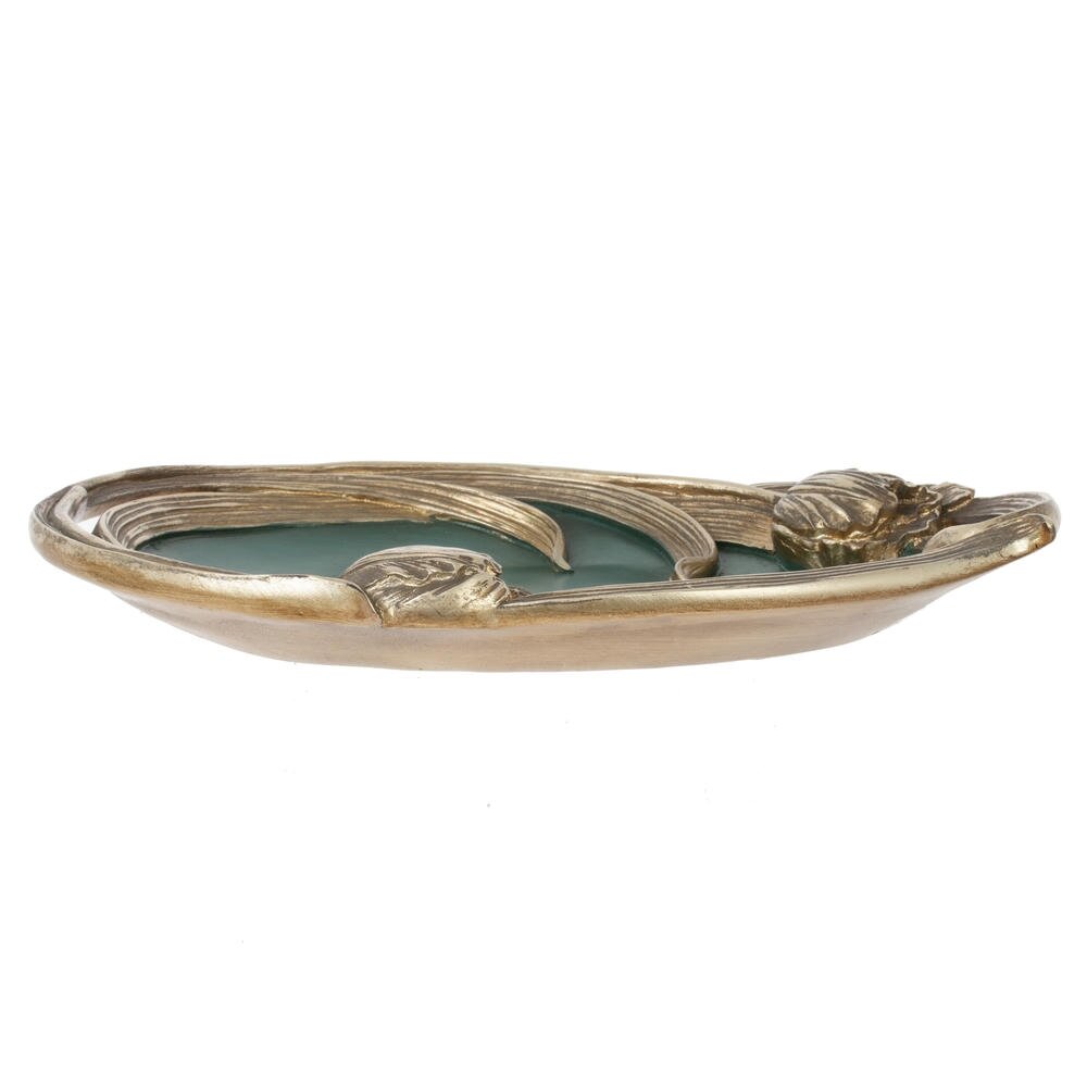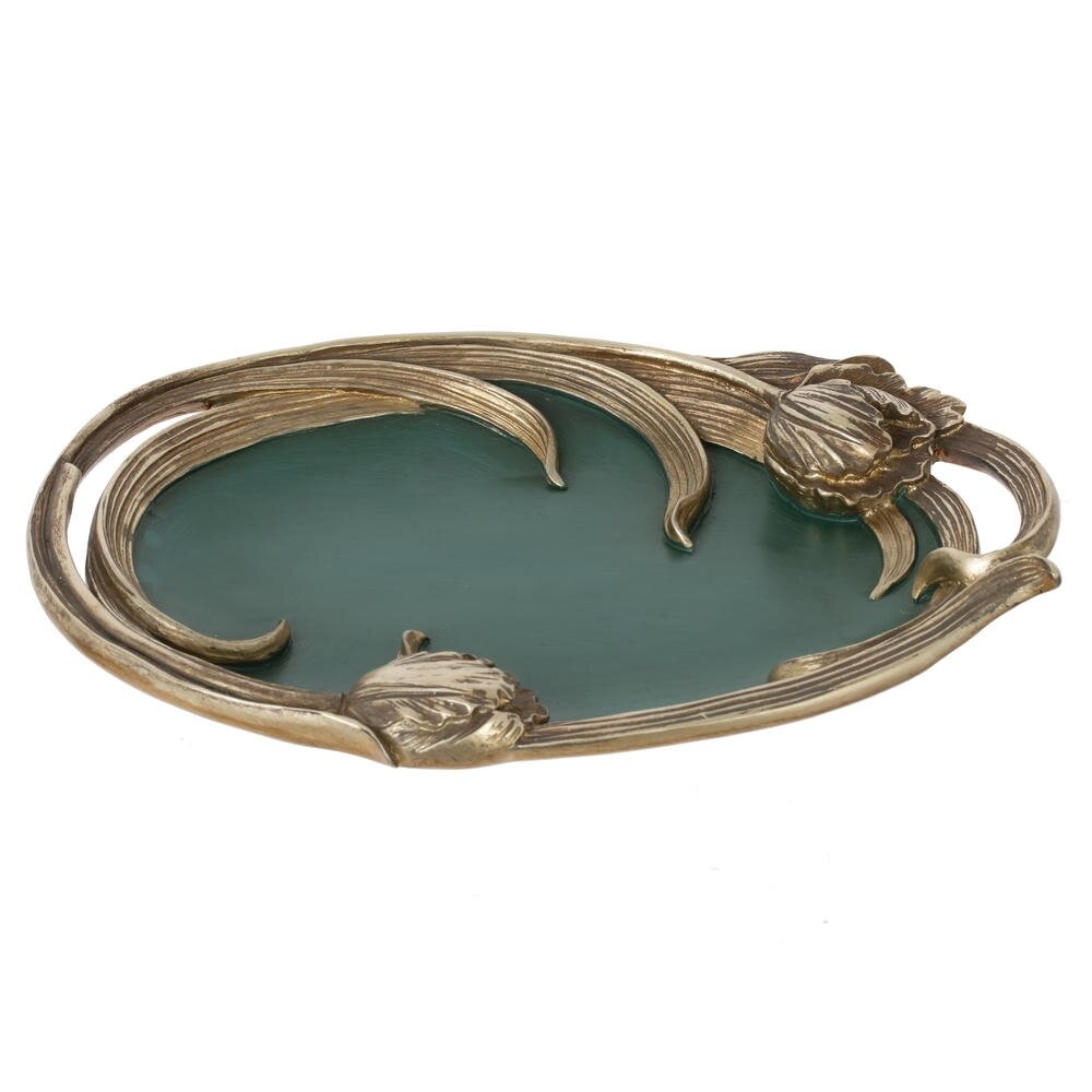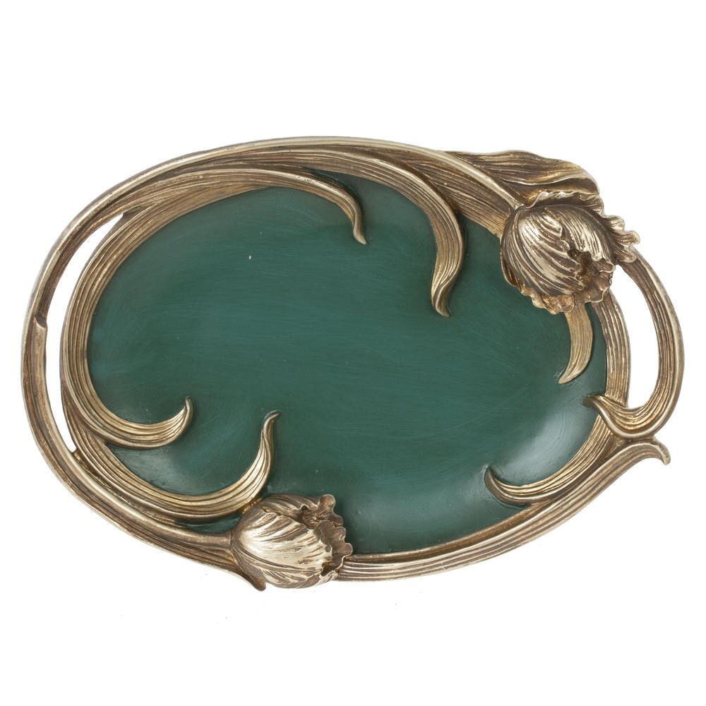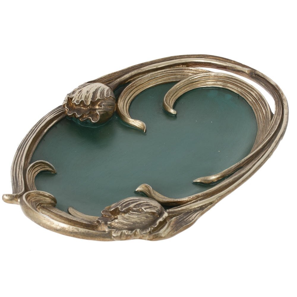 Элегантное декоративное блюдо из полимерных материалов, выполненное в изысканном стиле модерн. Овальная форма дополнена плавными “растительными” линиями по краю и объемными бутонами, стилизованными под резной металл с благородным золотистым оттенком. Гладкая матовая поверхность насыщенного зеленого цвета красиво контрастирует с рамкой и подчеркивает изящество композиции. Блюдо станет эффектным акцентом в гостиной, спальне или прихожей: на нем удобно размещать бижутерию, ключи, мелкие аксессуары, ароматические свечи или конфеты. Легкий и прочный полимер прост в уходе, не боится влаги и надолго сохраняет безупречный внешний вид. Идеальный вариант для подарка и украшения интерьера.
