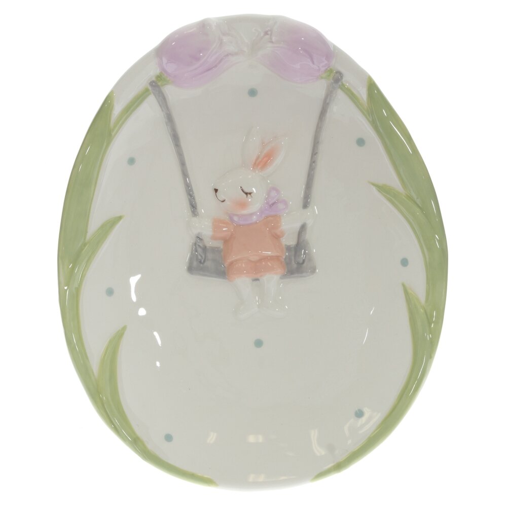 Нежное пасхальное блюдо из качественной керамики с объёмным декоративным рисунком. В центре тарелки – милый зайчонок на качелях под двумя крупными лиловыми цветами, по краю – рельефные зелёные листья и аккуратные голубые точечки. Пастельные тона и глянцевая глазурь создают ощущение лёгкости и весеннего настроения. Блюдо идеально подойдёт для сервировки пасхальных яиц, куличей, печенья, конфет или небольших десертов, станет ярким акцентом праздничного стола и очаровательным подарком к Пасхе для родных и друзей. Легко моется, украшает интерьер даже без наполнения.