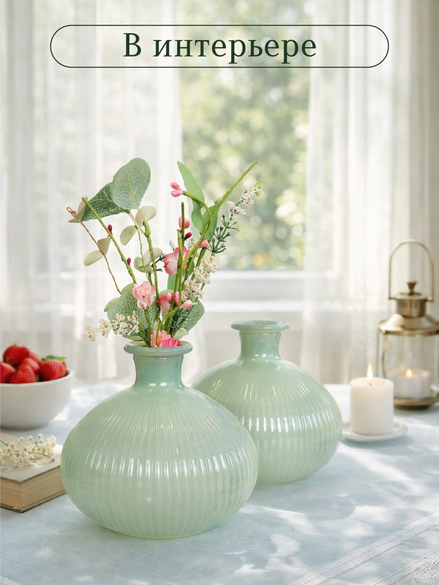 Миниатюрная ваза объемом 885 мл, диаметром 14 см и высотой 12,5 см, выполнена из прозрачного стекла с цветным напылением зеленого оттенка. Вазочка имеет рельефную поверхность приятную на ощупь, диаметр горлышка 2,5 см. Эта удивительная вазочка из стекла притягивает взгляд своей оригинальной формой и изящным дизайном. Размеры изделия позволяют использовать её как самостоятельный декоративный элемент или для размещения не крупных цветов и миниатюрных букетов. Эта ваза станет не только функциональным предметом, но и настоящим украшением интерьера, которое обязательно привлечет восхищённые взгляды гостей и обитателей дома. Вазочку можно использовать как элемент декорации стилизированной фото-зоны или как основу для творческих идей. Стеклянная ваза это отличный подарок на праздник или просто без повода, для Вас, Ваших близких и друзей. Благодаря лаконичному дизайну и форме, ваза легко впишется в любой интерьерный стиль. Эта ваза станет прекрасным дополнением к любому интерьеру, будь то классический или современный стиль. Она гармонично будет смотреться как в гостиной, так и в спальне, на кухне или в прихожей. Такая ваза идеально подойдёт для создания уютной атмосферы в вашем доме или офисе. Она будет радовать вас своей красотой и элегантностью каждый день.