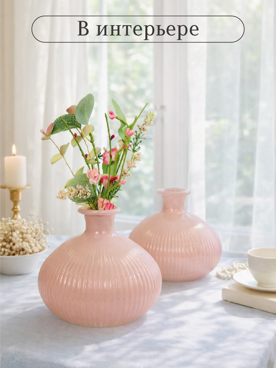 Миниатюрная ваза объемом 885 мл, диаметром 14 см и высотой 12,5 см, выполнена из прозрачного стекла с цветным напылением розового оттенка. Вазочка имеет рельефную поверхность приятную на ощупь, диаметр горлышка 2,5 см. Эта удивительная вазочка из стекла притягивает взгляд своей оригинальной формой и изящным дизайном. Размеры изделия позволяют использовать её как самостоятельный декоративный элемент или для размещения не крупных цветов и миниатюрных букетов. Эта ваза станет не только функциональным предметом, но и настоящим украшением интерьера, которое обязательно привлечет восхищённые взгляды гостей и обитателей дома. Вазочку можно использовать как элемент декорации стилизированной фото-зоны или как основу для творческих идей. Стеклянная ваза это отличный подарок на праздник или просто без повода, для Вас, Ваших близких и друзей. Благодаря лаконичному дизайну и форме, ваза легко впишется в любой интерьерный стиль. Эта ваза станет прекрасным дополнением к любому интерьеру, будь то классический или современный стиль. Она гармонично будет смотреться как в гостиной, так и в спальне, на кухне или в прихожей. Такая ваза идеально подойдёт для создания уютной атмосферы в вашем доме или офисе. Она будет радовать вас своей красотой и элегантностью каждый день.