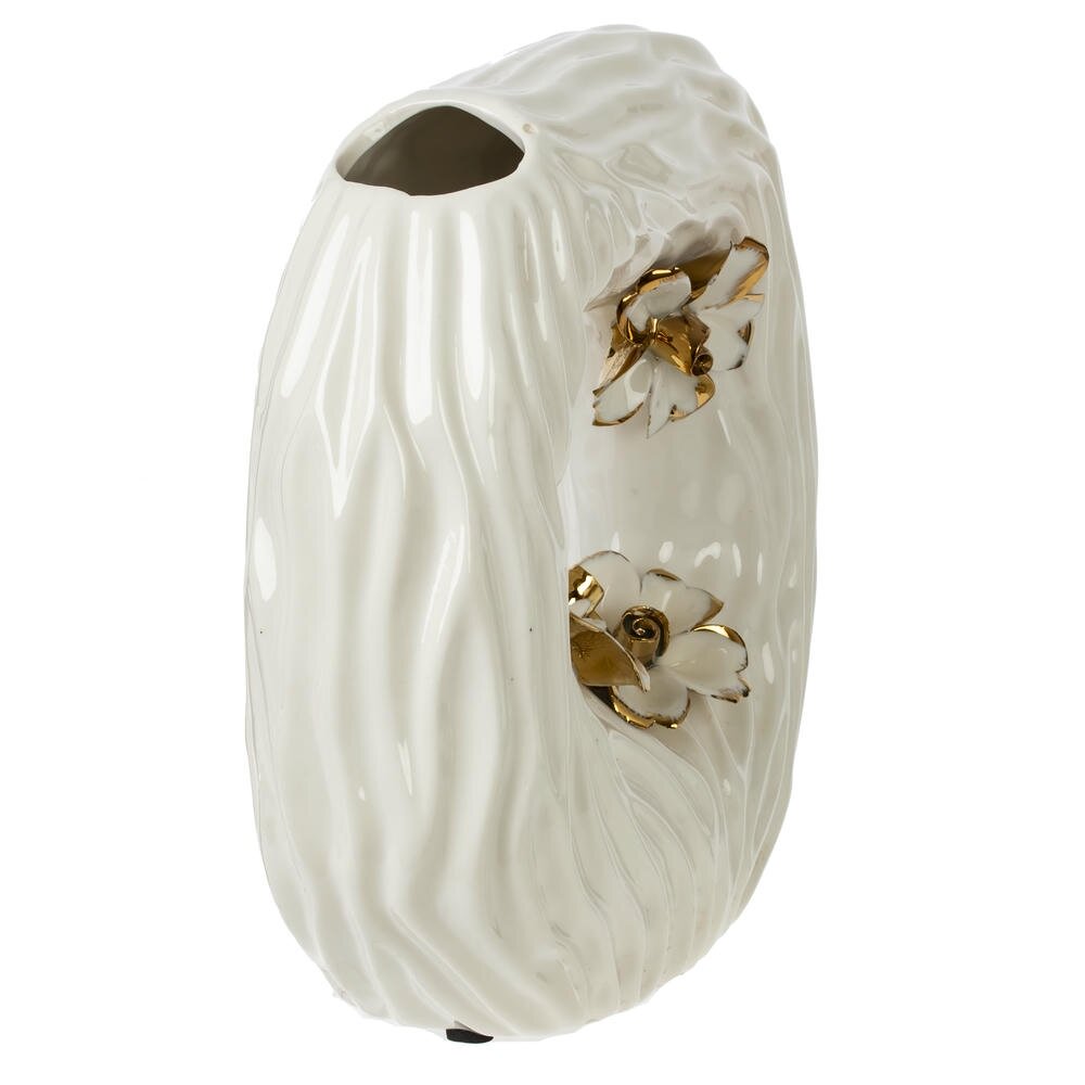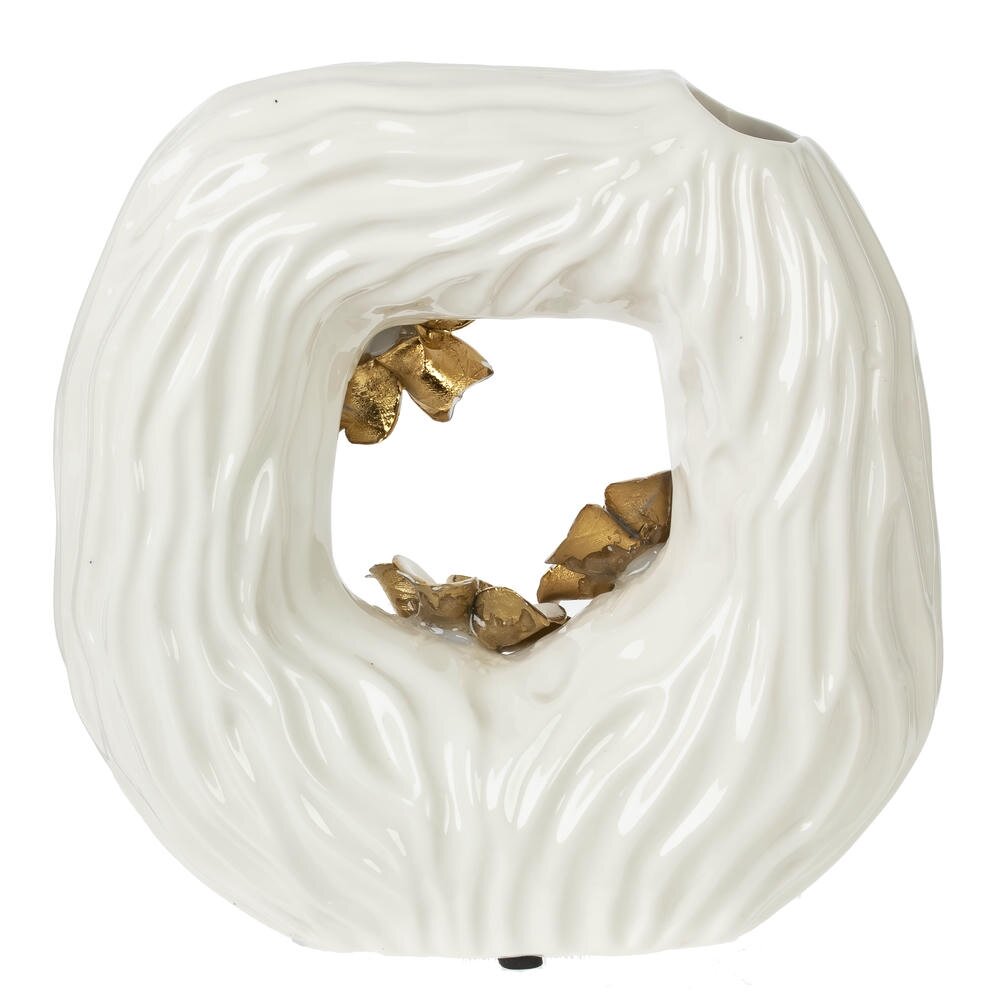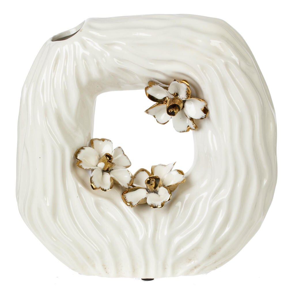 Элегантная декоративная ваза объёмом 1100 мл из высококачественного фарфора станет выразительным акцентом в любом интерьере. Оригинальная форма в виде полого кольца с квадратным вырезом в центре и мягким волнистым рельефом придаёт изделию современный, но одновременно изящный вид. Глянцевая белая глазурь красиво отражает свет и подчёркивает плавные линии. Фронтальная часть украшена объёмными цветами с аккуратными лепестками и изысканными золотистыми акцентами по краям, что добавляет композиции утончённости и легкого блеска. Узкое отверстие сверху удобно для расстановки отдельных бутонов или небольших композиций из сухоцветов. Ваза гармонично дополнит гостиную, спальню или интерьер кафе, подойдёт в качестве оригинального подарка на любое торжество. Размер горловины: 3*4 см.