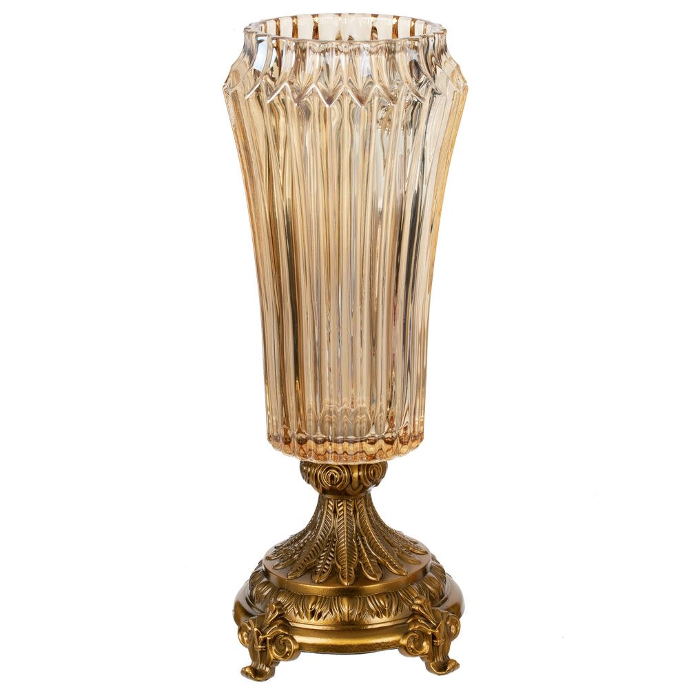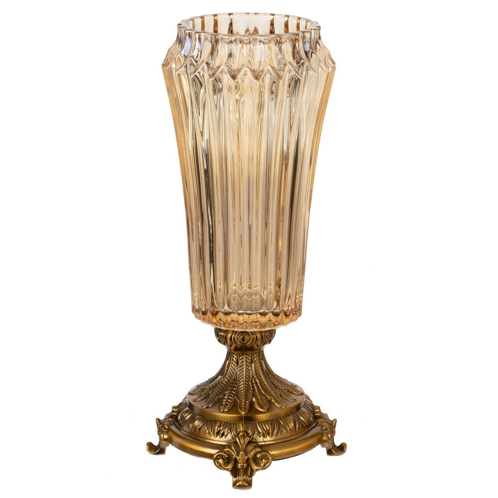 Элегантная ваза объёмом 1150 мл станет выразительным акцентом в интерьере гостиной, спальни или кабинета. Прозрачное стекло с лёгким янтарным оттенком оформлено вертикальными ребрами, которые красиво преломляют свет и подчёркивают форму букета. Основание выполнено из металла с благородным золотистым покрытием и изысканным рельефным декором в классическом стиле. Конструкция сочетает в себе устойчивость и декоративность, что позволяет смело использовать вазу как для живых, так и для искусственных цветов. Подойдёт для украшения праздничного стола, каминной полки или консоли, гармонично вписываясь как в классический, так и в современный интерьер с элементами роскоши. Диаметр горловины: 9.5 см.