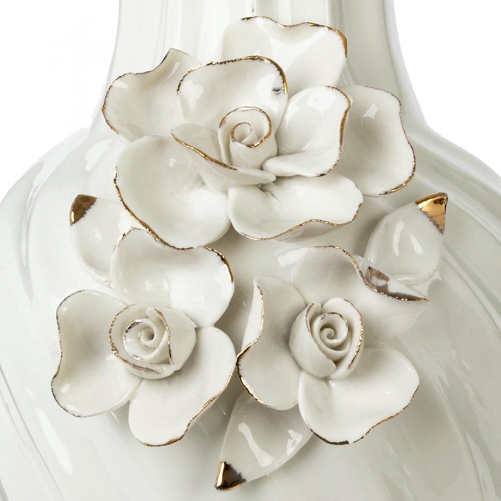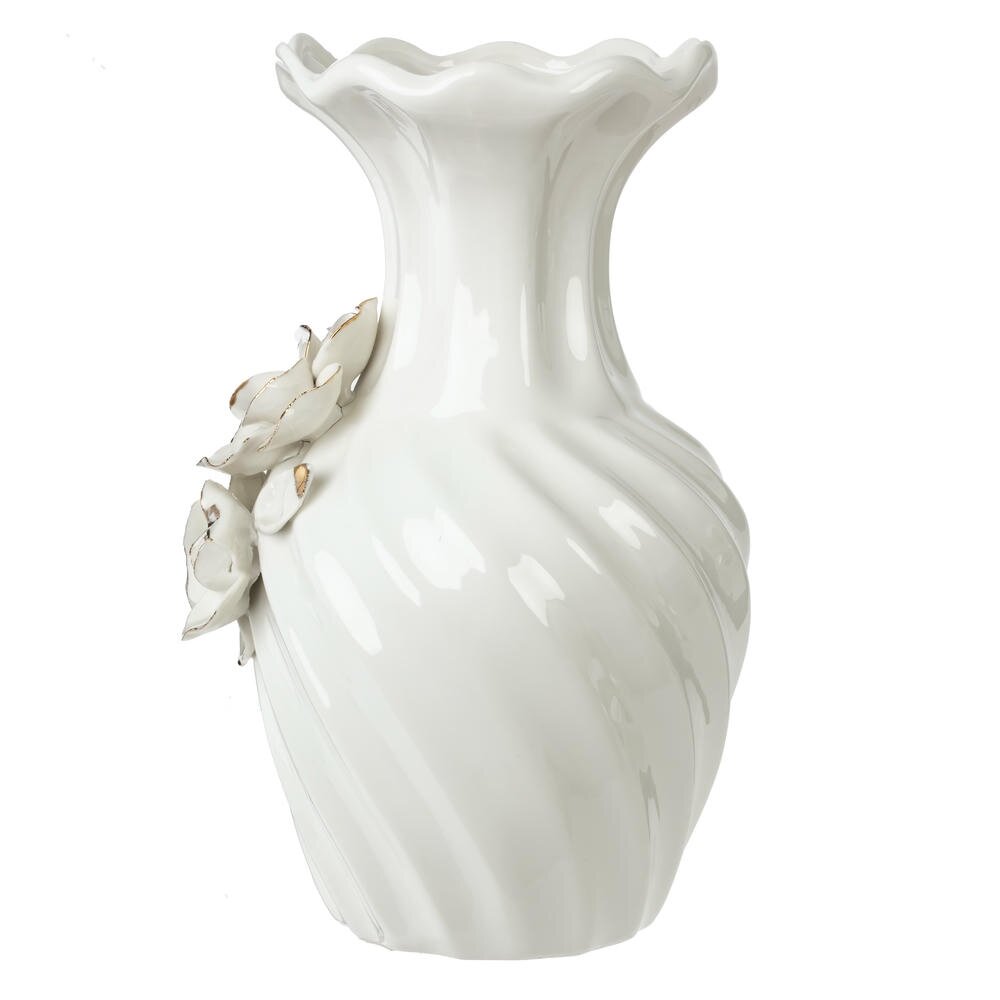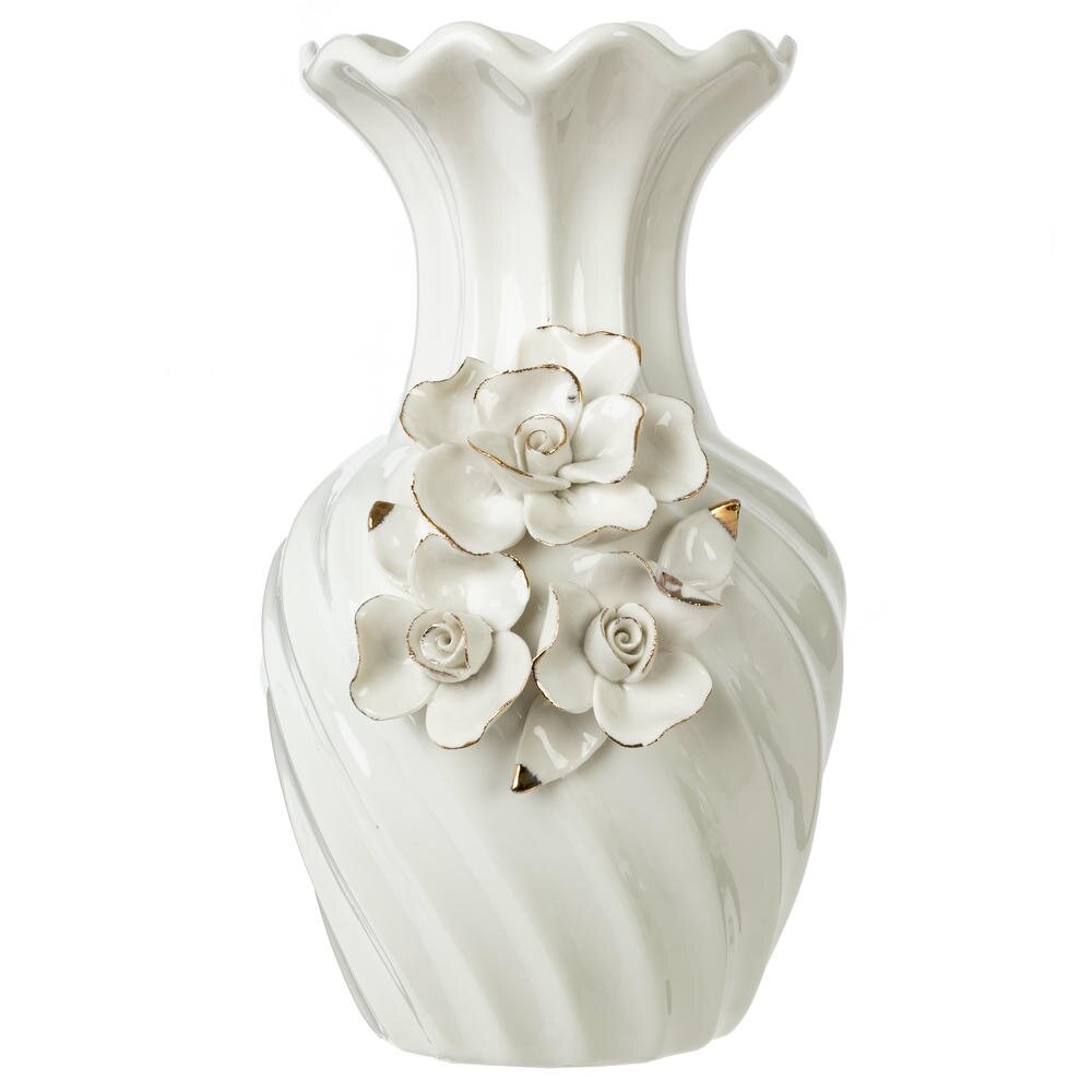 Элегантная фарфоровая ваза объёмом 1500 мл станет изысканным акцентом вашего интерьера. Изделие выполнено из гладкого белого фарфора с мягким глянцевым блеском и украшено объёмными цветами-розами, аккуратно выделенными золотистым контуром по краям лепестков. Корпус вазы имеет плавный спиралевидный рельеф, а широко раскрытое горлышко обеспечивает удобное размещение как пышных букетов, так и одиночных цветочных композиций. Такая ваза гармонично впишется в классический, романтический или современный стиль, украсит гостиную, спальню или столовую и станет прекрасным подарком к любому празднику. Диаметр горловины: 5 см.