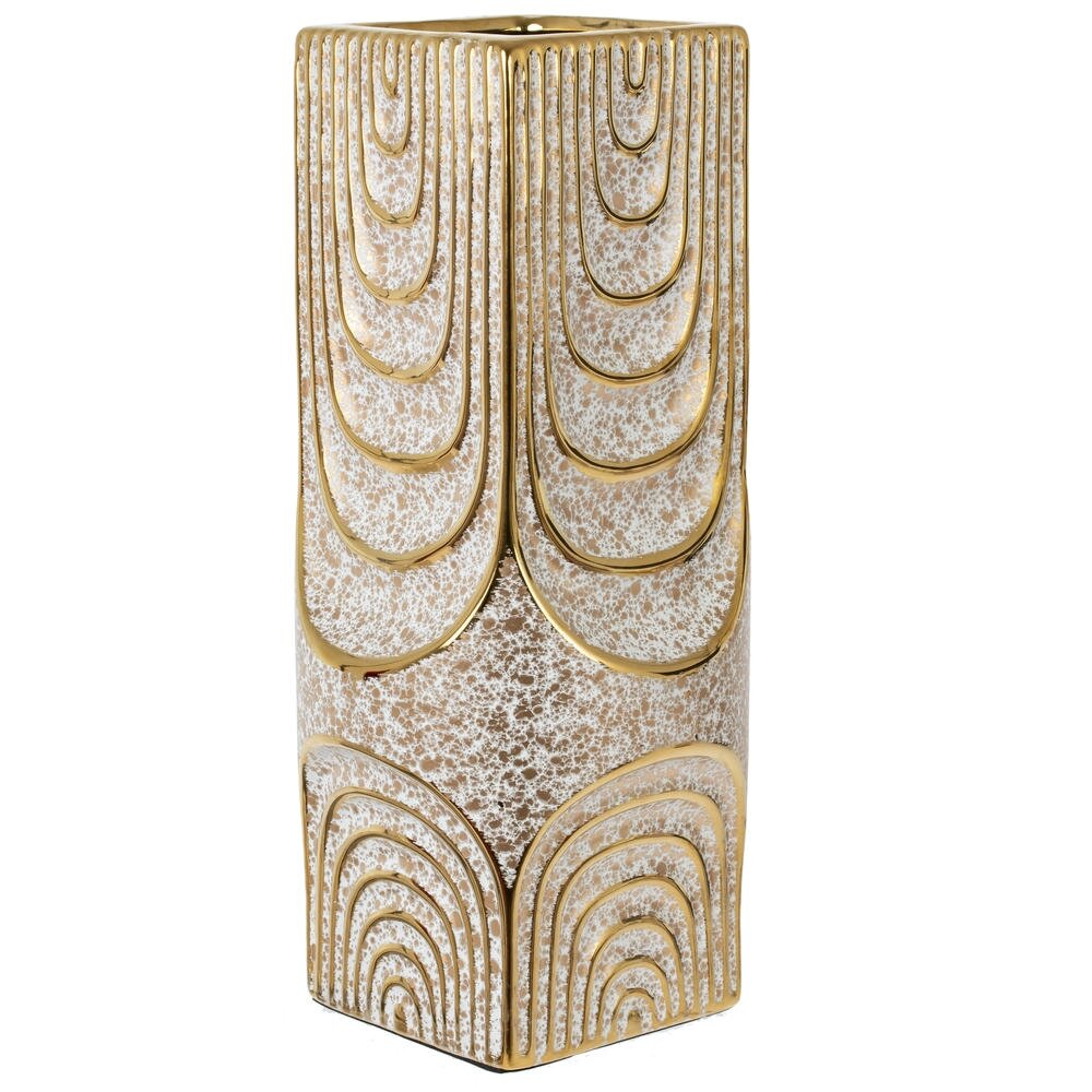 Стильная декоративная ваза из высококачественного фарфора объёмом 1950 мл. Имеет оригинальную прямоугольную форму с плавно расширяющимся корпусом, благодаря чему смотрится особенно эффектно на столе, подоконнике или консоли. Поверхность выполнена в бежево?белой гамме с глазурью, создающей лёгкий эффект камня. Фронт и задняя часть украшены рельефным геометрическим узором в виде ниспадающих дуг с глянцевым золотистым покрытием, которое красиво отражает свет и подчёркивает современный характер изделия. Ваза подойдёт как для живых, так и для сухоцветов, станет ярким акцентом в интерьере в стиле модерн, лофт или минимализм и удачным подарком для ценителей необычного декора. Диаметр горловины: 7.5 см.