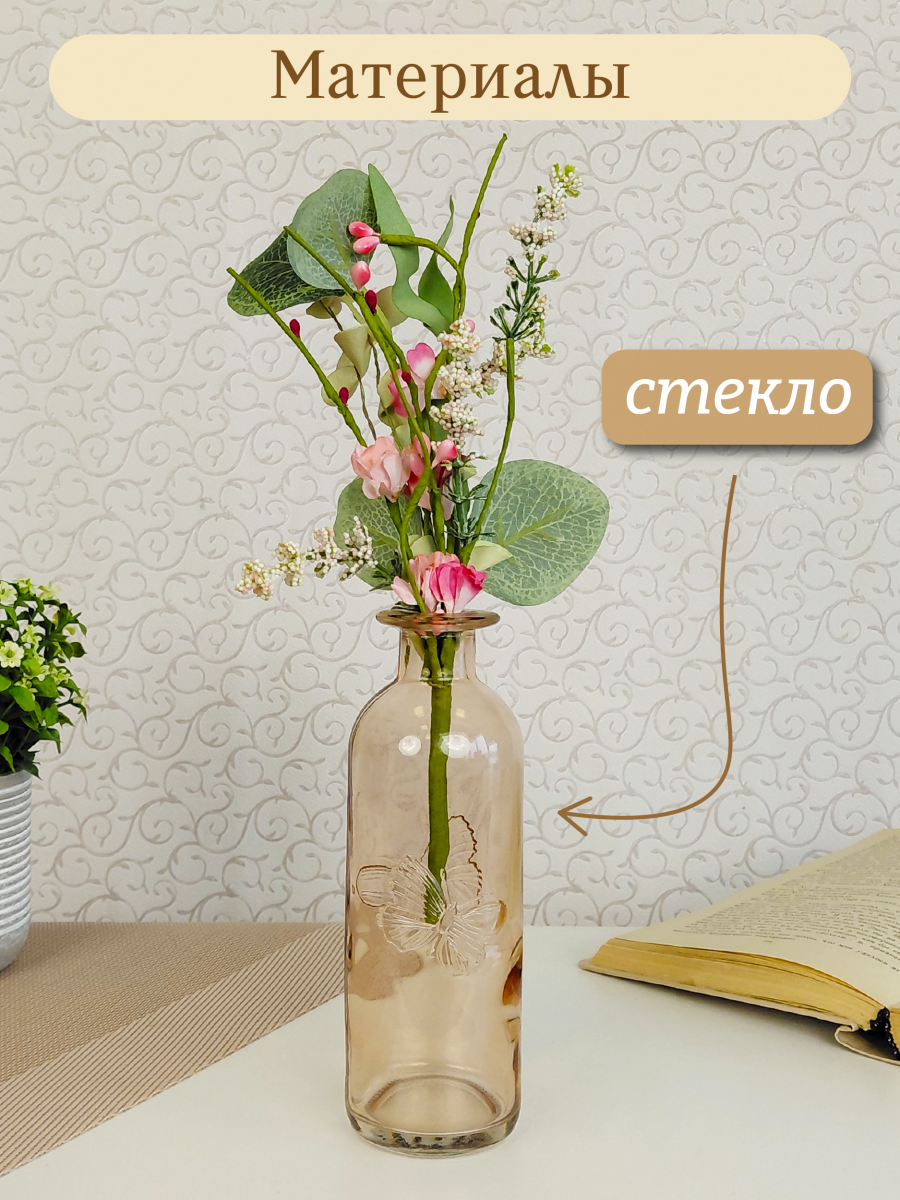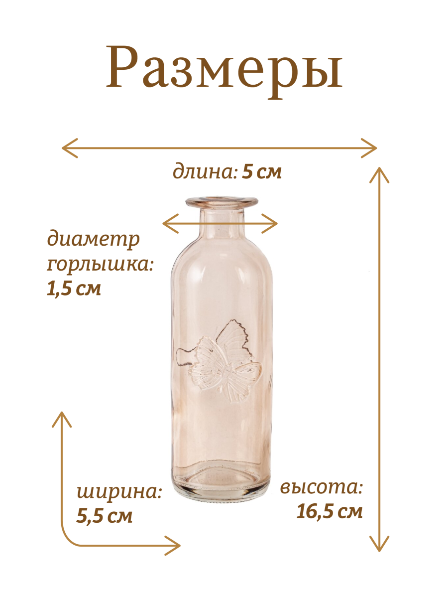 Миниатюрная ваза объемом 250 мл, длиной 5 см, шириной 5,5 см и высотой 16,5 см, выполнена из прозрачного стела с цветным напылением розового цвета. Вазочка имеет гладкую поверхность и декорирована объемным изображением бабочки, диаметр горлышка 1,5 см. Эта удивительная вазочка из стекла притягивает взгляд своей оригинальной формой и изящным дизайном. Размеры изделия позволяют использовать её как самостоятельный декоративный элемент или для размещения не крупных цветов и миниатюрных букетов. Эта ваза станет не только функциональным предметом, но и настоящим украшением интерьера, которое обязательно привлечет восхищённые взгляды гостей и обитателей дома. Вазочку можно использовать как элемент декорации стилизированной фото-зоны или как основу для творческих идей. Стеклянная ваза это отличный подарок на праздник или просто без повода, для Вас, Ваших близких и друзей. Благодаря лаконичному дизайну и форме, ваза легко впишется в любой интерьерный стиль. Эта ваза станет прекрасным дополнением к любому интерьеру, будь то классический или современный стиль. Она гармонично будет смотреться как в гостиной, так и в спальне, на кухне или в прихожей. Такая ваза идеально подойдёт для создания уютной атмосферы в вашем доме или офисе. Она будет радовать вас своей красотой и элегантностью каждый день.