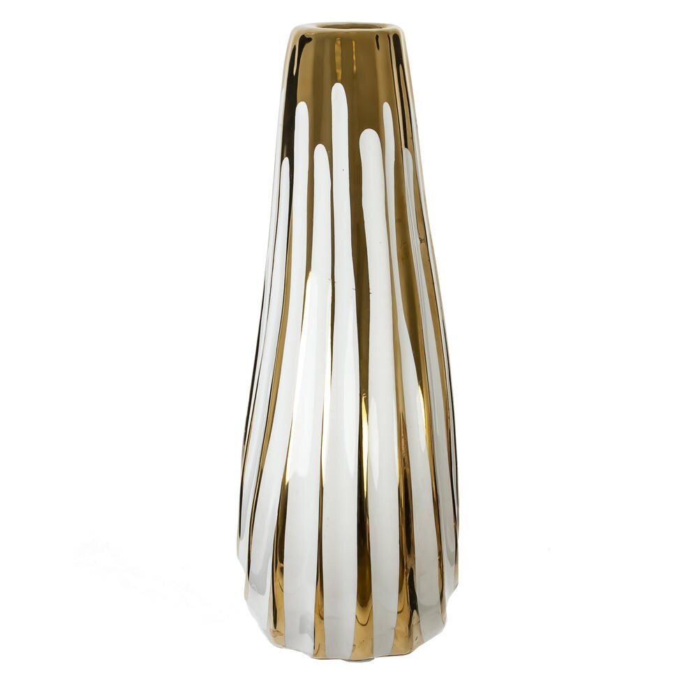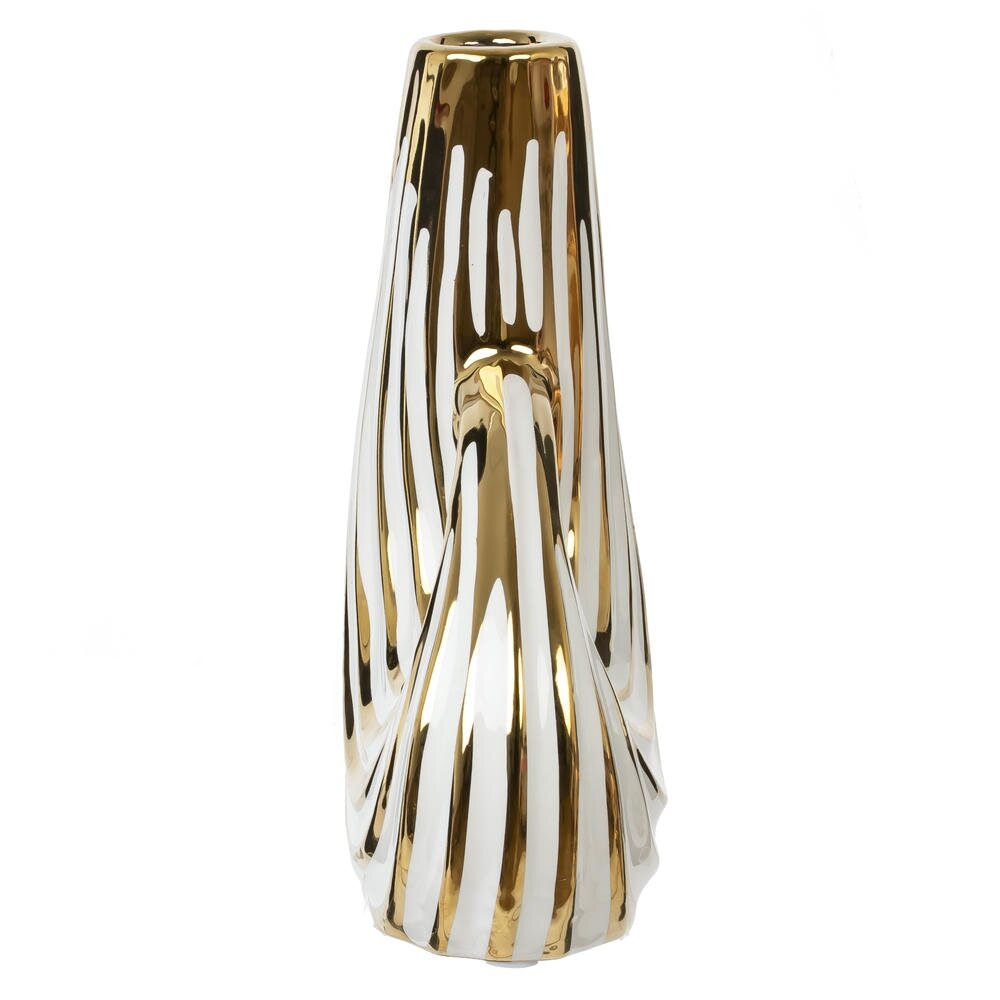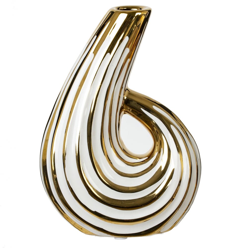 Изящная декоративная ваза объёмом 330 мл из высококачественного фарфора станет ярким акцентом вашего интерьера. Оригинальная скульптурная форма с плавными изгибами напоминает завиток или каплю, придавая изделию динамику и современный характер. Гладкая глянцевая поверхность сочетает белый цвет с эффектным зеркальным золотым покрытием, образуя выразительный полосатый узор. Ваза идеально подойдёт для одной–двух цветочных веток, сухоцветов или как самостоятельный элемент декора на полке, каминной полке или журнальном столике. Отличный вариант стильного подарка для ценителей необычных аксессуаров для дома. Диаметр горловины: 2 см.