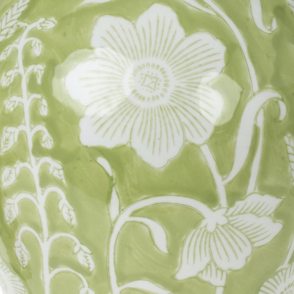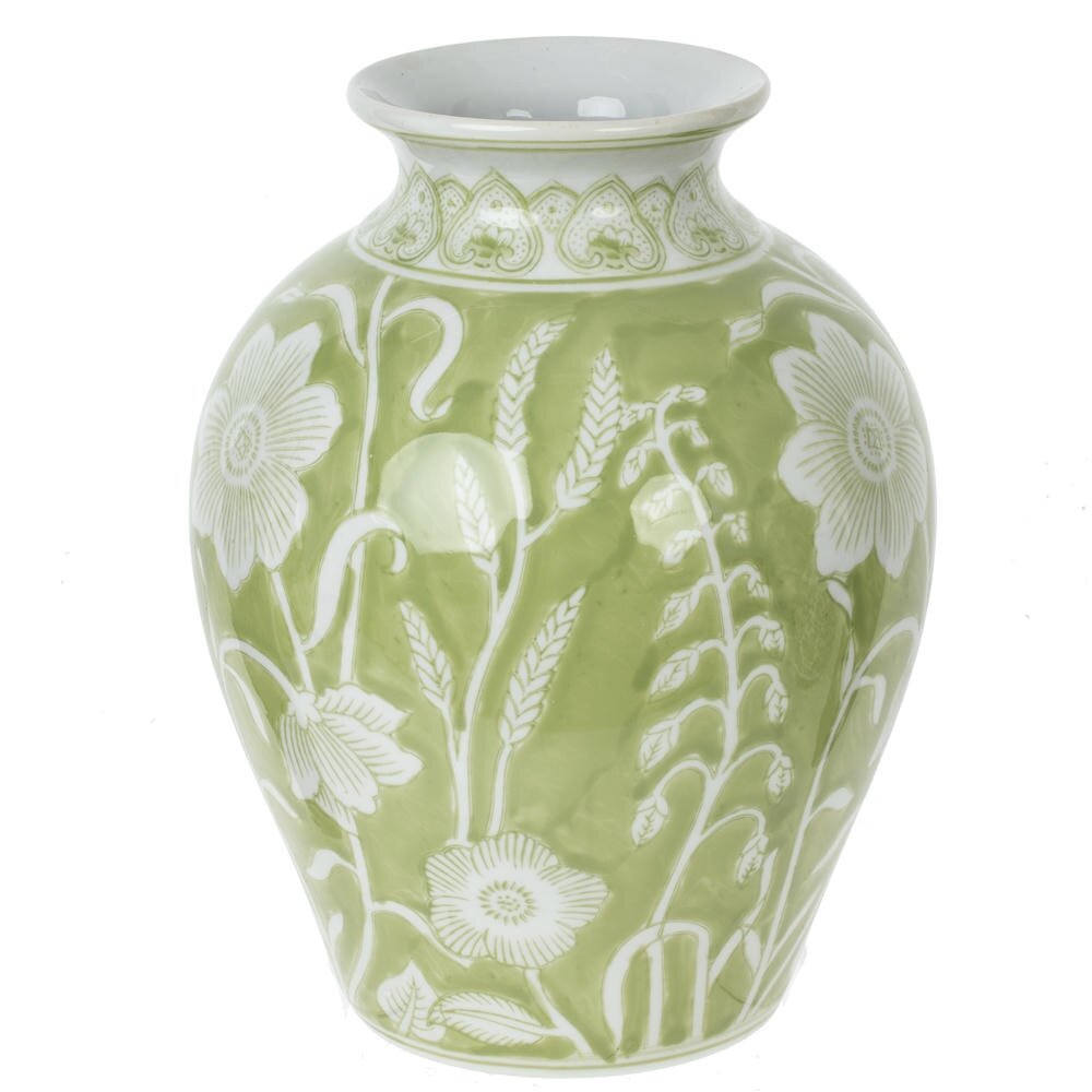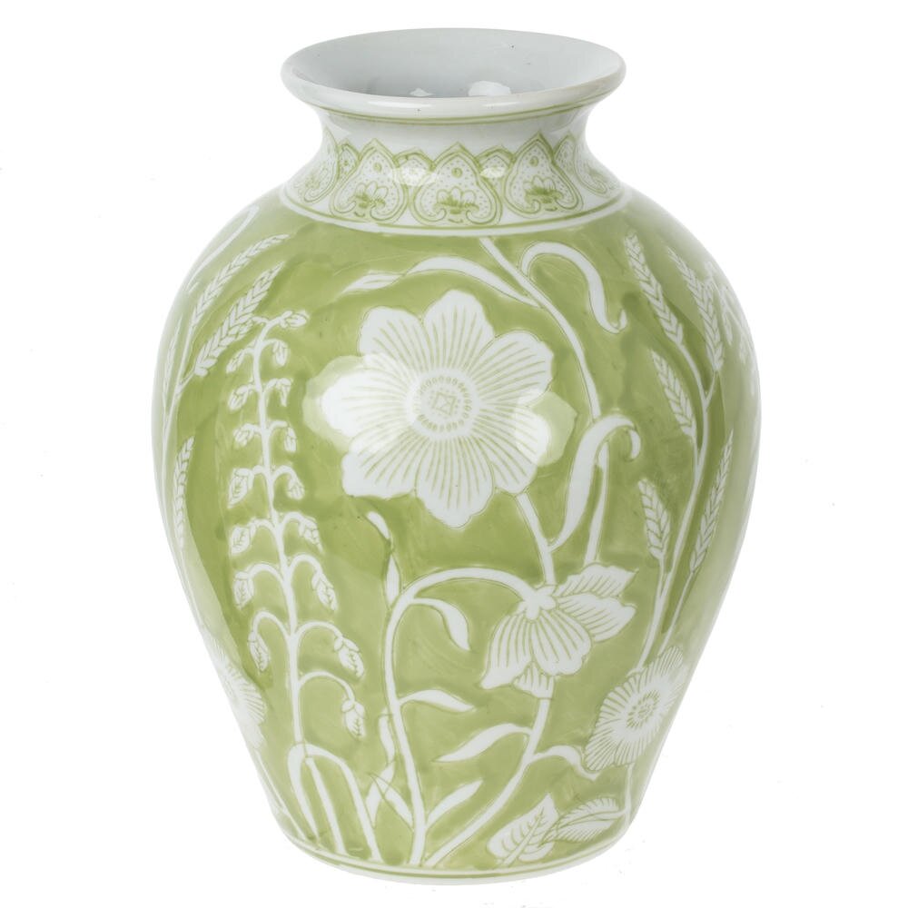 Элегантная декоративная ваза объёмом 3300 мл из высококачественного фарфора. Изделие выполнено в нежном светло?зелёном оттенке и украшено изысканным белым растительным орнаментом: крупные цветы и изящные стебли, плавно опоясывающие округлый корпус. Классическая форма с плавным расширением к центру и аккуратным горлышком подчёркивает утончённость силуэта и делает вазу устойчивой и удобной для размещения как пышных букетов, так и одиночных веток. Гладкая глазурованная поверхность проста в уходе, не выгорает и сохраняет насыщенность цвета. Такая фарфоровая ваза станет стильным акцентом в гостиной, спальне или кабинете, гармонично вписываясь как в современный, так и в классический интерьер, а также идеальным подарком для ценителей красивого дома. Диаметр горловины: 6.5 см.