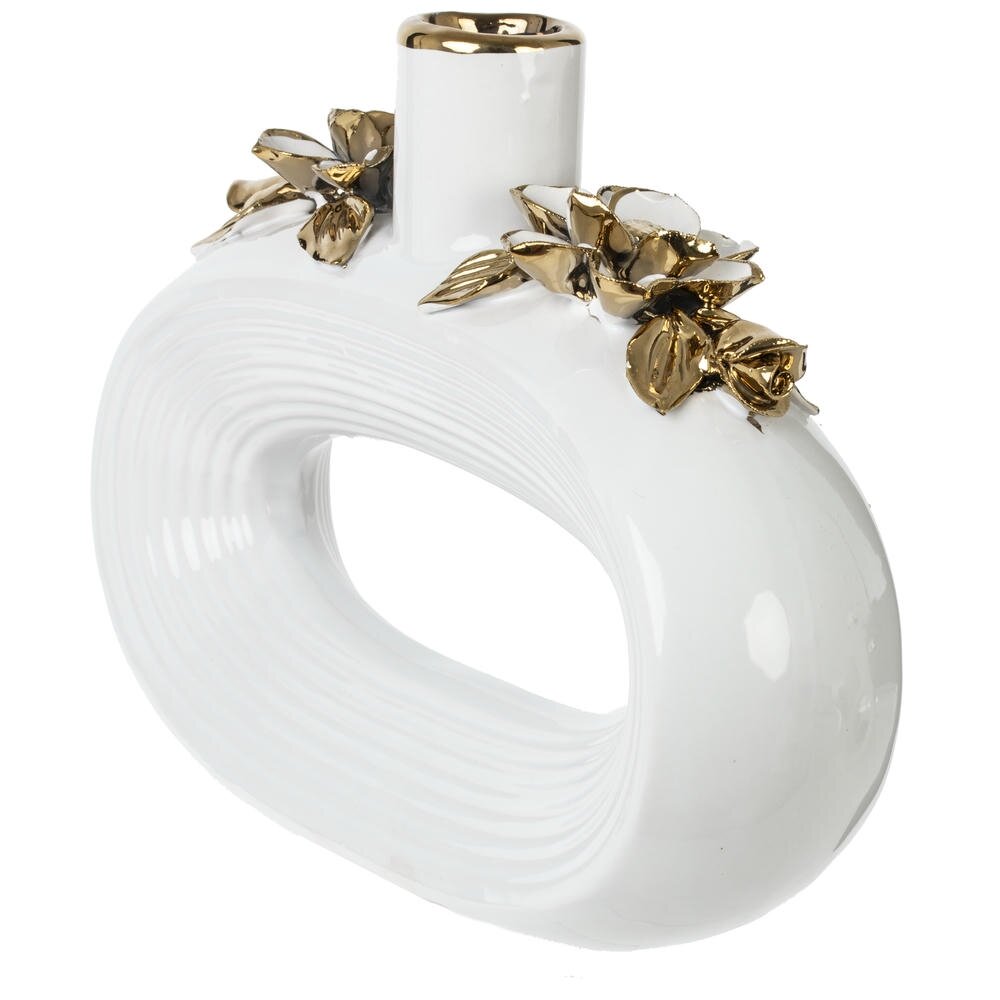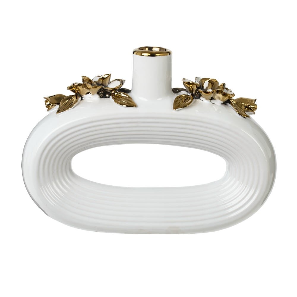 Элегантная фарфоровая ваза объёмом 650 мл станет выразительным акцентом в интерьере гостиной, спальни или кабинета. Оригинальная овальная форма с фигурным вырезом в центре придаёт изделию современный, почти скульптурный вид. Гладкая белоснежная поверхность украшена рельефными линиями и изысканным декором в виде объёмных цветов и листьев с глянцевым золотистым покрытием. Узкое горлышко идеально подходит для одной или нескольких эффектных веток, сухоцветов либо живых цветов с длинным стеблем. Ваза смотрится самодостаточно и без наполнения, поэтому её можно использовать как самостоятельный декоративный объект на полке, консоли или обеденном столе. Прочный качественный фарфор легко очищается и надолго сохраняет безупречный внешний вид. Диаметр горловины: 3 см.