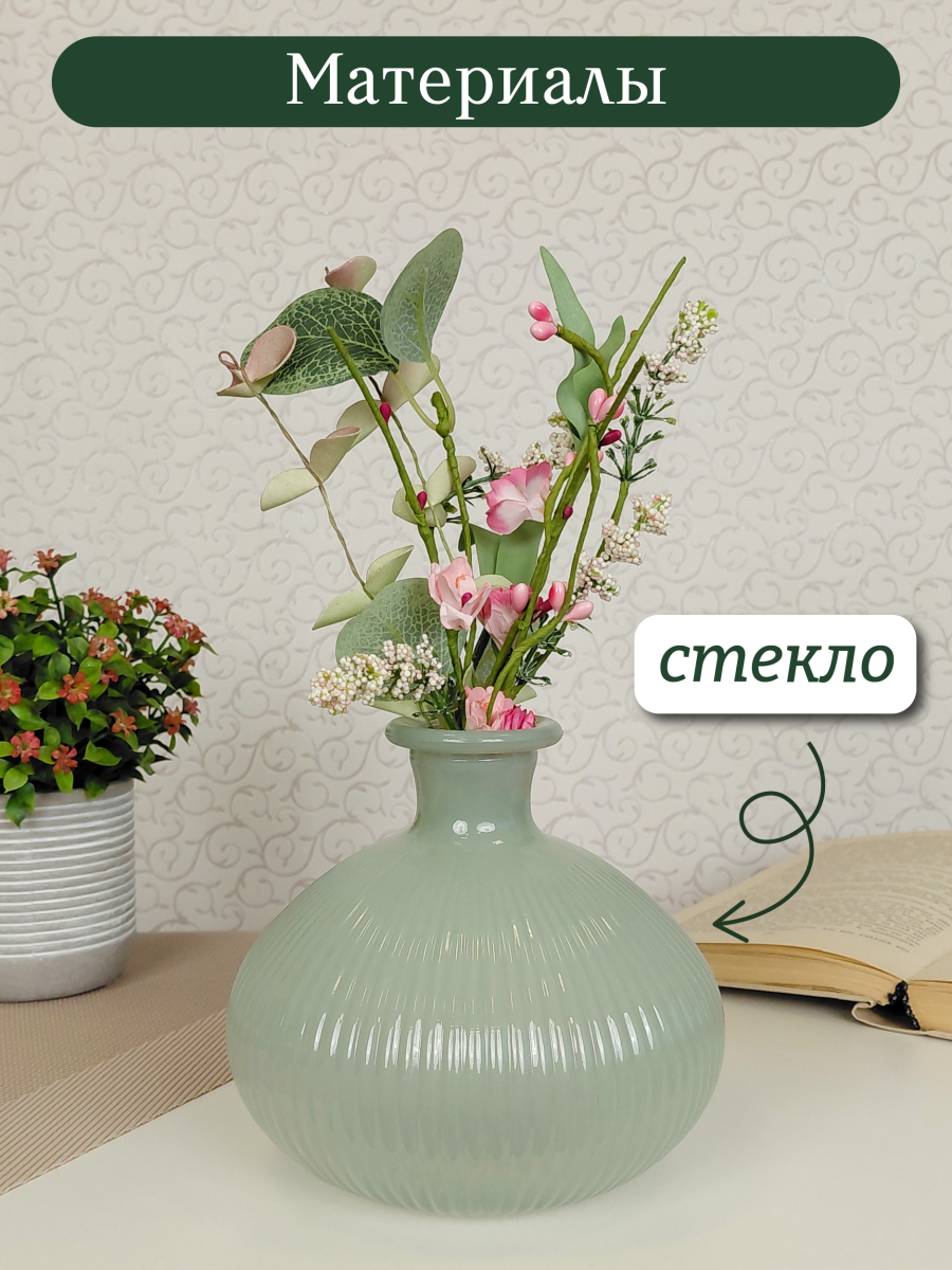 Миниатюрная ваза объемом 885 мл, диаметром 14 см и высотой 12,5 см, выполнена из прозрачного стекла с цветным напылением зеленого оттенка. Вазочка имеет рельефную поверхность приятную на ощупь, диаметр горлышка 2,5 см. Эта удивительная вазочка из стекла притягивает взгляд своей оригинальной формой и изящным дизайном. Размеры изделия позволяют использовать её как самостоятельный декоративный элемент или для размещения не крупных цветов и миниатюрных букетов. Эта ваза станет не только функциональным предметом, но и настоящим украшением интерьера, которое обязательно привлечет восхищённые взгляды гостей и обитателей дома. Вазочку можно использовать как элемент декорации стилизированной фото-зоны или как основу для творческих идей. Стеклянная ваза это отличный подарок на праздник или просто без повода, для Вас, Ваших близких и друзей. Благодаря лаконичному дизайну и форме, ваза легко впишется в любой интерьерный стиль. Эта ваза станет прекрасным дополнением к любому интерьеру, будь то классический или современный стиль. Она гармонично будет смотреться как в гостиной, так и в спальне, на кухне или в прихожей. Такая ваза идеально подойдёт для создания уютной атмосферы в вашем доме или офисе. Она будет радовать вас своей красотой и элегантностью каждый день.