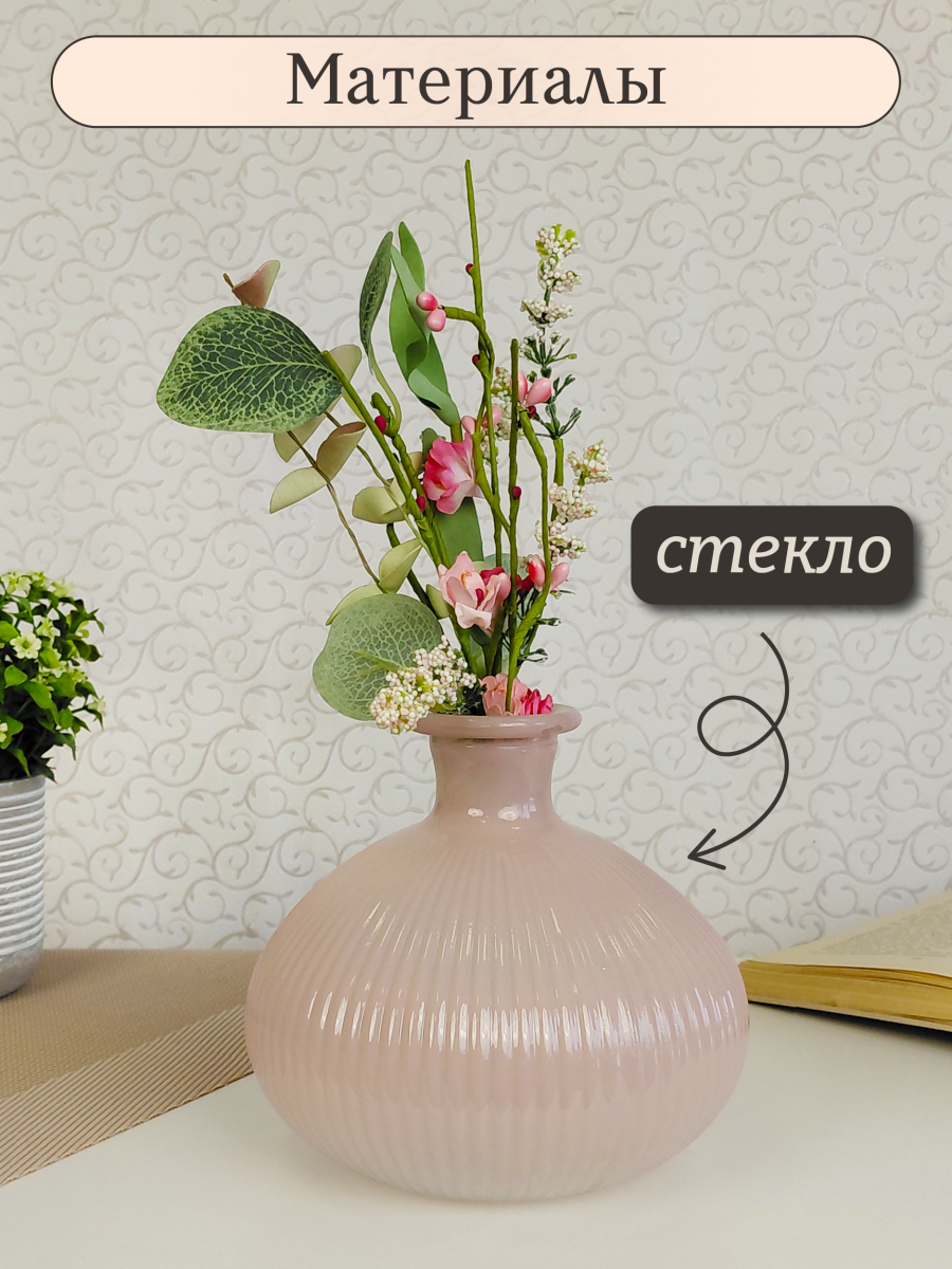 Миниатюрная ваза объемом 885 мл, диаметром 14 см и высотой 12,5 см, выполнена из прозрачного стекла с цветным напылением розового оттенка. Вазочка имеет рельефную поверхность приятную на ощупь, диаметр горлышка 2,5 см. Эта удивительная вазочка из стекла притягивает взгляд своей оригинальной формой и изящным дизайном. Размеры изделия позволяют использовать её как самостоятельный декоративный элемент или для размещения не крупных цветов и миниатюрных букетов. Эта ваза станет не только функциональным предметом, но и настоящим украшением интерьера, которое обязательно привлечет восхищённые взгляды гостей и обитателей дома. Вазочку можно использовать как элемент декорации стилизированной фото-зоны или как основу для творческих идей. Стеклянная ваза это отличный подарок на праздник или просто без повода, для Вас, Ваших близких и друзей. Благодаря лаконичному дизайну и форме, ваза легко впишется в любой интерьерный стиль. Эта ваза станет прекрасным дополнением к любому интерьеру, будь то классический или современный стиль. Она гармонично будет смотреться как в гостиной, так и в спальне, на кухне или в прихожей. Такая ваза идеально подойдёт для создания уютной атмосферы в вашем доме или офисе. Она будет радовать вас своей красотой и элегантностью каждый день.