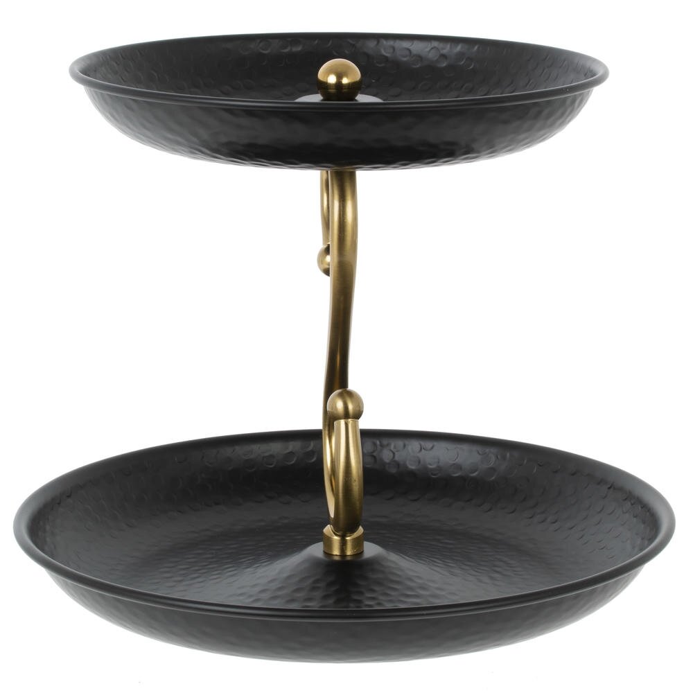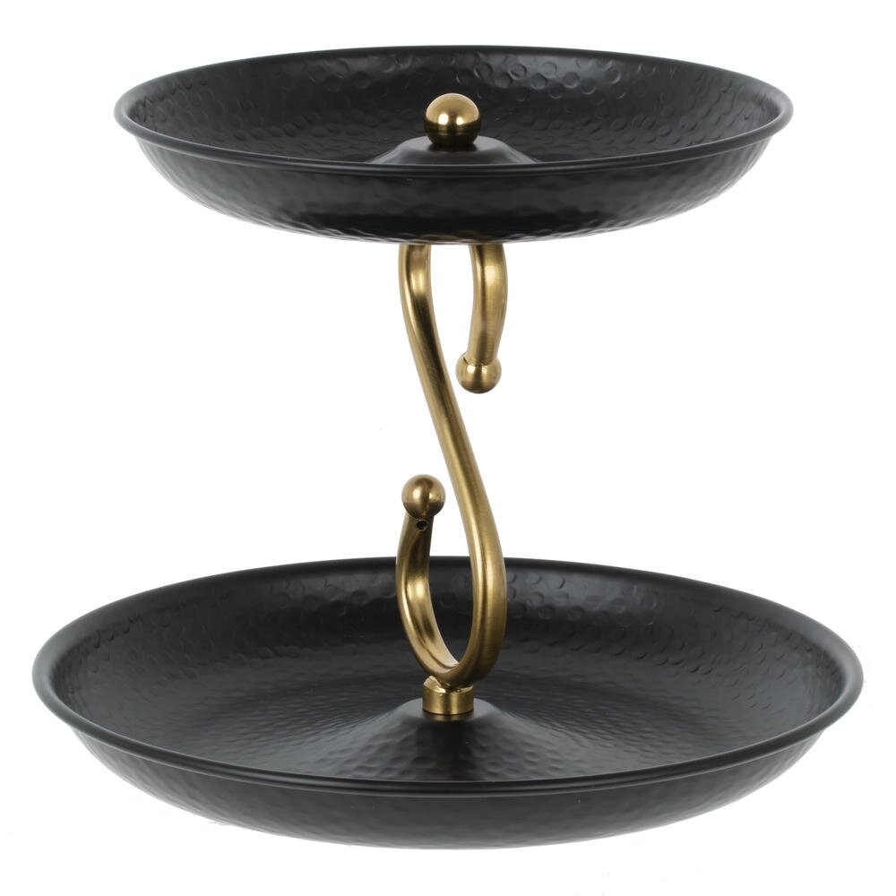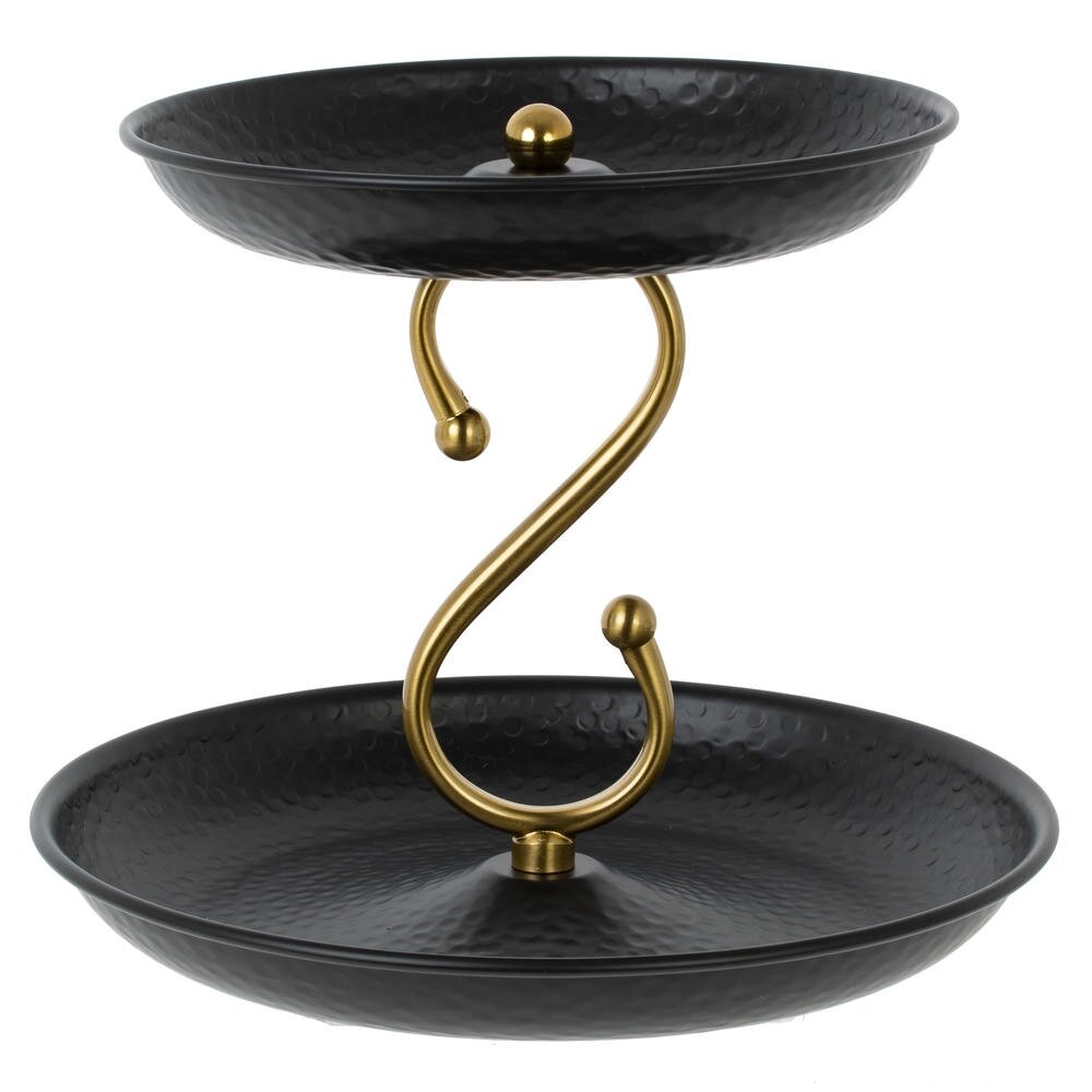 Элегантная двухъярусная ваза для фруктов из металла станет выразительным акцентом на вашей кухне или в гостиной. Модель выполнена в современном стиле: два круглых черных подноса с фактурной, слегка чеканистой поверхностью соединены изогнутой стойкой благородного золотистого цвета. Верхний ярус удобно использовать для ягод и мелких фруктов, нижний – для яблок, груш, цитрусовых или кондитерских изделий. Металл прочен, устойчив к деформации и прост в уходе – достаточно протереть влажной салфеткой. Конструкция обеспечивает хорошую устойчивость и экономит место на столе, создавая аккуратную, эффектную сервировку. Подходит как для повседневного использования, так и для праздничной подачи.