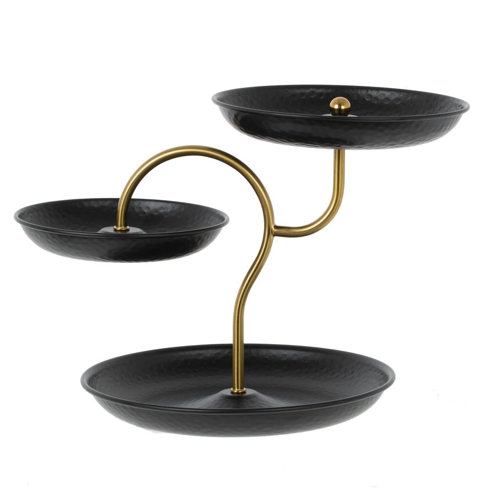Элегантная трехъярусная ваза для фруктов из металла станет выразительным акцентом на вашей кухне или в гостиной. Модель выполнена в современном стиле: три круглых черных подноса с фактурной, слегка чеканистой поверхностью соединены изогнутой стойкой благородного золотистого цвета. Верхние ярусы удобно использовать для ягод и мелких фруктов, нижний – для яблок, груш, цитрусовых или кондитерских изделий. Металл прочен, устойчив к деформации и прост в уходе – достаточно протереть влажной салфеткой. Конструкция обеспечивает хорошую устойчивость и экономит место на столе, создавая аккуратную, эффектную сервировку. Подходит как для повседневного использования, так и для праздничной подачи.