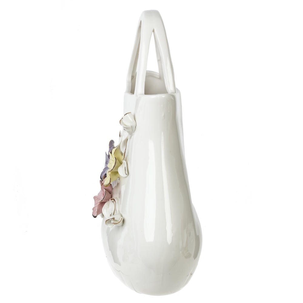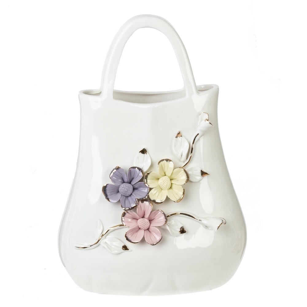 Элегантная ваза для искусственных цветов объёмом 1400 мл выполнена из высококачественного фарфора и станет изысканным акцентом в интерьере. Оригинальная форма в виде небольшої сумочки придаёт изделию декоративность и делает его заметным элементом сервировки или декора полки, камина, туалетного столика. Белоснежная глянцевая поверхность украшена объёмными цветами пастельных оттенков с аккуратными золотистыми акцентами на лепестках и листьях. Ваза идеально подходит для композиций из искусственных бутонов и сухоцветов, не требует сложного ухода и долго сохраняет безупречный внешний вид. Прекрасный выбор для подарка на праздник, новоселье или как стильное дополнение к вашему дому. Размер горловины: 14*4.5 см.