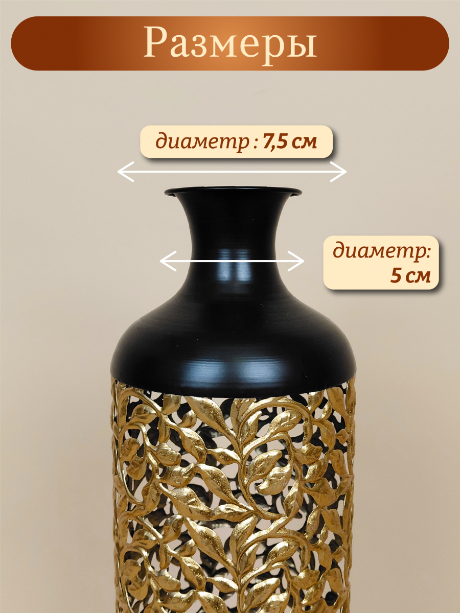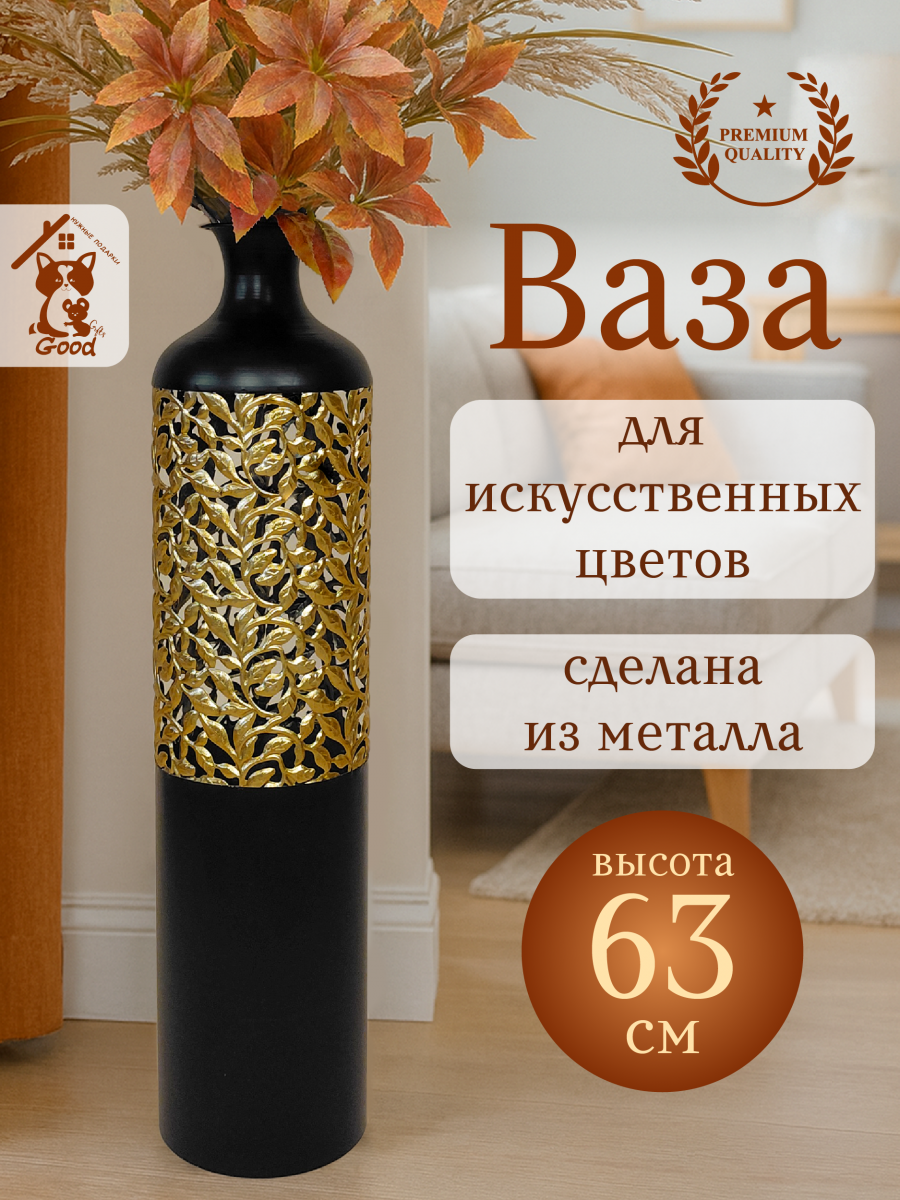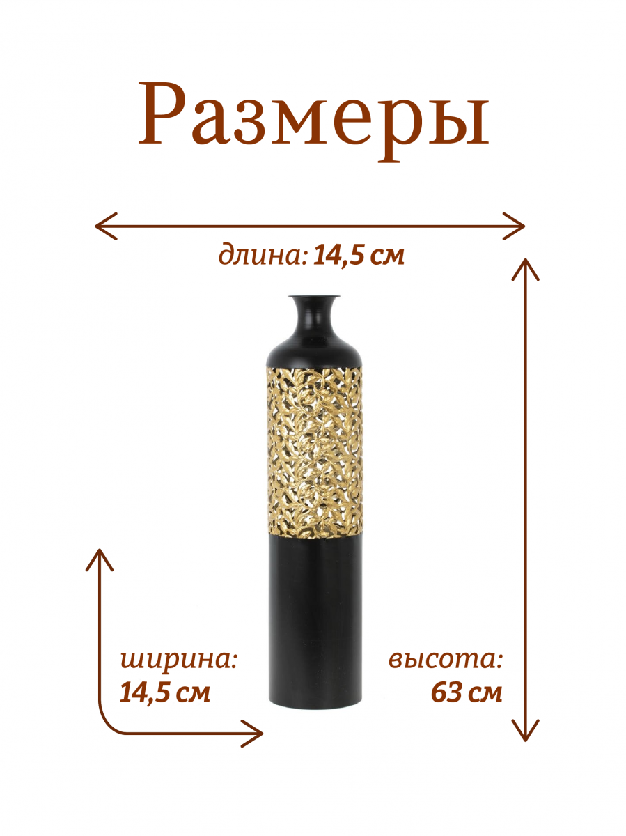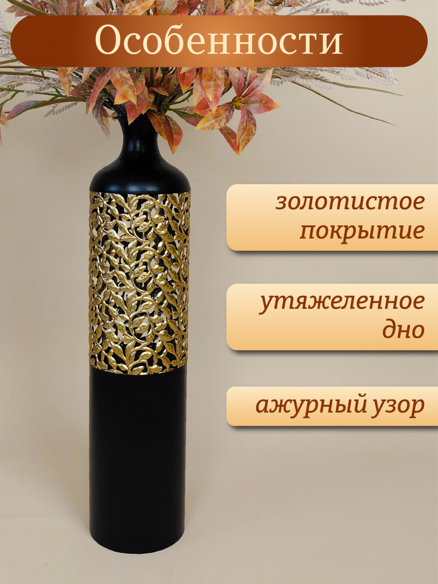 Напольная ваза «Элегия золота» — это воплощение роскоши и утончённого вкуса в интерьере. Элегантное сочетание глубокого чёрного цвета с изысканным золотым орнаментом в виде ажурных листьев создаёт поразительный контраст, притягивающий взгляд. Имеет размеры: длина- 14.5 см, ширина- 14.5 см , высота- 63 см. Диаметр горловины: 5 см. Лаконичная цилиндрическая форма с плавным сужением к горлышку подчёркивает современный стиль вазы. Золотая вставка с рельефным узором в виде листьев опоясывает среднюю часть вазы, добавляя изделию изысканности и глубины. Сочетание чёрного и золотого создаёт эффектный акцент, который гармонично впишется как в классический, так и в современный интерьер. Ваза подойдёт для размещения крупных цветочных композиций или может использоваться как самостоятельный декоративный элемент. «Элегия золота» станет центральным акцентом в гостиной, холле или кабинете. Она идеально дополнит интерьер в стиле арт-деко, минимализм или эклектика, добавив нотку благородной роскоши. Преобразите своё пространство с помощью этой изысканной вазы — она привнесёт в дом атмосферу элегантности и гармонии! Такая ваза станет отличным подарком на любой праздник и ни кого не оставит равнодушным.