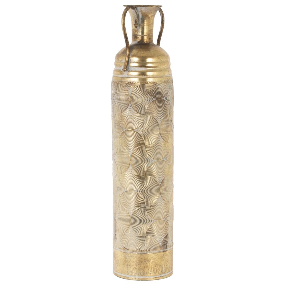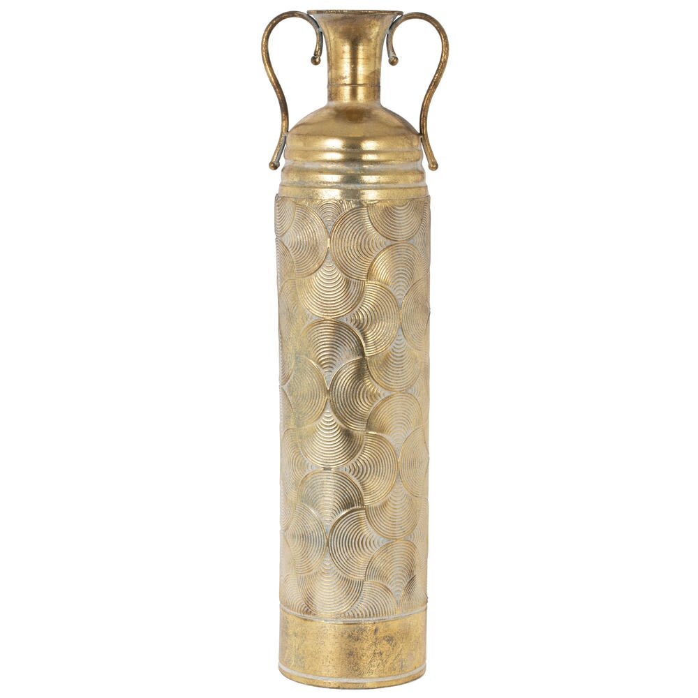 Элегантная напольная ваза для искусственных цветов из металла станет ярким акцентом в интерьере. Высокий цилиндрический корпус украшен рельефным узором из пересекающихся дуг, создающих эффект переливающихся волн. Золотистое покрытие с лёгким состаренным эффектом придаёт изделию благородный, немного винтажный вид. Узкое горлышко и два изящных фигурных ручки подчёркивают декоративный характер вазы. Модель идеально подойдёт для композиций из искусственных или сухоцветов, гармонично впишется в классические и современные интерьеры, гостиную, холл, кабинет или кафе. Материал – металл. Диаметр горловины: 4.5 см.
