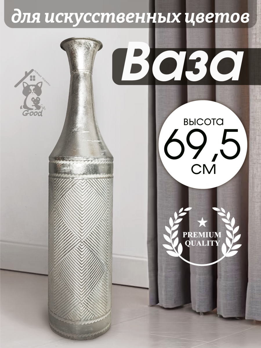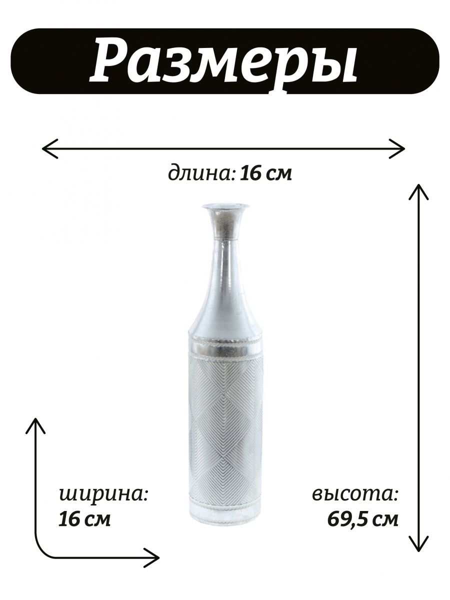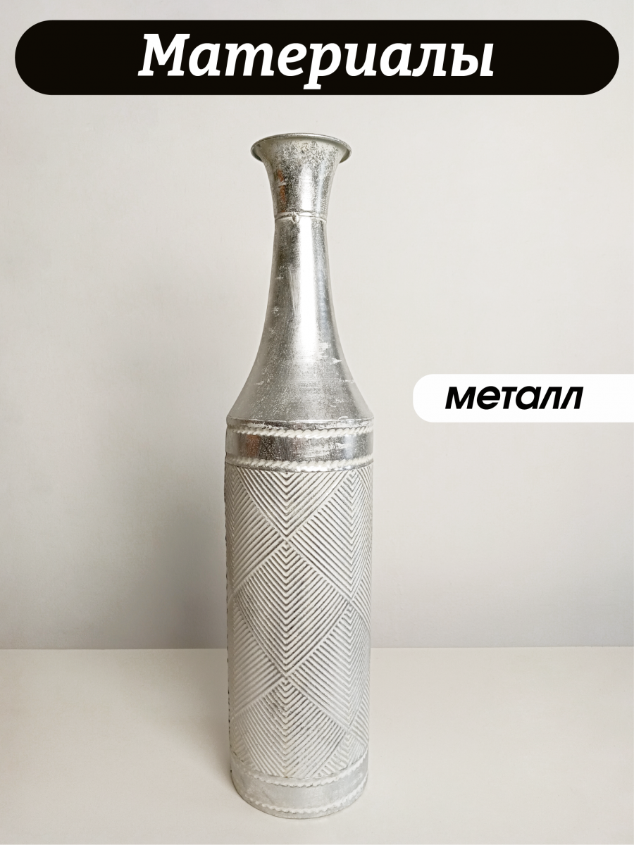Представляем роскошную напольную металлическую вазу, которая обязательно должна быть у всех любителей цветов! Очаровательная ваза высотой 69,5 сантиметра - это элегантное и стильное решение для вашего интерьера. Ваза выполнена в стиле ручной работы, швы с элементами точечной спайки. Диаметр горлышка составляет 10 см сверху и 5 см в сужении, что идеально подходит для демонстрации ваших любимых искусственных цветов и сухоцветов. Металлическая ваза устойчива за счет собственного веса и ровного плоского дна. Ваза в серебряном цвете, декорирована рельефной объемной чеканкой геометрической формы. Поверхность серебристой вазы покрыта напыление, эмитируя эффект патины и состаривания с потертостями. Эта шикарная ваза дополнит любой интерьер в доме или офисе и привнесет в него индивидуальность и шарм. Ее дизайн и благородный цвет добавят изысканности и шика в любое помещение. Для оптимального ухода не забывайте беречь изделие от прямого контакта с водой. Вместо этого просто вытрите пыль сухой тканью, чтобы сохранить первозданную красоту. Такая ваза станет отличным подарком на любой праздник и ни кого не оставит равнодушным.