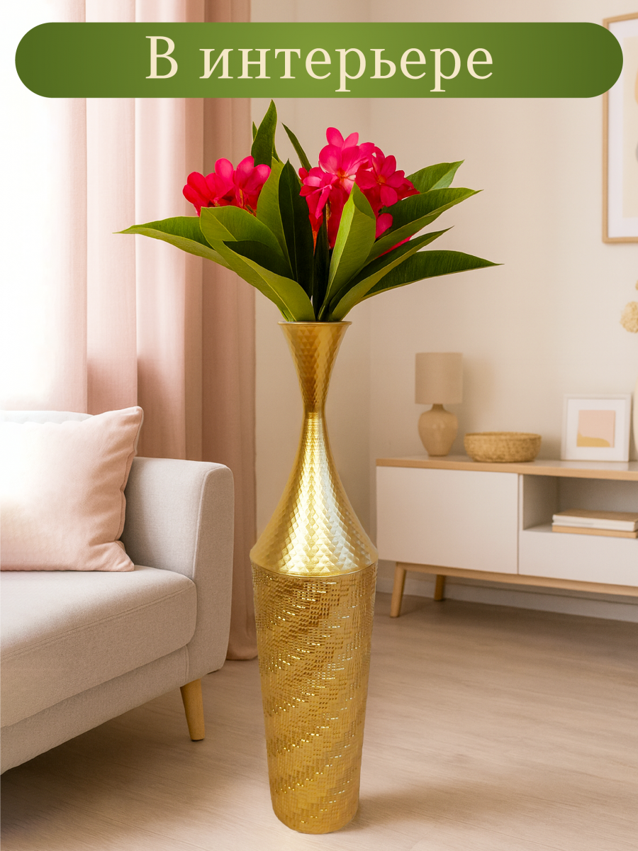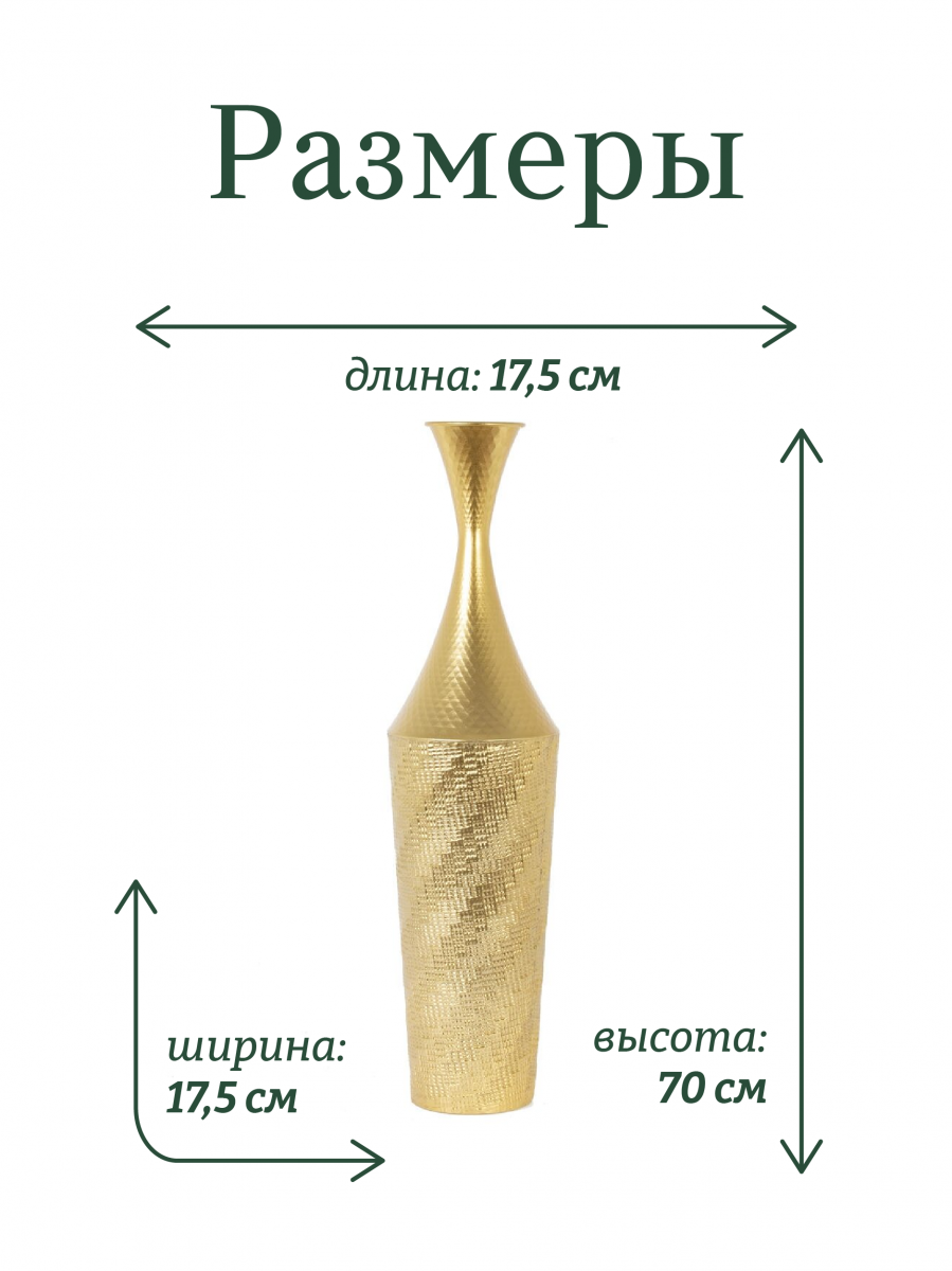 Элегантная напольная ваза "Золотой шик" станет настоящим украшением любого интерьера. Имеет размеры: длина-17.5 см, ширина-17.5 см, высота-70см. Диаметр горловины: 3 см. Эта металлическая ваза выполненная в роскошном золотом цвете, она притягивает взгляд своей изысканностью и благородством. Утончённая форма с плавно сужающимся горлышком подчёркивает изящество изделия, а фактурная поверхность с рельефным узором добавляет глубины и выразительности. Ваза идеально подойдёт для создания акцентной композиции в гостиной или холле, размещения сухоцветов или искусственных букетов, дополнения стильного декора в современном, арт-деко или минималистичном интерьере. "Золотой шик" гармонично сочетается с элементами декора в тёплых тонах, зеркалами в массивных рамах, текстилем с золотыми акцентами. Благодаря лаконичному, но эффектному дизайну, ваза впишется как в классический, так и в ультрасовременный интерьер, добавив ему нотку роскоши и утончённости. Превратите свой дом в пространство стиля с вазой "Золотой шик". Такая ваза станет отличным подарком на любой праздник и ни кого не оставит равнодушным.