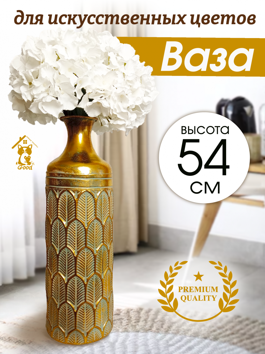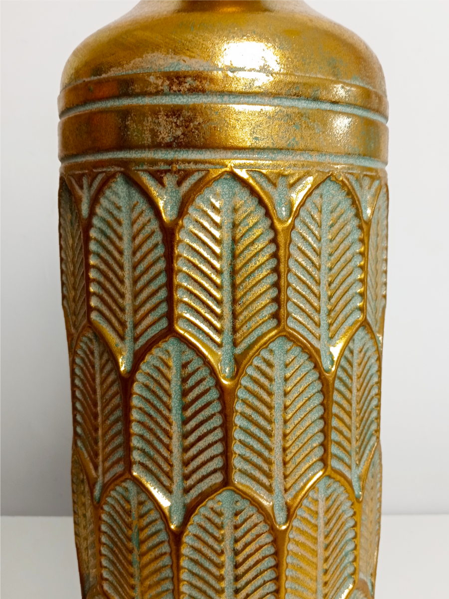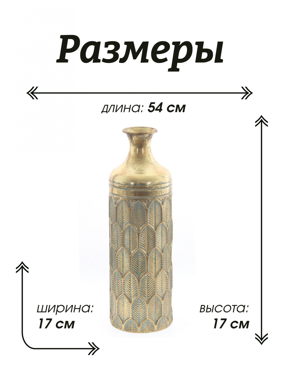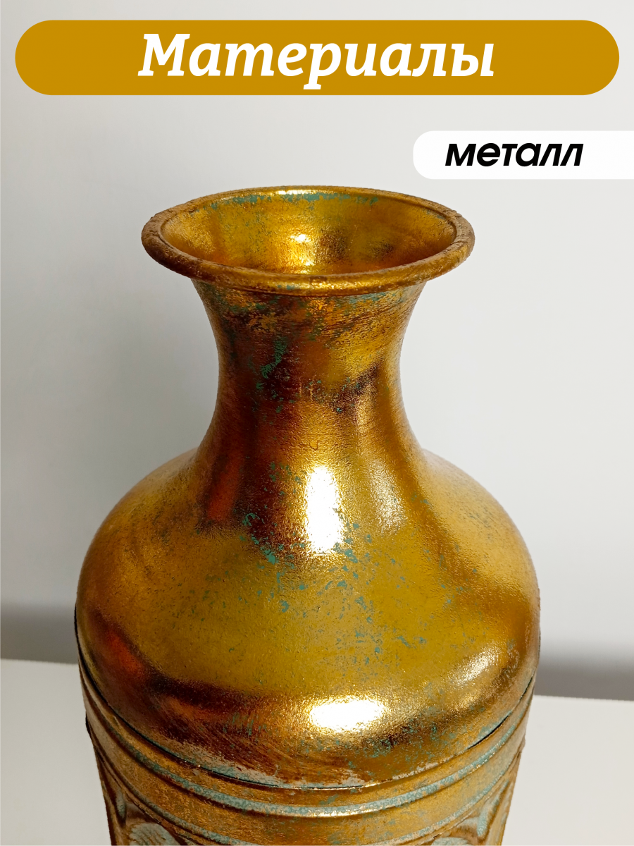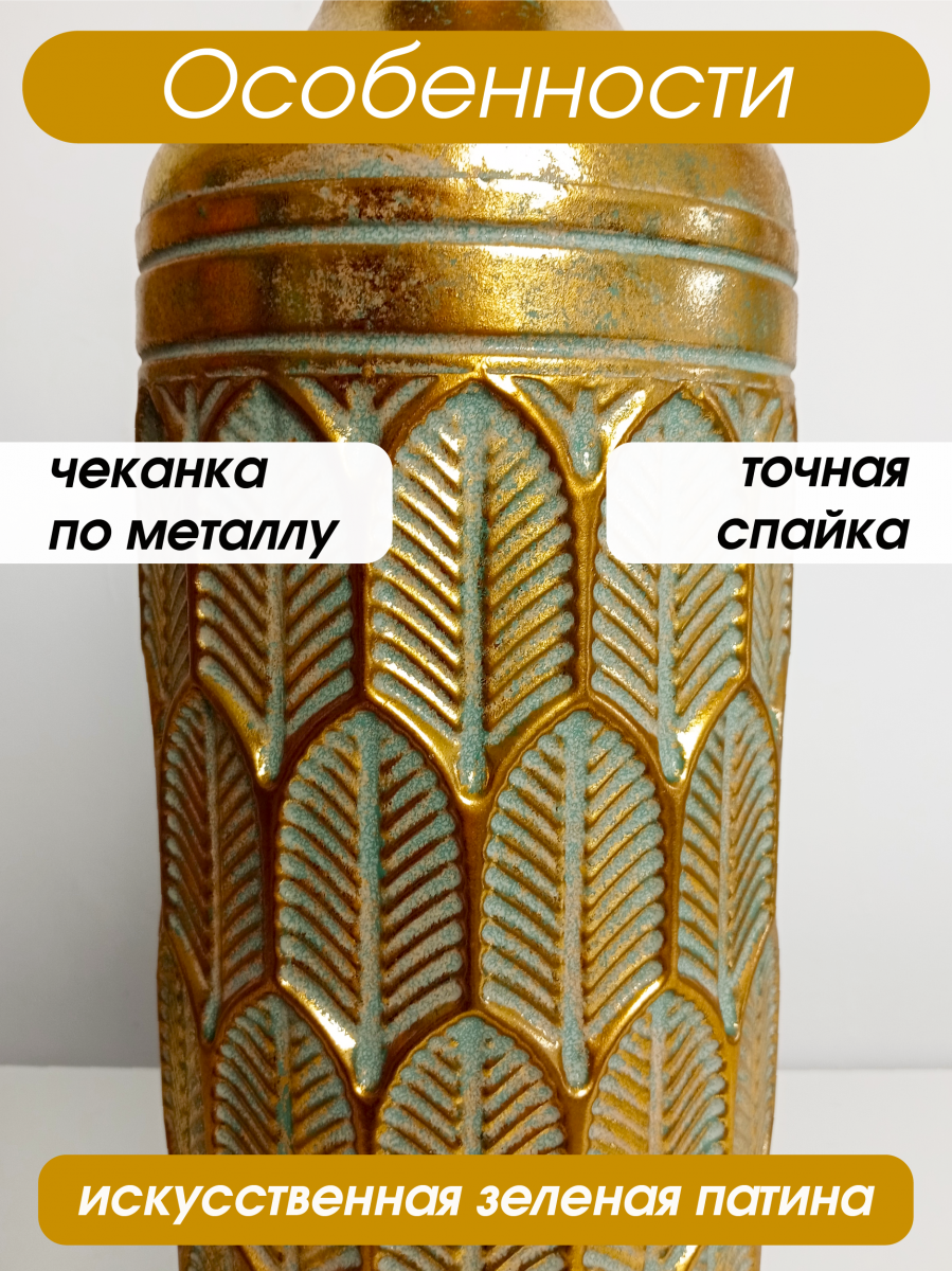 Представляем роскошную напольную металлическую вазу, которая обязательно должна быть у всех любителей цветов! Эта очаровательная ваза высотой 54 сантиметра - это элегантное и стильное решение для вашего интерьера. Ваза выполнена в стиле ручной работы, швы с элементами точечной спайки. Диаметр горлышка составляет 9 см сверху и 5 см в сужении, что идеально подходит для демонстрации ваших любимых искусственных цветов и сухоцветов. Металлическая ваза устойчива за счет собственного веса и ровного плоского дна. Ваза в золотом цвете, декорирована рельефной объемной чеканкой в виде листов папоротника. Поверхность золотистой вазы покрыта напыление изумрудного цвета, эмитируя эффект патины и состаривания с потертостями. Эта шикарная ваза дополнит любой интерьер в доме или офисе и привнесет в него индивидуальность и шарм. Ее дизайн и благородный цвет добавят изысканности и шика в любое помещение. Для оптимального ухода не забывайте беречь изделие от прямого контакта с водой. Вместо этого просто вытрите пыль сухой тканью, чтобы сохранить первозданную красоту. Такая ваза станет отличным подарком на любой праздник и ни кого не оставит равнодушным.