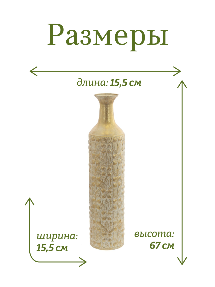 Представляем роскошную напольную металлическую вазу, которая обязательно должна быть у всех любителей цветов! Эта очаровательная ваза высотой 52.5 см и диаметром 20 см - это элегантное и стильное решение для вашего интерьера. Ваза выполнена в стиле ручной работы, швы с элементами точечной спайки. Диаметр горлышка составляет 8,5 см сверху и 5,5 в месте сужения, что идеально подходит для демонстрации ваших любимых искусственных цветов и сухоцветов. Металлическая ваза устойчива за счет собственного веса и ровного плоского дна. Ваза в золотом цвете с серой затиркой, декорирована рельефной объемной чеканкой. Уникальности вазе добавляет искусственный эффект патины и состаривания с потертостями. Эта шикарная ваза дополнит любой интерьер в доме или офисе и привнесет в него индивидуальность и шарм. Ее дизайн и благородный цвет добавят изысканности и шика в любое помещение. Для оптимального ухода не забывайте беречь изделие от прямого контакта с водой. Вместо этого просто вытрите пыль сухой тканью, чтобы сохранить первозданную красоту. Такая ваза станет отличным подарком на любой праздник и ни кого не оставит равнодушным.