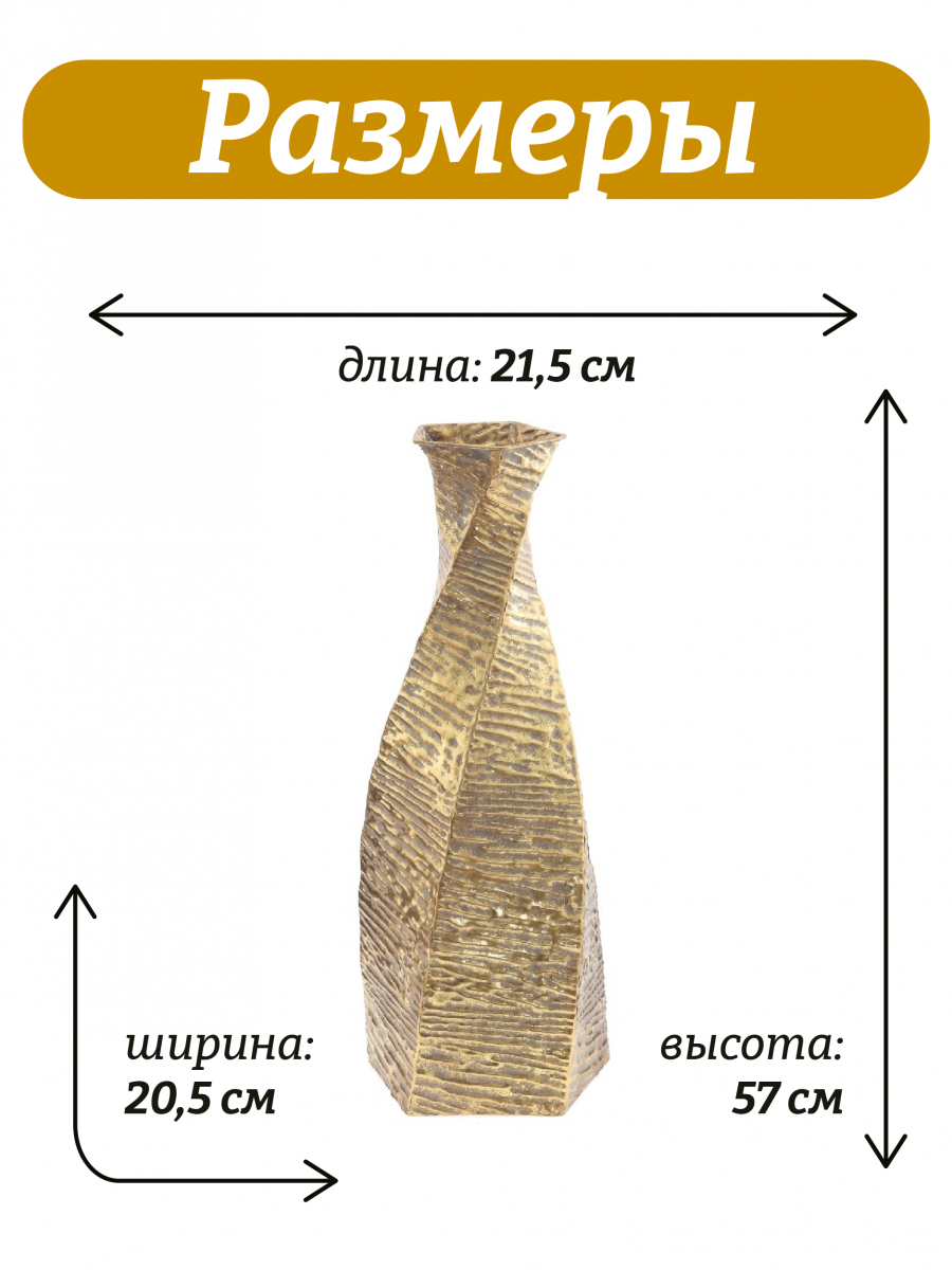 Представляем роскошную напольную металлическую вазу, которая обязательно должна быть у всех любителей цветов! Эта очаровательная ваза высотой 57 см, длиной 21,5 см, шириной 20,5 см - это элегантное и стильное решение для вашего интерьера. Ваза выполнена в стиле ручной работы, швы с элементами точечной спайки. Размер горлышка составляет 13,5х12,5 см сверху и 7х8 см в сужении, что идеально подходит для демонстрации ваших любимых искусственных цветов и сухоцветов. Металлическая ваза устойчива за счет собственного веса и ровного плоского дна. Ваза в золотом цвете, декорирована рельефной объемной чеканкой, изысканности и необычности вазе добавляет ее форма. Напольная ваза изготовлена из нескольких металлических листов изогнутых по спирали и сваренных между содой. Поверхность золотистой вазы дополняют элементы состаренности и потертостей. Эта шикарная ваза дополнит любой интерьер в доме или офисе и привнесет в него индивидуальность и шарм. Ее дизайн и благородный цвет добавят изысканности и шика в любое помещение. Для оптимального ухода не забывайте беречь изделие от прямого контакта с водой. Вместо этого просто вытрите пыль сухой тканью, чтобы сохранить первозданную красоту. Такая ваза станет отличным подарком на любой праздник и ни кого не оставит равнодушным.