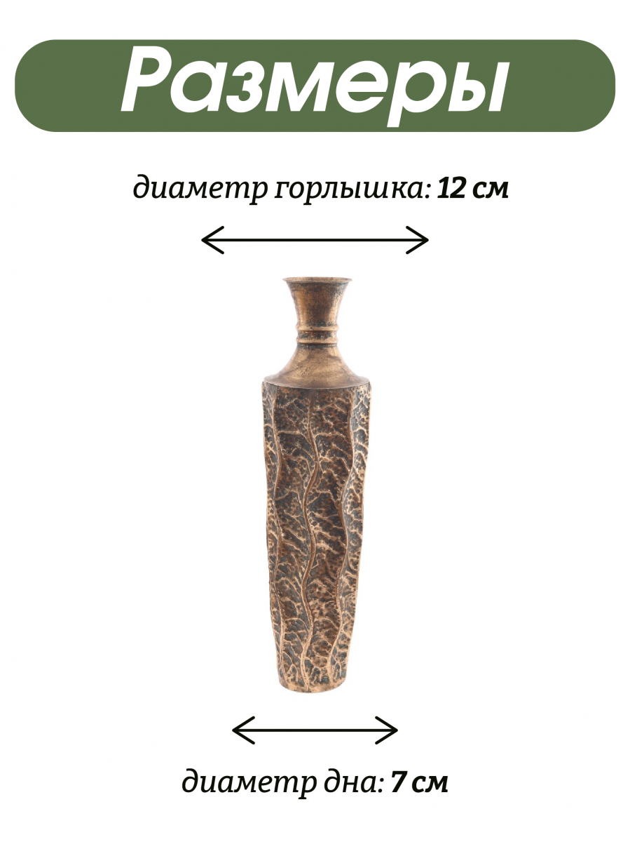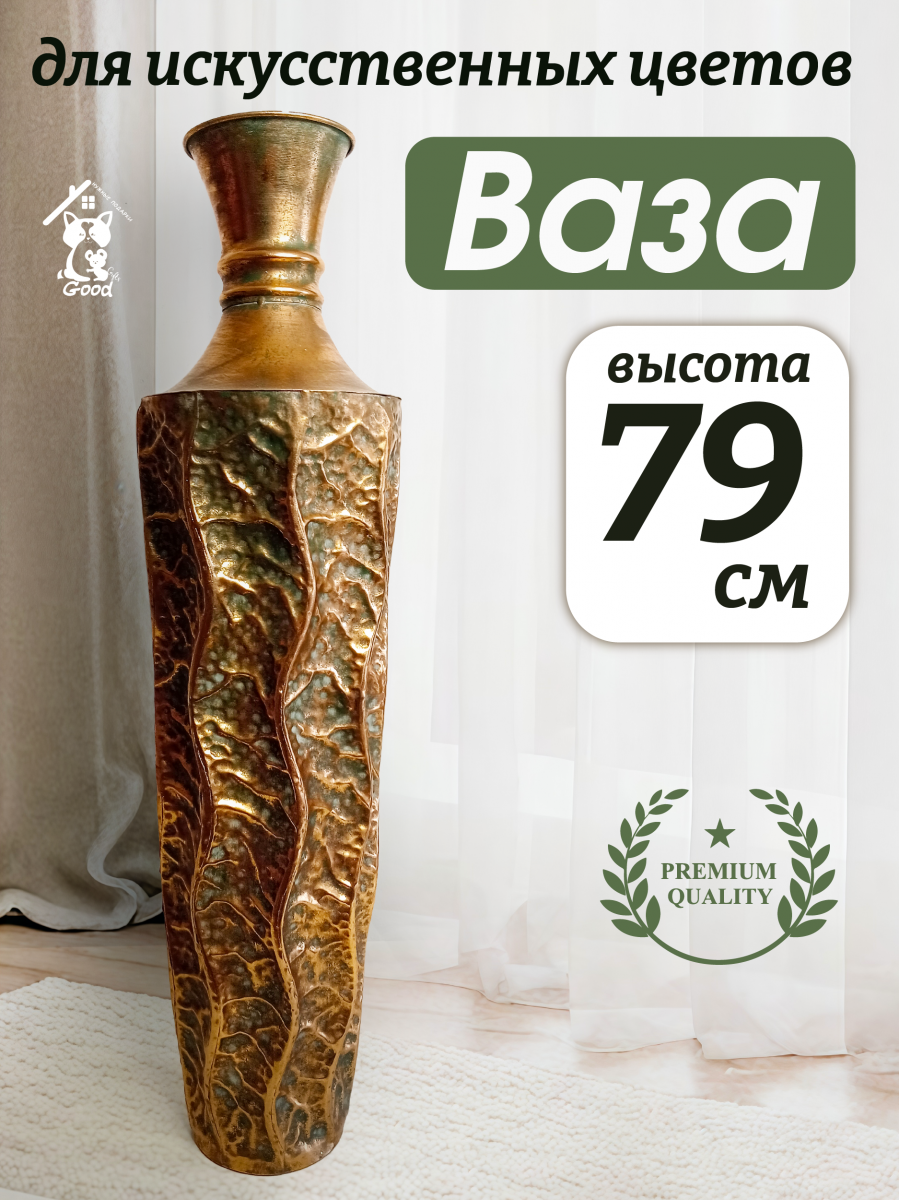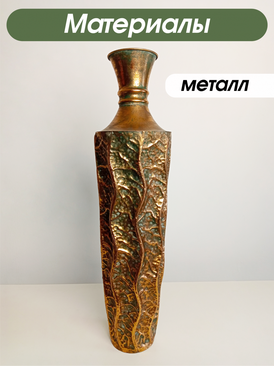 Представляем роскошную напольную металлическую вазу, которая обязательно должна быть у всех любителей цветов! Эта очаровательная ваза высотой 79 см и диаметром 21 см - это элегантное и стильное решение для вашего интерьера. Ваза выполнена в стиле ручной работы, швы с элементами точечной спайки. Диаметр горлышка составляет 12 см сверху, 7 см в месте сужения, что идеально подходит для демонстрации ваших любимых искусственных цветов и сухоцветов. Металлическая ваза устойчива за счет собственного веса и ровного плоского дна. Ваза в золотом цвете с бронзовым оттенком, декорирована рельефной объемной чеканкой. Уникальности вазе добавляет искусственный эффект патины и состаривания с потертостями. Эта шикарная ваза дополнит любой интерьер в доме или офисе и привнесет в него индивидуальность и шарм. Ее дизайн и благородный цвет добавят изысканности и шика в любое помещение. Для оптимального ухода не забывайте беречь изделие от прямого контакта с водой. Вместо этого просто вытрите пыль сухой тканью, чтобы сохранить первозданную красоту. Такая ваза станет отличным подарком на любой праздник и ни кого не оставит равнодушным.