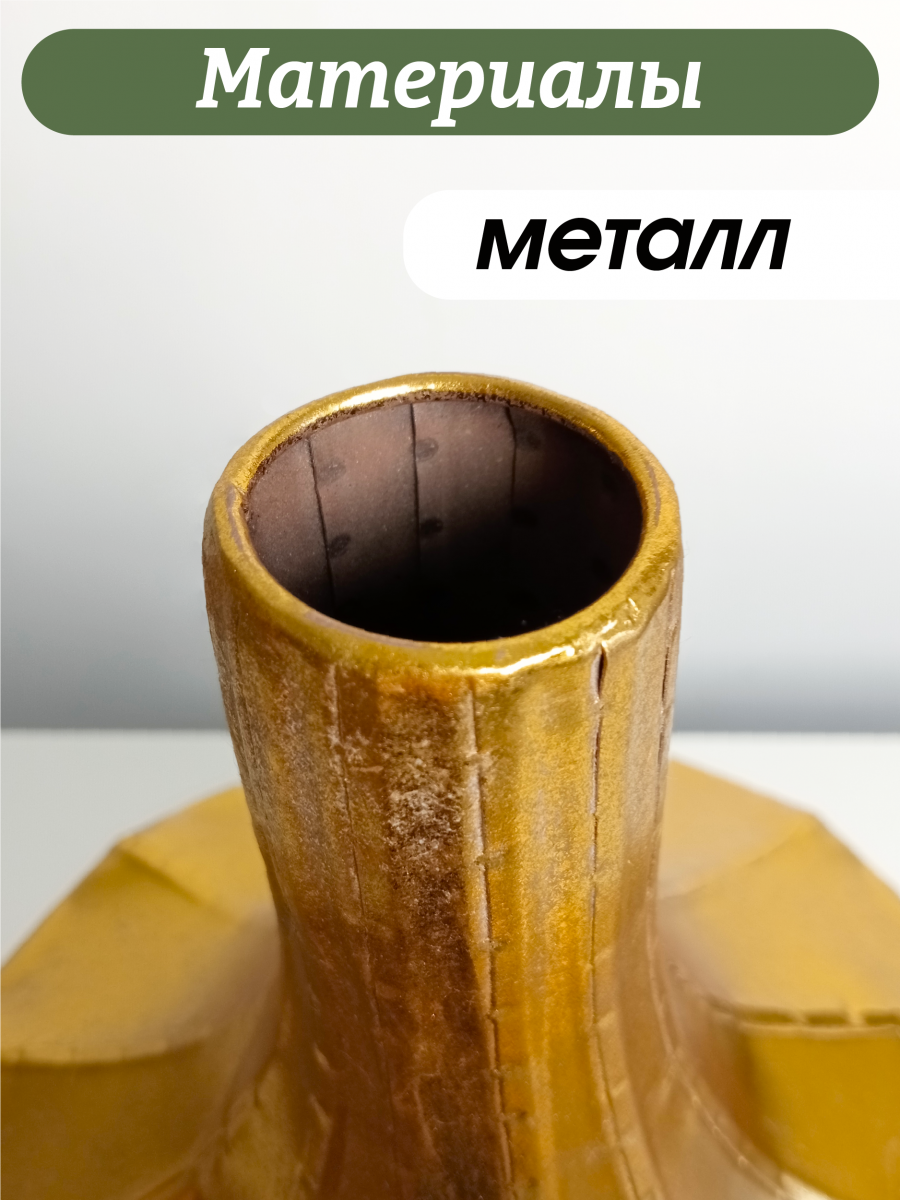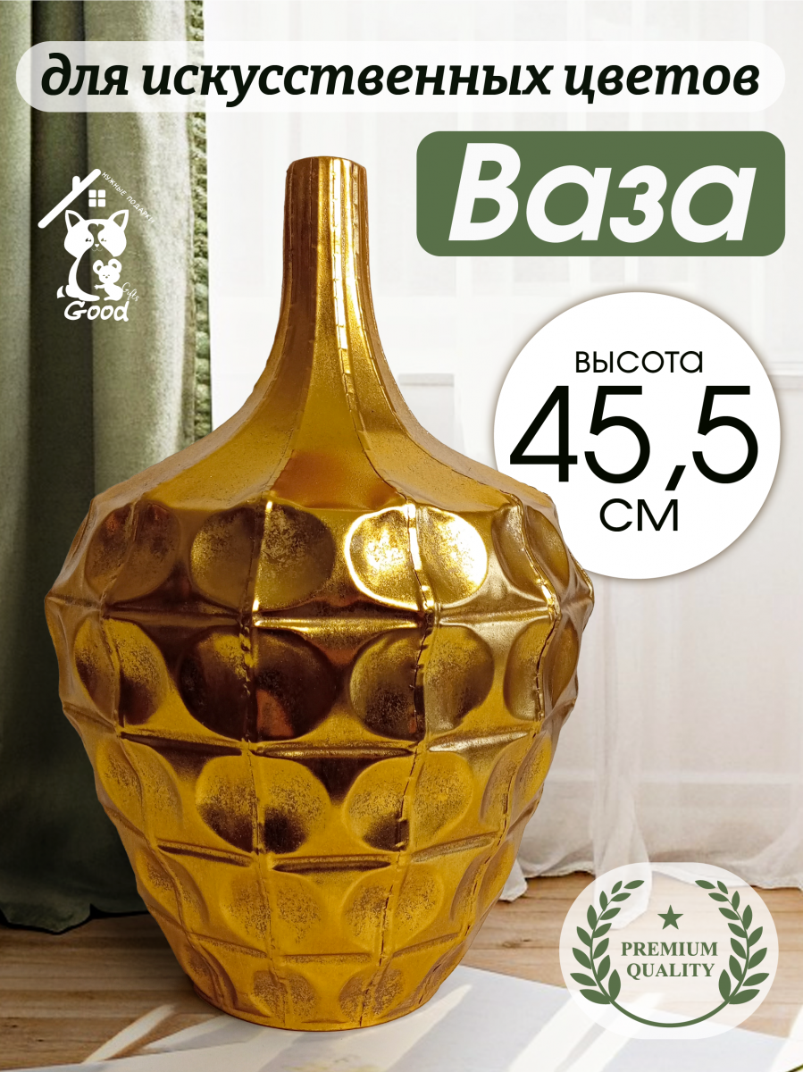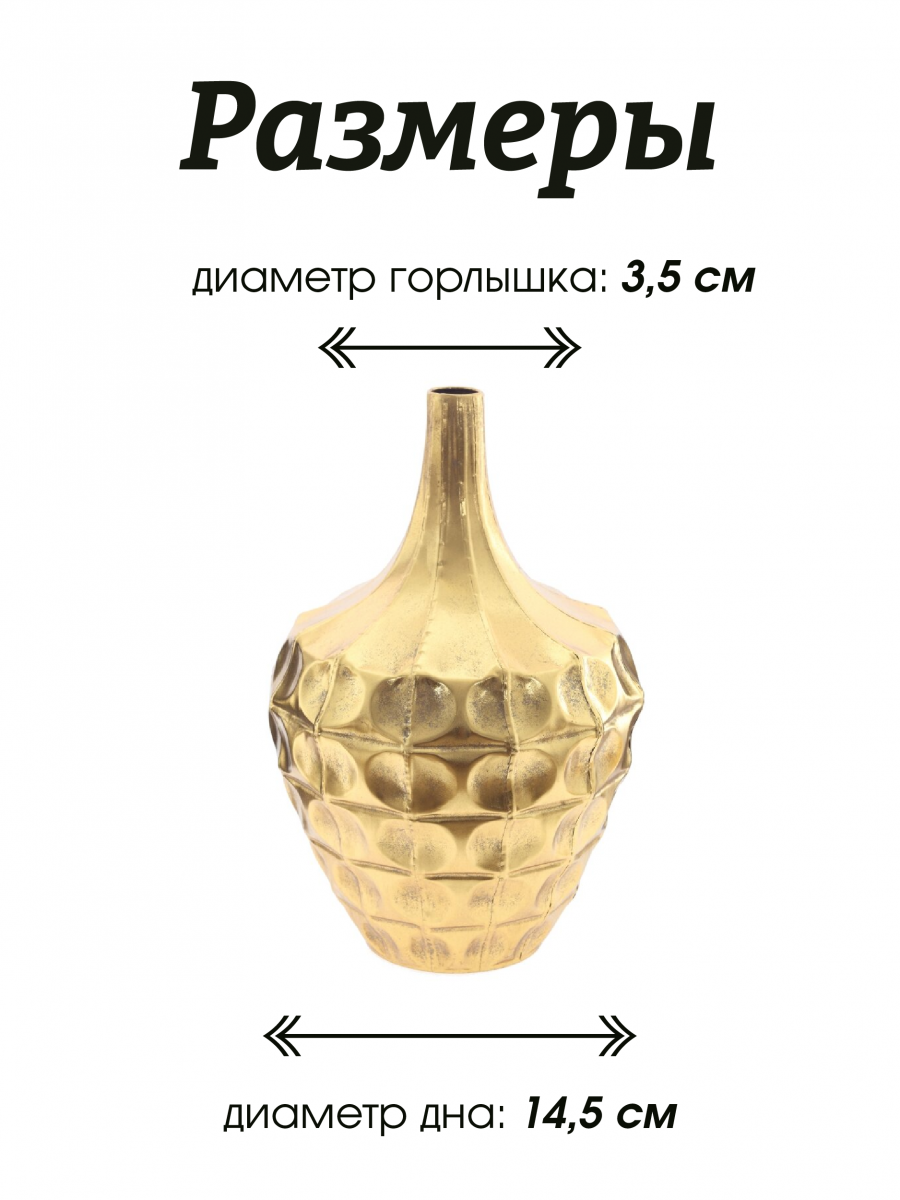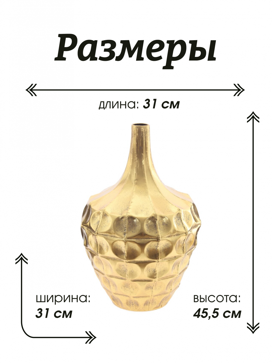 Представляем роскошную напольную металлическую вазу, которая обязательно должна быть у всех любителей цветов! Эта очаровательная ваза высотой 45.5 см и диаметром 31 см - это элегантное и стильное решение для вашего интерьера. Ваза выполнена в стиле ручной работы, швы с элементами точечной спайки. Диаметр горлышка составляет 3,5 см, что идеально подходит для демонстрации ваших любимых искусственных цветов и сухоцветов. Металлическая ваза устойчива за счет собственного веса и ровного плоского дна диаметром 14,5. Ваза в золотом цвете, декорирована рельефной объемной чеканкой. Эта шикарная ваза дополнит любой интерьер в доме или офисе и привнесет в него индивидуальность и шарм. Ее дизайн и благородный цвет добавят изысканности и шика в любое помещение. Для оптимального ухода не забывайте беречь изделие от прямого контакта с водой. Вместо этого просто вытрите пыль сухой тканью, чтобы сохранить первозданную красоту. Такая ваза станет отличным подарком на любой праздник и ни кого не оставит равнодушным.