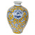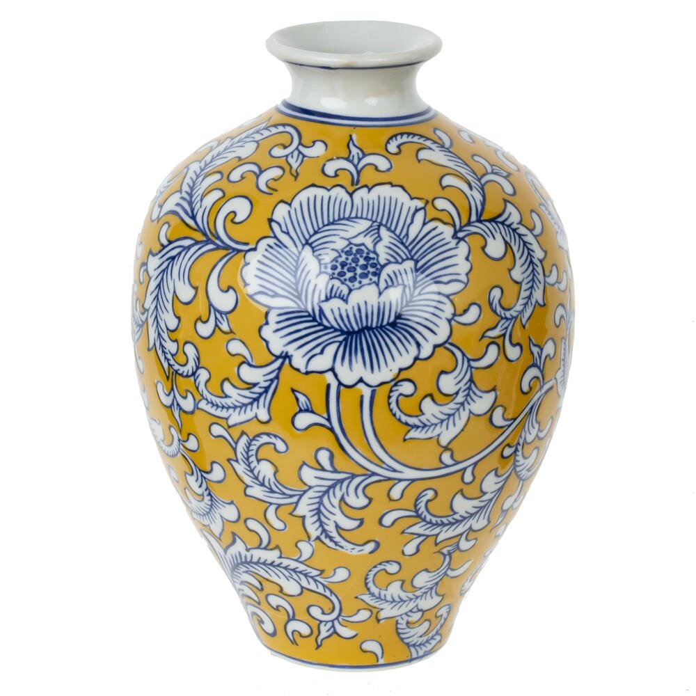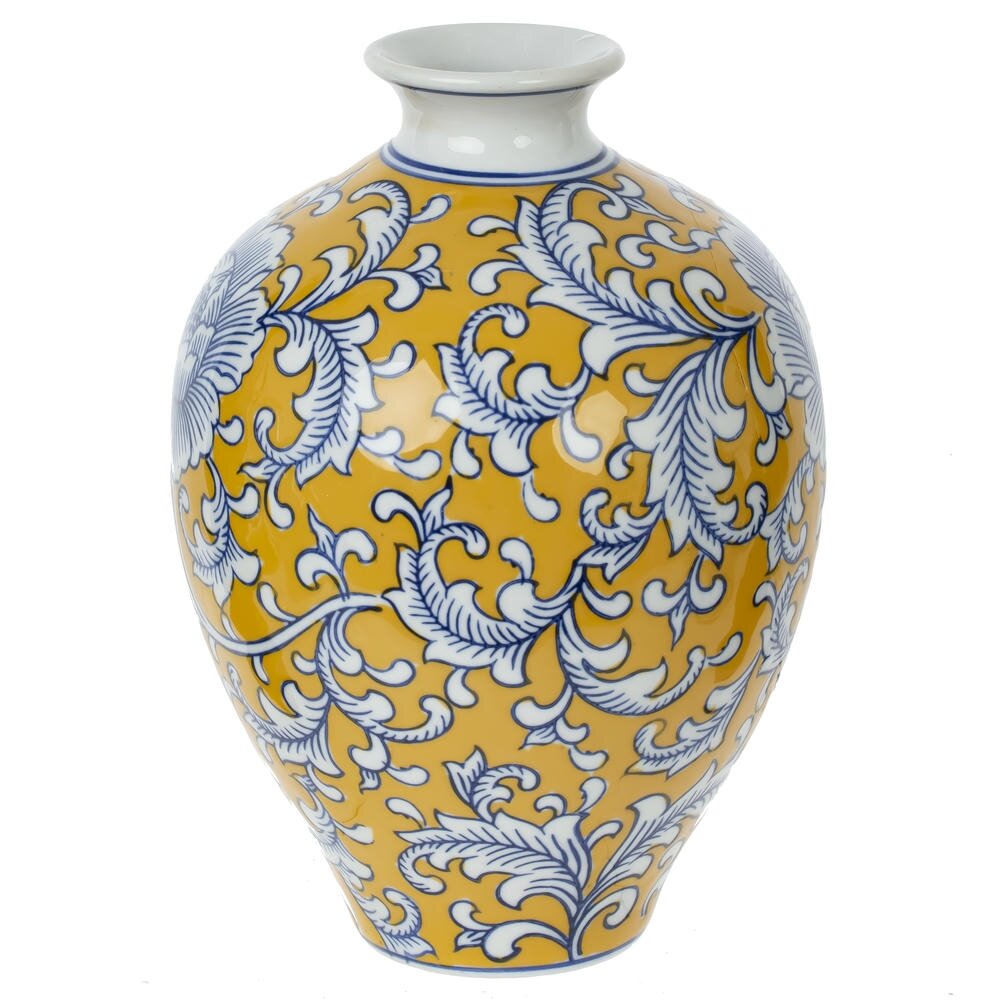 Элегантная декоративная ваза из высококачественного фарфора. Корпус классической округлой формы с плавным переходом к узкому горлышку подчёркивает изящество силуэта. Поверхность покрыта насыщенной жёлтой глазурью и украшена контрастным синим растительным орнаментом с крупными цветами и изящными завитками. Тонкая прорисовка деталей придаёт изделию благородный, почти коллекционный вид. Ваза станет эффектным акцентом в интерьере гостиной, спальни или кабинета, подойдёт как для живых, так и для сухих цветов, а также как самостоятельный декоративный объект или стильный подарок. Диаметр горловины: 3.5 см.