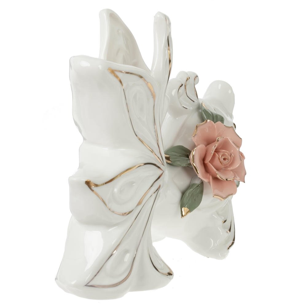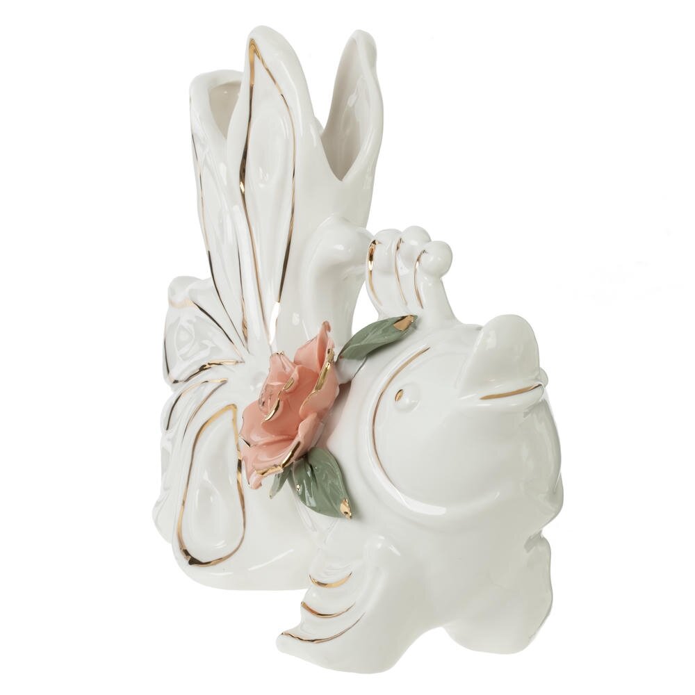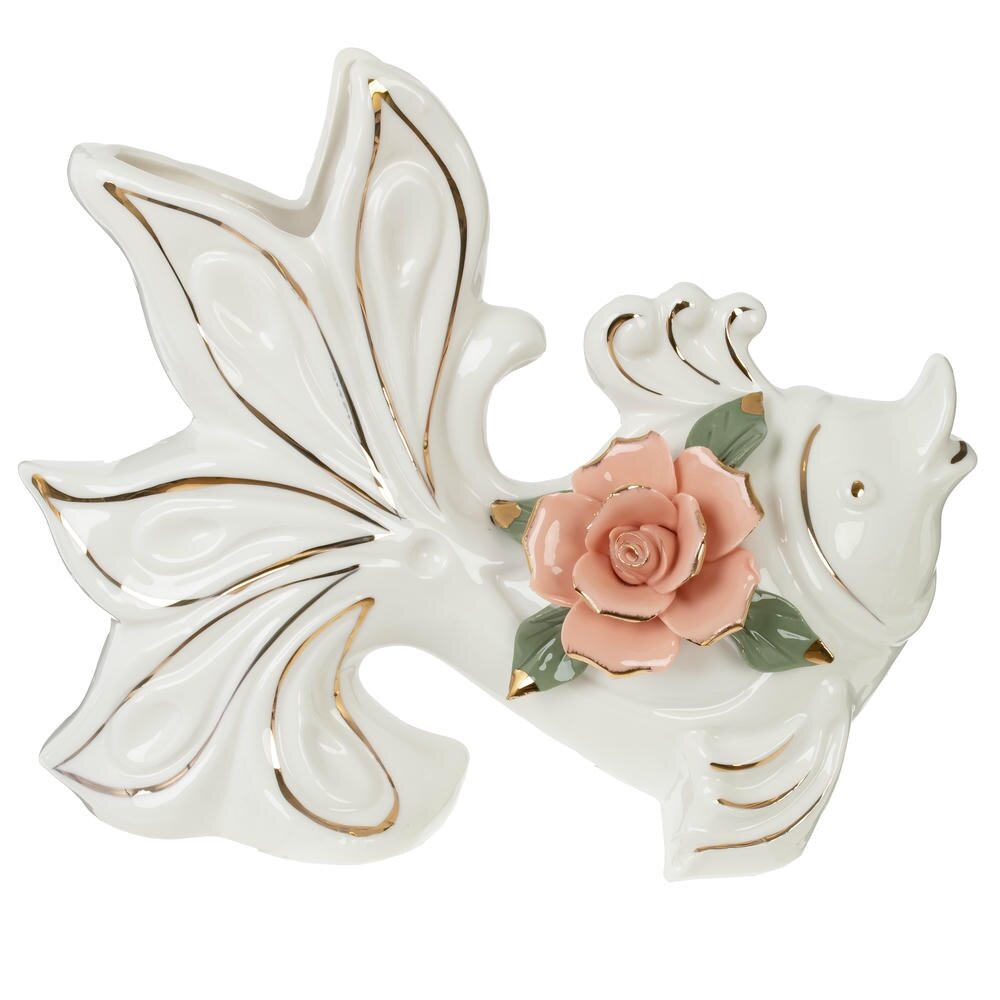 Изящная ваза «Рыба» из высококачественного фарфора станет ярким акцентом любого интерьера. Оригинальная форма в виде стилизованной рыбки с распахнутым хвостом придаёт изделию динамику и лёгкость. Белоснежная поверхность украшена тонкими золотистыми линиями, подчеркивающими контуры и создающими эффект изысканного блеска. На корпусе расположена объёмная фарфоровая роза нежно-розового цвета с зелёными листьями и золотыми штрихами, что добавляет композиции романтичности и делает вазу похожей на небольшое произведение искусства. Объём 450 мл позволяет использовать её как для небольших букетов живых или сухоцветов, так и как самостоятельный декоративный объект на полке, каминной полке или журнальном столике. Отличный вариант подарка для ценителей утончённого декора и коллекционеров фарфора. Размер горловины: 3*8 см.