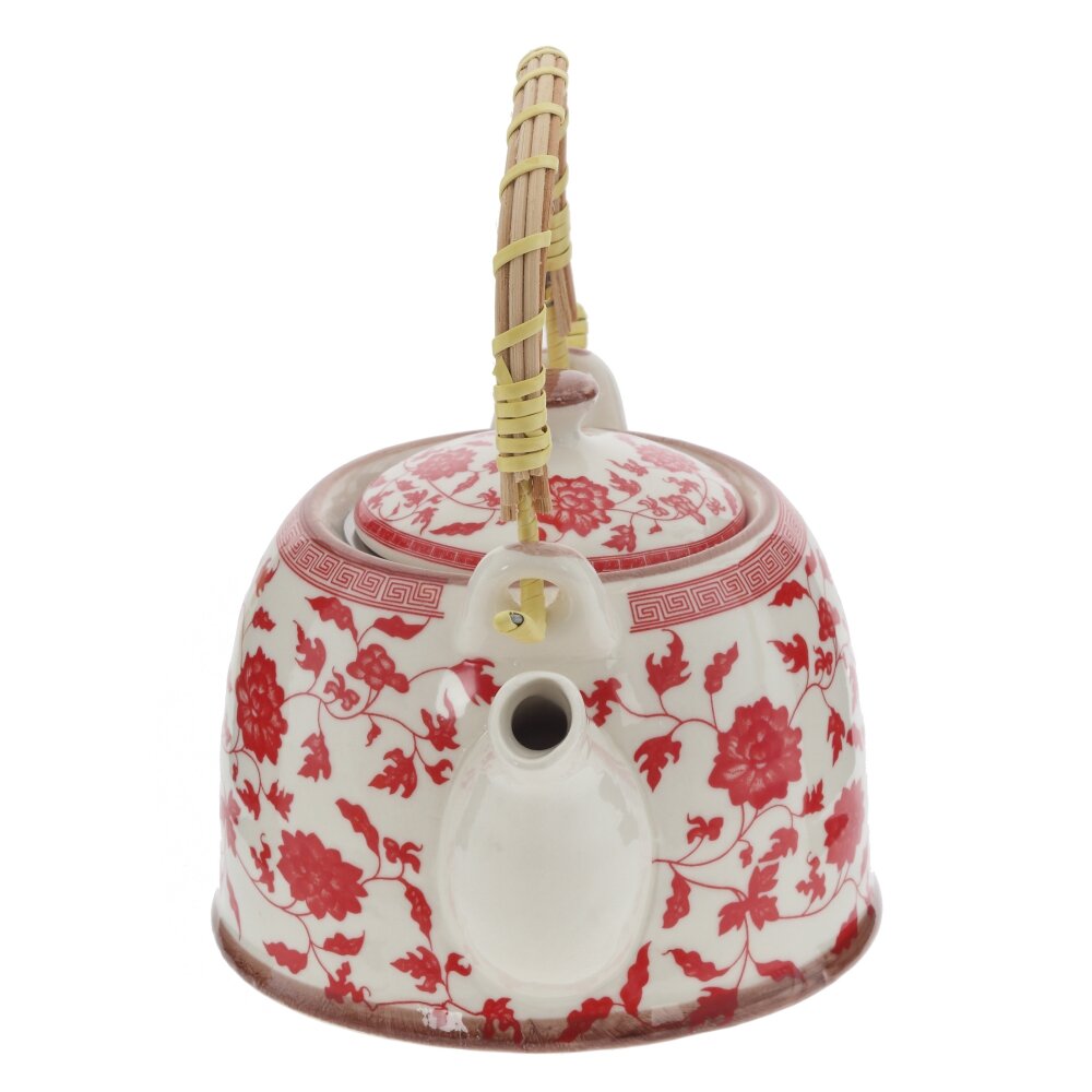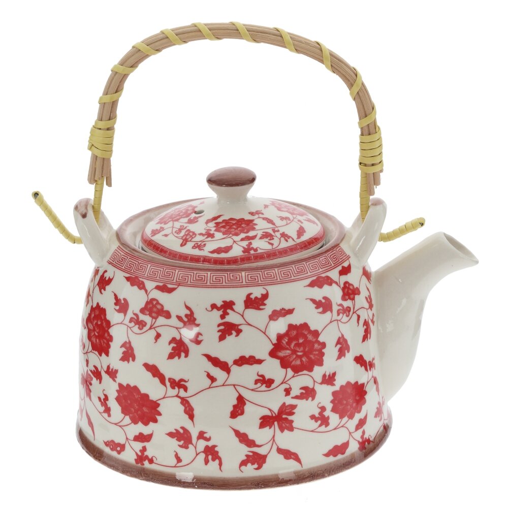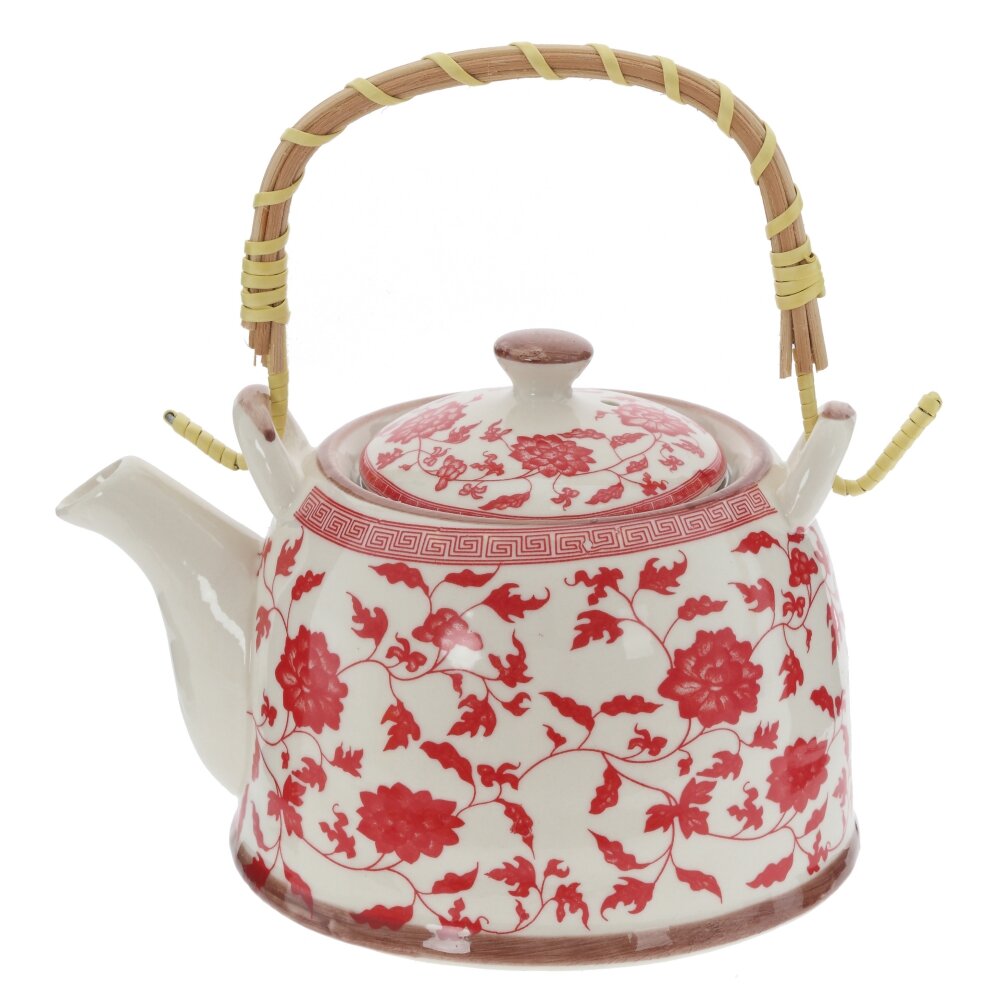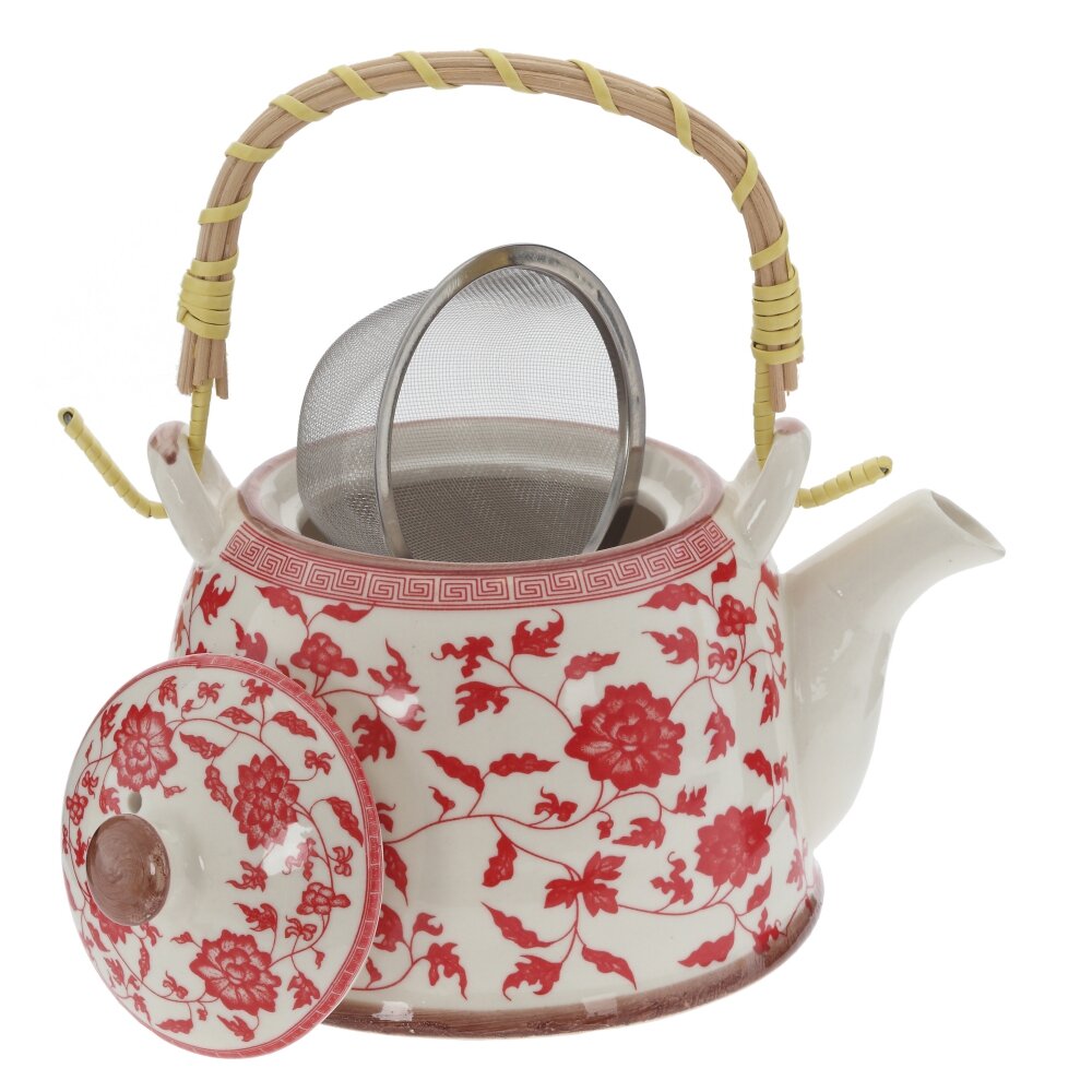 Изящный заварочный чайник объёмом 850 мл станет украшением любого чайного стола. Корпус из прочного фарфора с яркиим цветочным декором создаёт атмосферу уюта и напоминает о традиционных домашний чаепитиях. Внутри предусмотрено съёмное металлическое ситечко?фильтр, которое удобно для заваривания листового чая, травяных и фруктовых смесей: листья не попадают в чашку, напиток получается чистым и ароматным. Крышка плотно прилегает и надёжно фиксируется, сохраняя температуру. Ручка выполнена из дерева и оплетена бамбуком — она не нагревается и обеспечивает комфортный, безопасный хват. Чайник подходит для ежедневного использования и станет отличным подарком ценителям красивой посуды и неторопливых чаепитий.