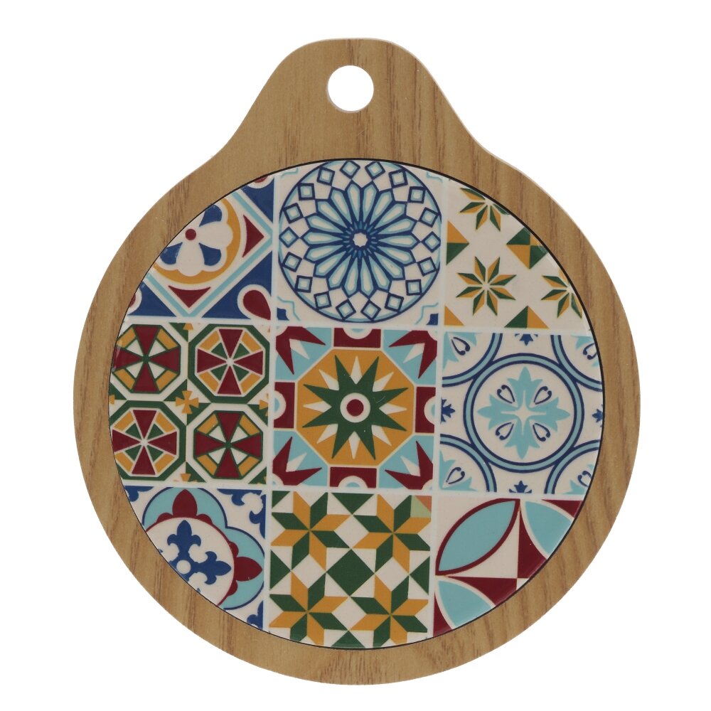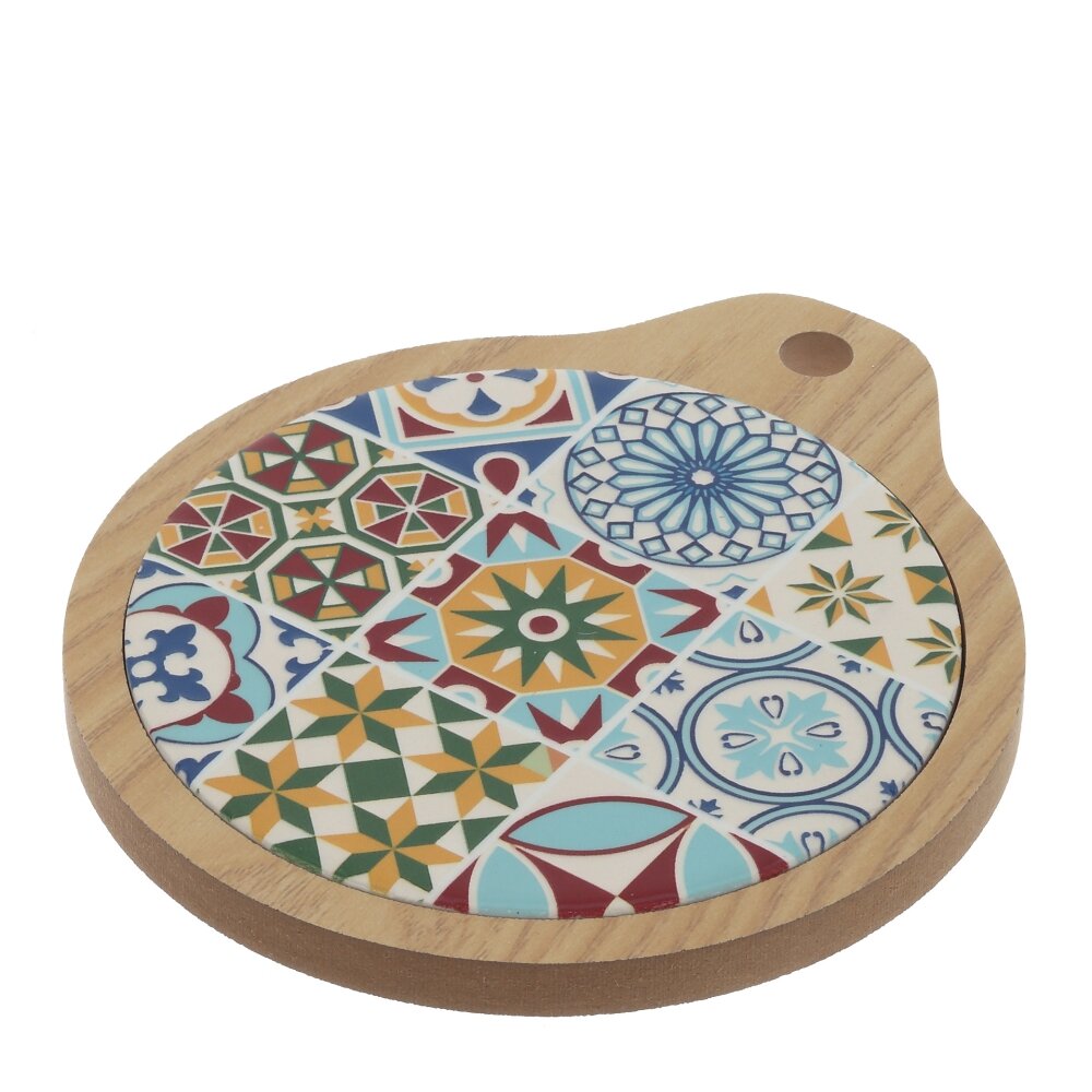 Стильная подставка под горячее из керамики и дерева станет ярким акцентом вашей кухни и надежно защитит поверхность стола от высоких температур. Размер декоративной подставки: длина 12.5 см, ширина 14,5 см, толщина 1 см, вес 156 гр. Круглая основа выполнена из прочного дерева, удобное отверстие позволяет не только использовать подставку для кастрюль, чайников и сковород, но и подвешивать её на крючок как декоративный элемент. Прочная керамическая вставка с многоцветным орнаментом в стиле пэчворк устойчива к нагреву и легко очищается, а деревянная основа придаёт изделию натуральный и уютный вид. Идеально подходит для ежедневного использования и создаёт атмосферу домашнего уюта. Идеально дополняет пасхальный декор и станет приятным подарком родным и друзьям. Подставка под горячее это универсальный и изысканный декор для кухни или загородного дома. Подставка отлично подойдет для пасхального декора или оформления квартиры в стиле рустик. Подставка под горячее это полезный подарок га 8 марта или день рождение. Интерьерная подставка добавит уюта пространству и н кого не оставит равнодушным.