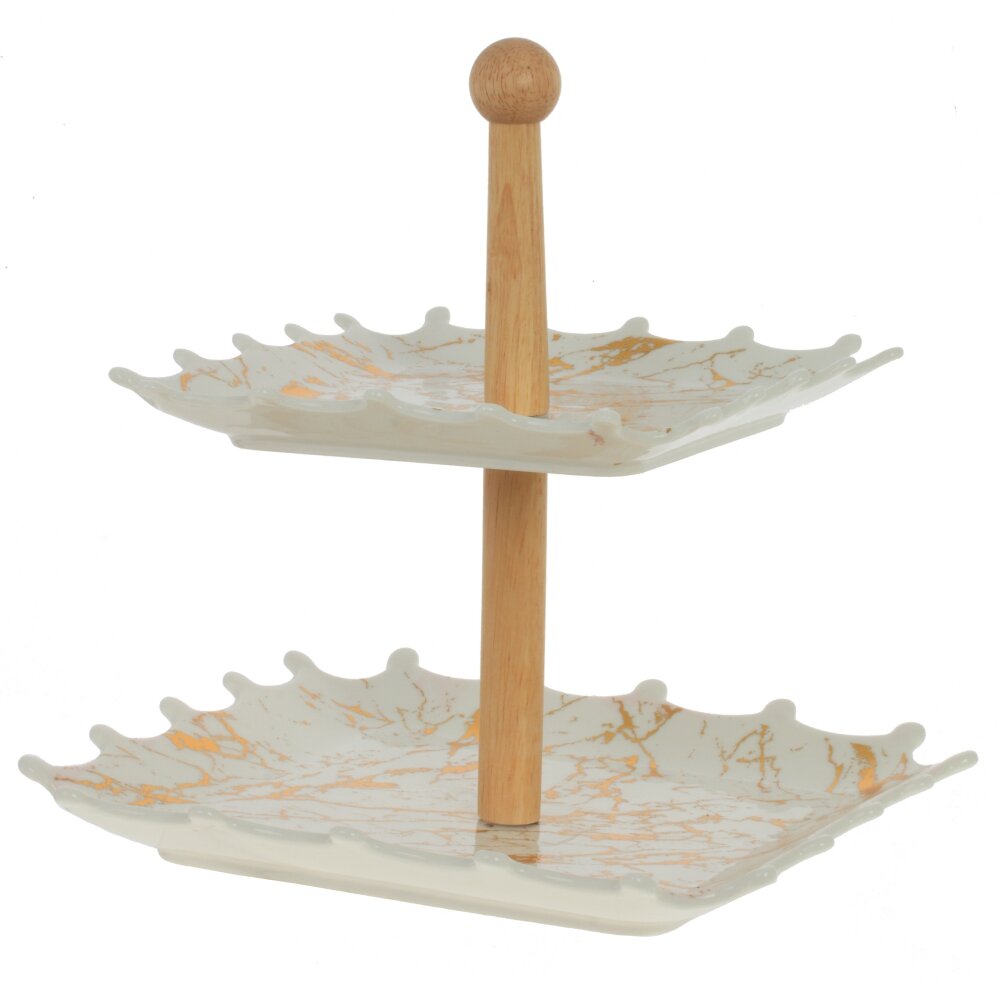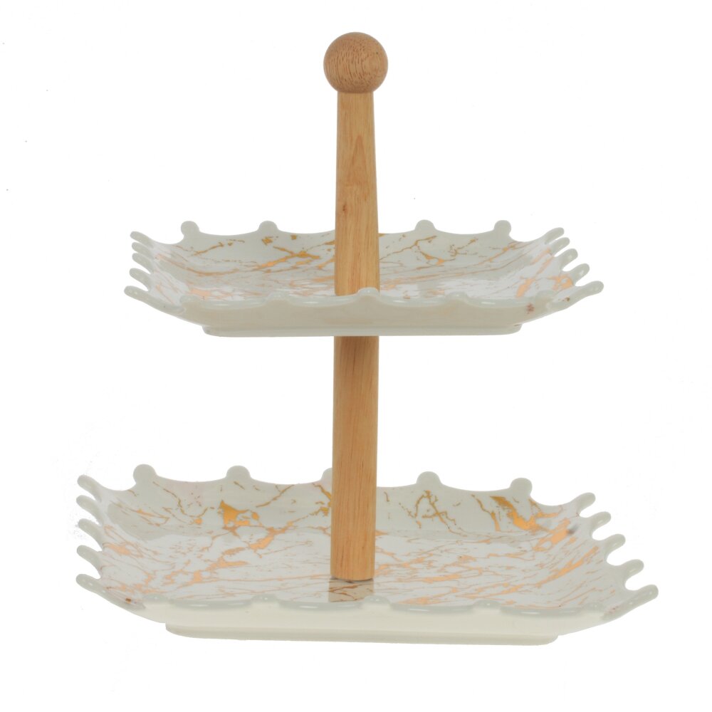 Преподнесите для своих гостей пирожные или фрукты на этой изящной и привлекательной вазе. Две фарфоровые тарелочки, расположенные одна над другой, позволяют создать настоящую композицию из любимых угощений. Такая подставка может стать центральным элементом вашего праздничного стола.