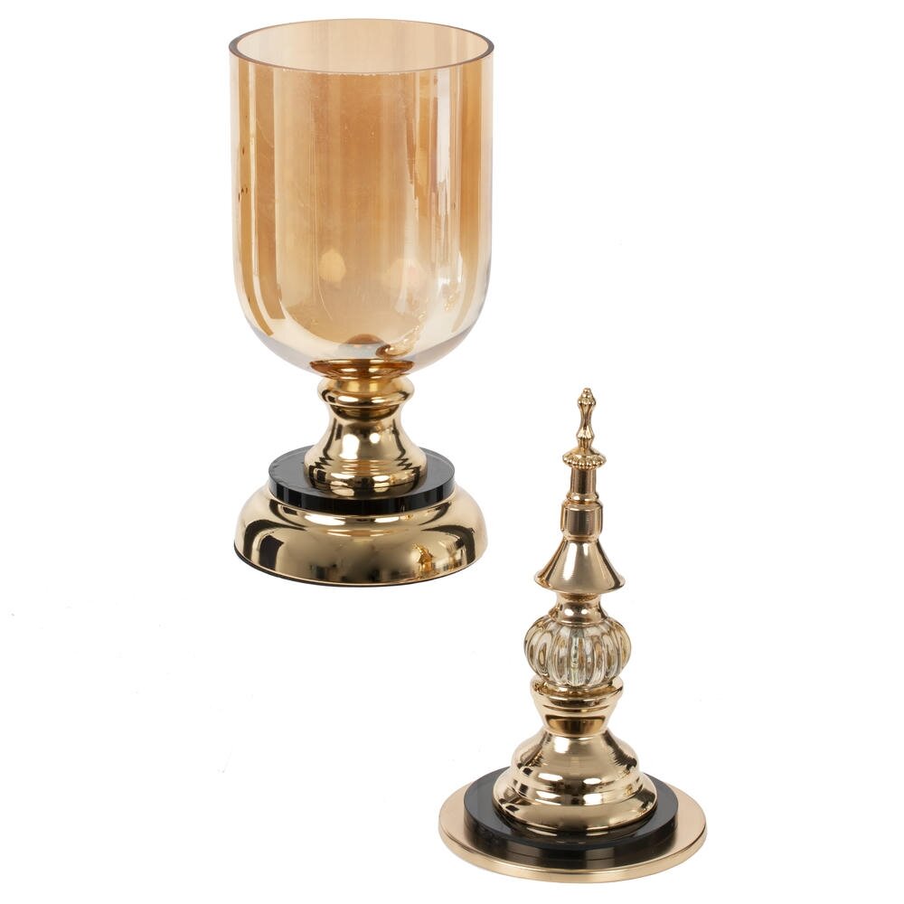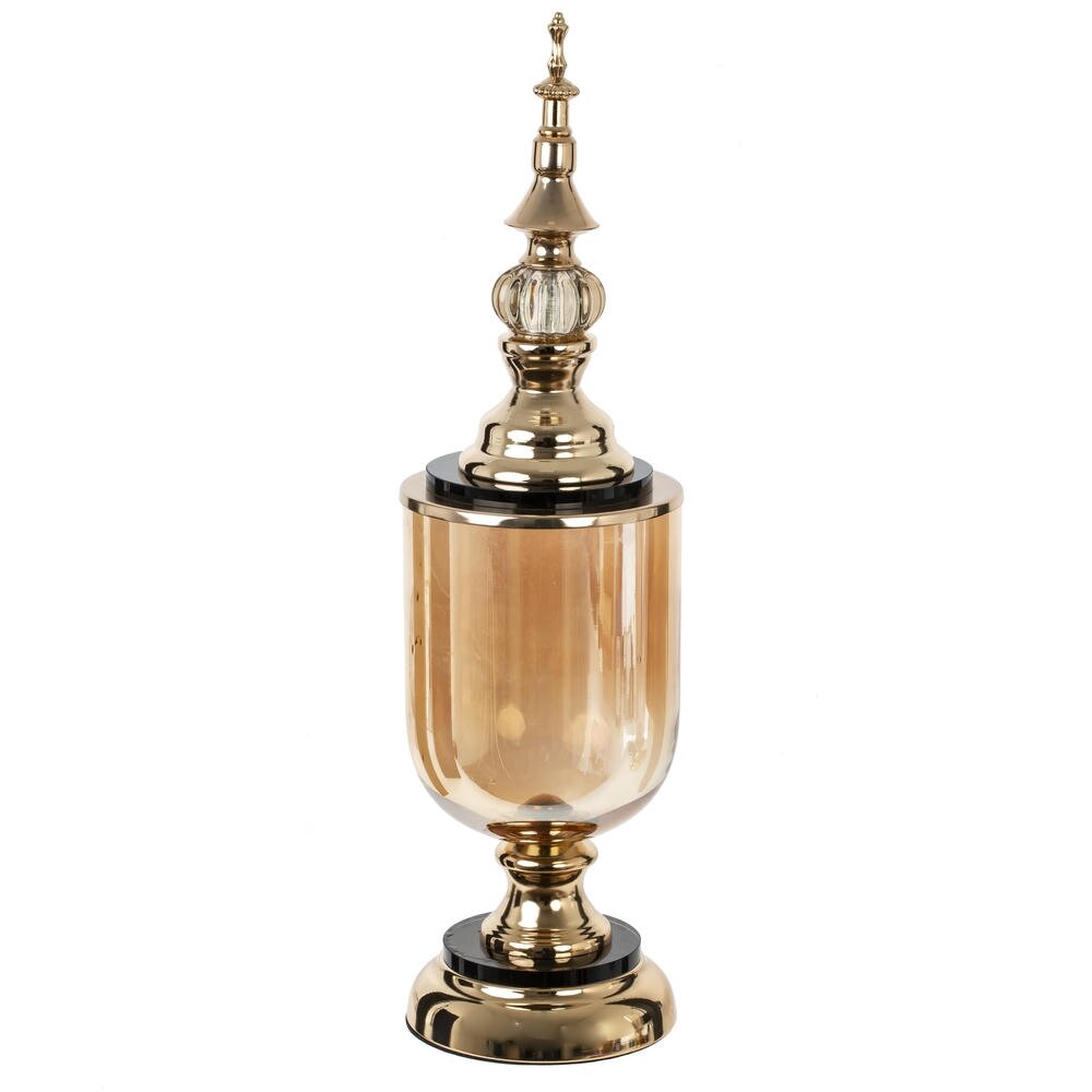 Элегантная ваза?конфетница станет эффектным акцентом в интерьере гостиной, кухни или кабинета. Высокий вытянутый корпус из тонированного стекла гармонично сочетается с металлическим основанием и крышкой благородного золотистого оттенка. Фигурный верх с декоративными элементами придаёт изделию вид старинного сосуда и делает его настоящим украшением стола или комода. Ваза идеально подходит для хранения конфет, печенья, сухофруктов, а также для декорирования – можно наполнить её лепестками, декоративными камнями или гирляндой. Компактный диаметр 12?12 см позволяет удобно разместить изделие даже на небольшой поверхности, а высота 44 см подчёркивает изящество формы и создаёт ощущение роскоши. Прочный металл и качественное стекло обеспечивают долговечность и лёгкость ухода. Такая ваза?конфетница станет удачным подарком и впишется как в классический, так и в современный интерьер.