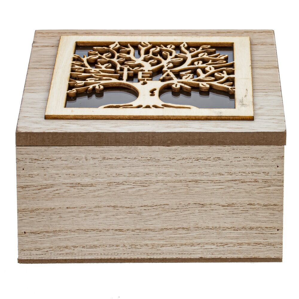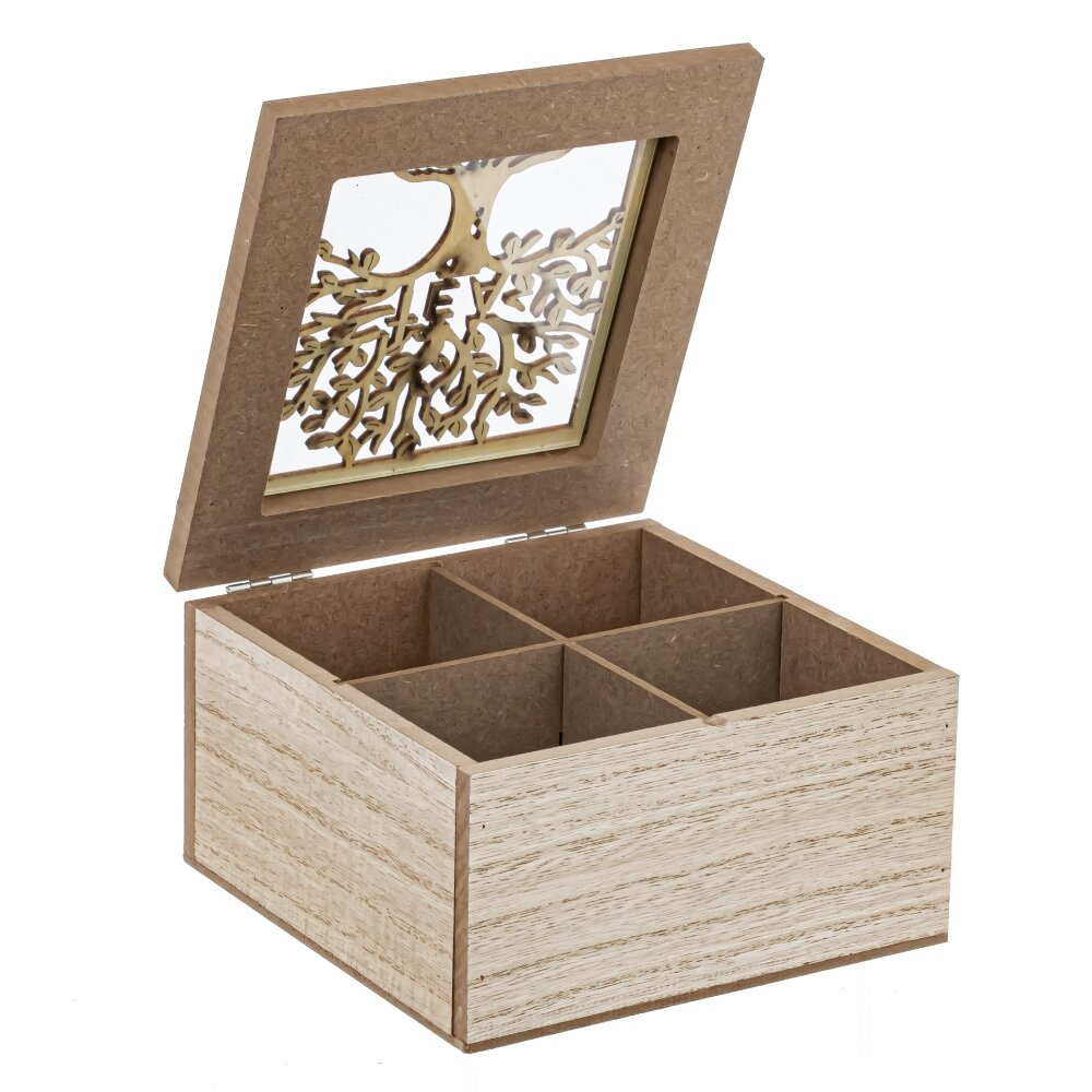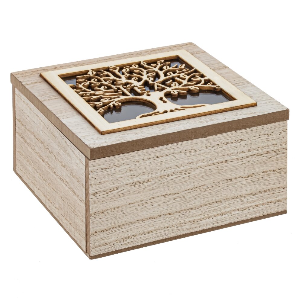 Деревянная шкатулка для чайных пакетиков - это красивый и функциональный предмет, который позволяет хранить и организовывать чайные пакетики. Четыре секции. Крышка из прозрачного стекла с декоративным элементом в виде дерева, что позволяет визуально оценить количество и разнообразие чайных пакетиков, хранящихся внутри, без необходимости открывать ее каждый раз. Компактность позволяет поместить ее на любой кухонной полке или столе, добавляя при этом шарма и элегантности в интерьер.