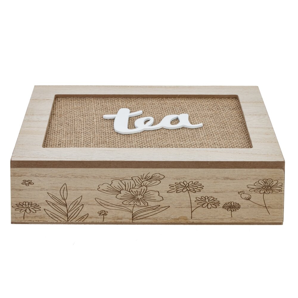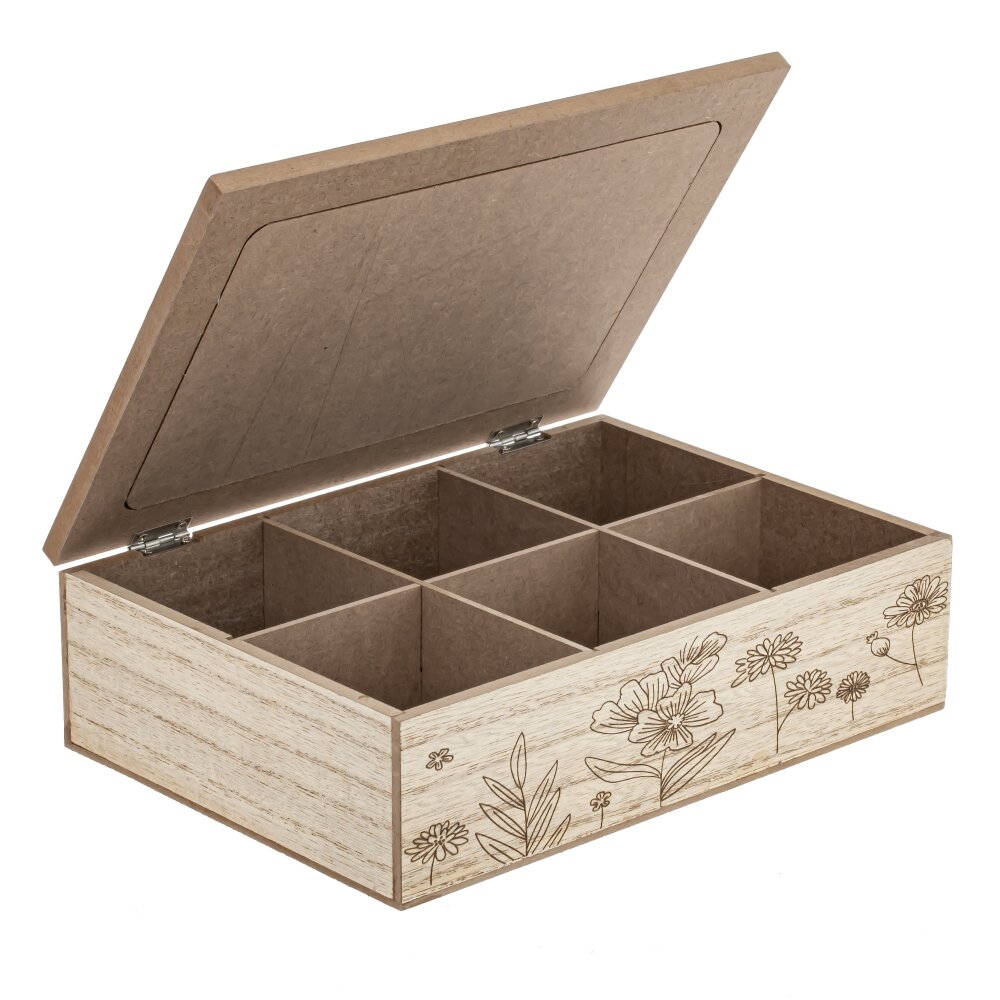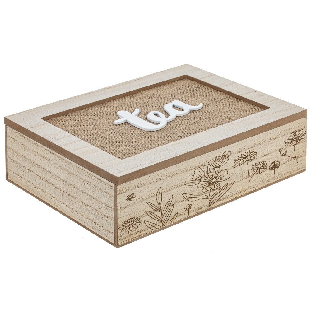 Эта шкатулка для чайных пакетиков – прекрасный и функциональный аксессуар для любителей чая. Изготовлена из дерева, она обеспечит долговечность и надежность использования. Крышка откидная, с объемной надписью "TEA", что придает изделию стильный и запоминающийся внешний вид. Основание украшено растительным декором, который придает шкатулке естественную и натуральную красоту. Внутри шесть отделений, позволяющих удобно разместить чайные пакетики разных видов или ароматов. Этот предмет не только поможет вам организовать и хранить ваши любимые виды чая, но и станет стильным элементом декора вашей кухни или чайной зоны. Идеальное сочетание красоты и функциональности для настоящих ценителей чая.