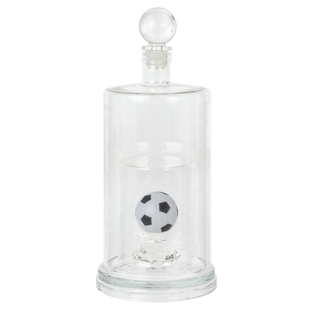 Стильный стеклянный графин объемом 800 мл с цилиндрическим корпусом и массивным дном. Прозрачные стенки открывают эффектный декоративный элемент внутри — миниатюрный мяч в классической черно?белой расцветке, который придает изделию характер и станет темой для разговоров за столом. Верх оснащен гладкой круглой пробкой из стекла, обеспечивающей плотное прилегание и сохранение аромата напитков. Графин удобен для подачи воды, сока, вина или крепких напитков, а благодаря широкому горлышку его легко наполнять и мыть. Универсальный дизайн гармонично впишется в домашний бар, кабинет или на праздничный стол и станет оригинальным подарком любителю футбола и стильной сервировки.