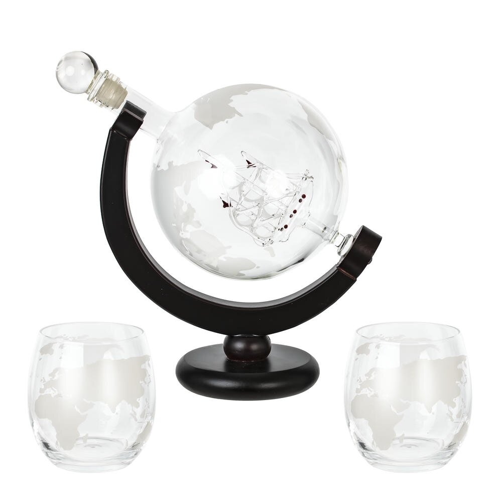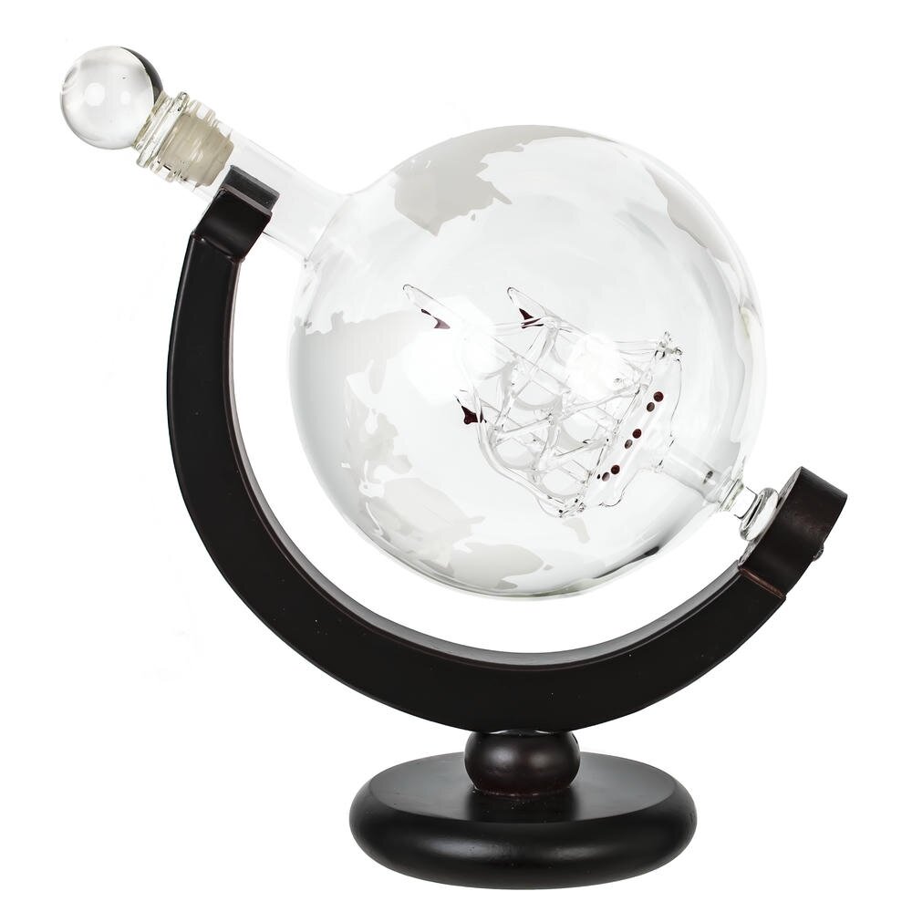 Оригинальный набор для напитков в виде земного шара: графин «Глобус» объёмом 950 мл на устойчивой деревянной подставке и два круглых стакана по 300 мл. Сферический графин выполнен из прозрачного стекла с матовым рисунком континентов и украшен миниатюрным стеклянным кораблём внутри. Герметичная стеклянная пробка с уплотнителем сохраняет аромат виски, коньяка или ликёра. Подставка из тёмного дерева подчёркивает форму глобуса и делает предмет эффектным акцентом на столе или в кабинете. Стаканы повторяют тему карты мира, удобно лежат в руке. Подарочный, элегантный и практичный комплект из стекла и дерева для ценителей путешествий и красивой сервировки.