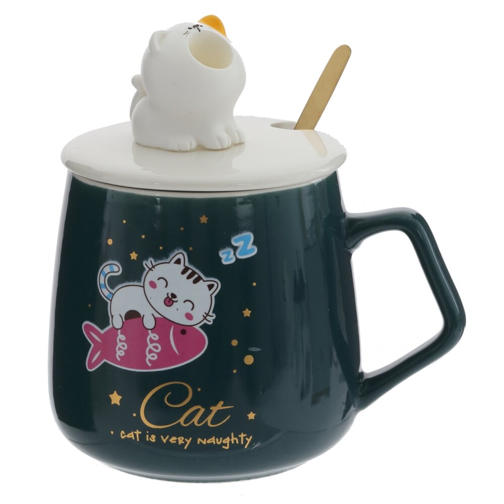 Стильная кружка объёмом 390 мл с крышкой и ложкой — удобный и яркий аксессуар для дома и офиса. Корпус и крышка выполнены из прочного фарфора с глянцевым покрытием и милым принтом с забавным персонажем. Крышка помогает дольше сохранять тепло напитка и защищает его от пыли, а декоративная фигурка делает кружку по?настоящему уникальной. В комплект входит ложка, которую удобно хранить прямо в кружке. Отличный подарок для детей и взрослых, ценящих оригинальные и практичные вещи.