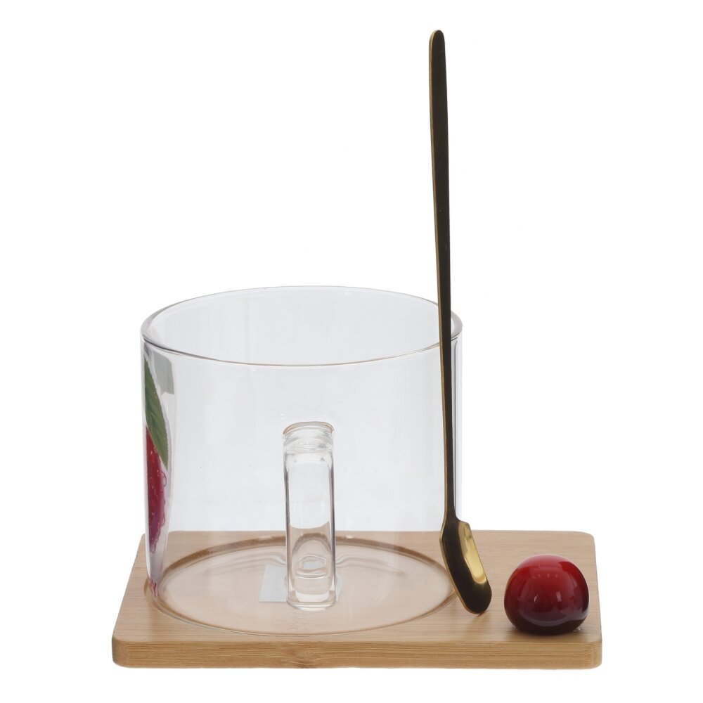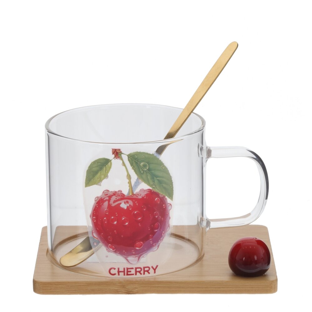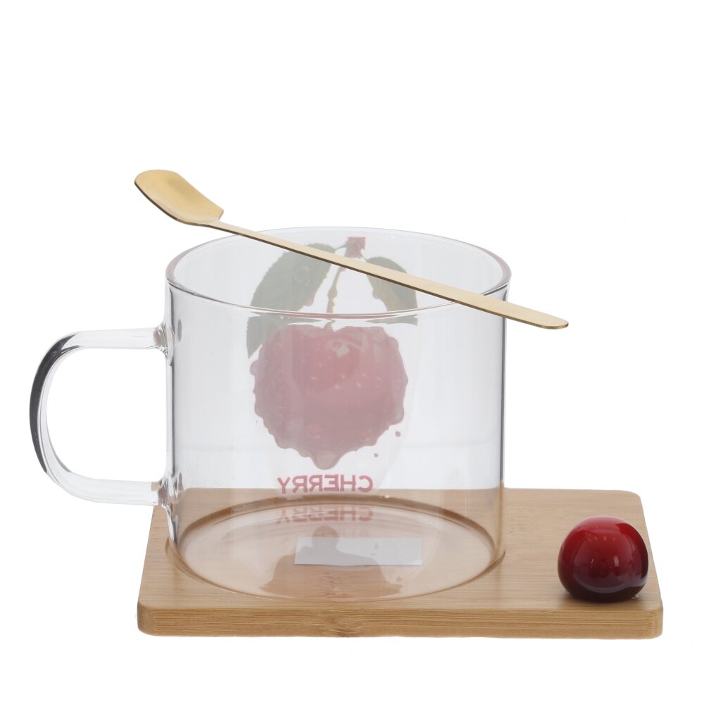 Стильная кружка объёмом 290 мл с ложкой и деревянной подставкой — яркий акцент для вашего стола. Прозрачное стекло украшено сочным изображением вишни и надписью CHERRY, благодаря чему напиток выглядит ещё аппетитнее. Удобная ручка не нагревается, а подставка из гладко обработанного дерева защищает поверхность стола от капель и следов. Ложка из коррозионностойкой стали идеально подходит для размешивания чая, кофе или десертов. Набор практичен в ежедневном использовании и станет отличным подарком для ценителей красивой посуды.